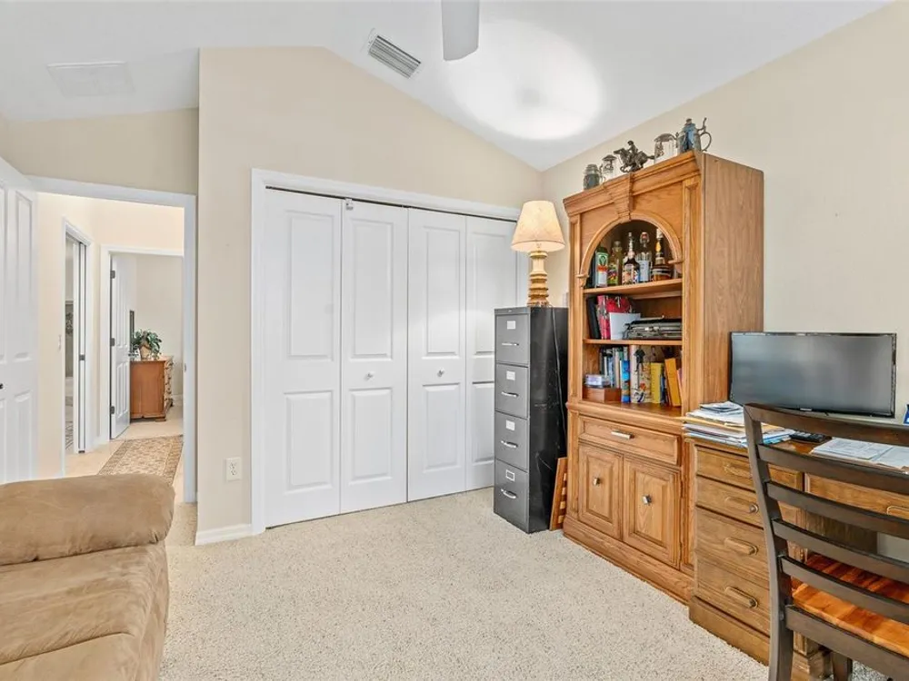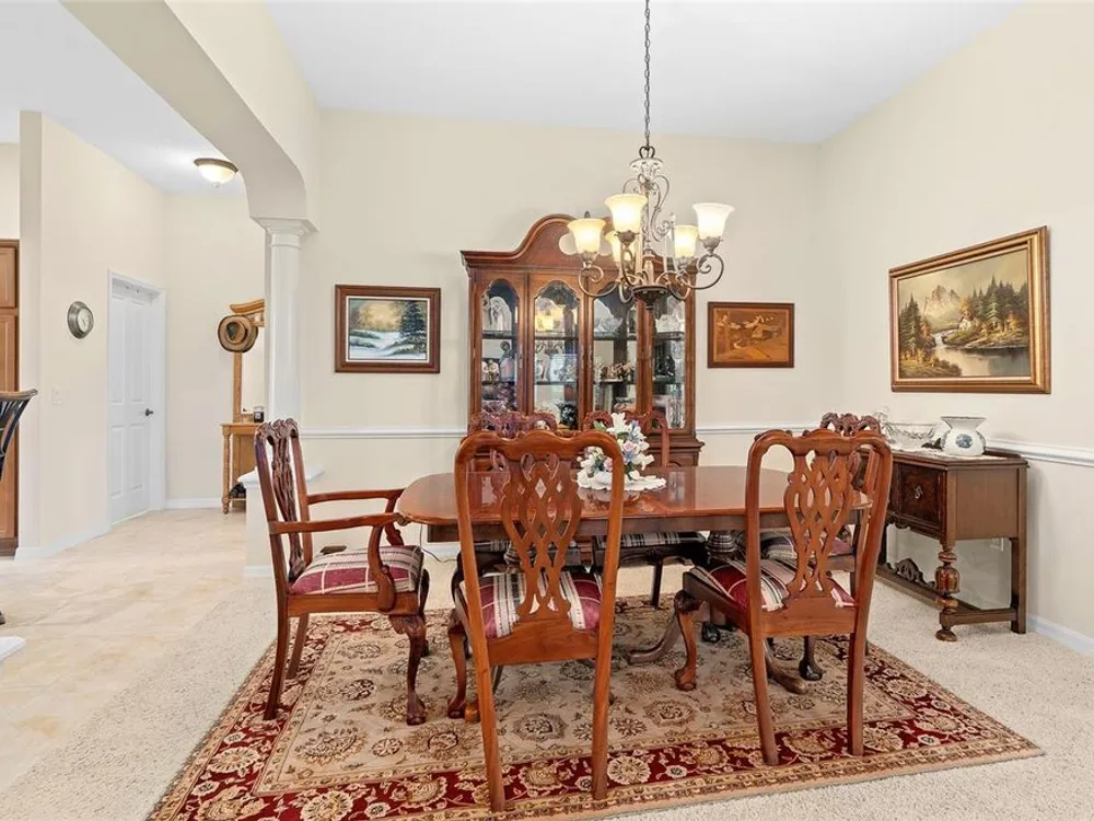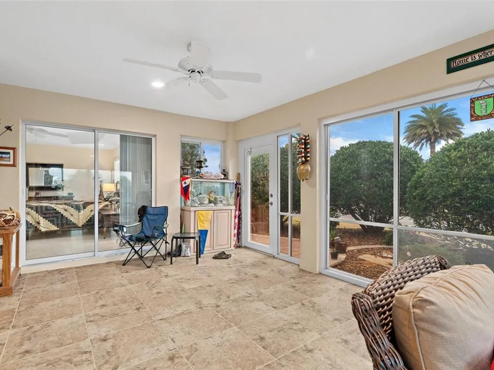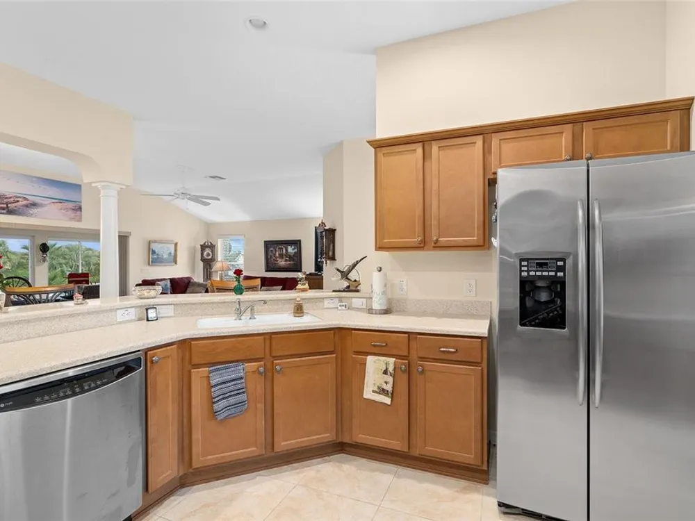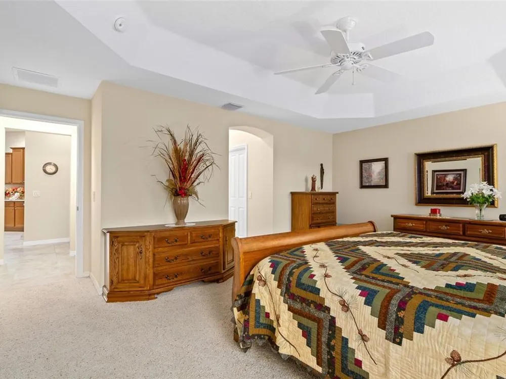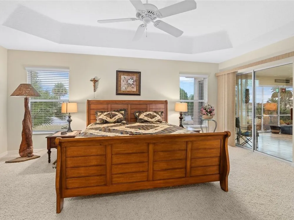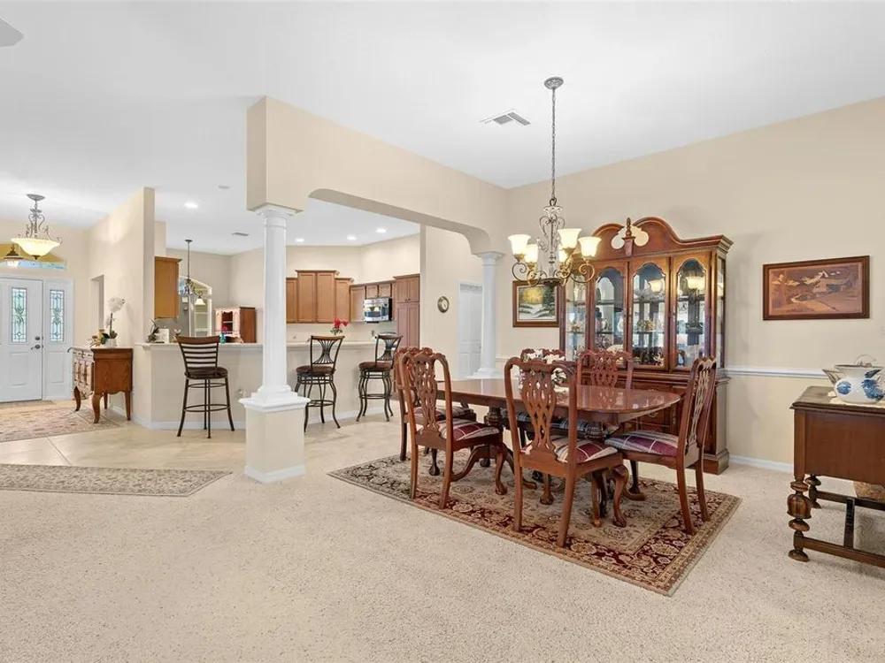 Welcome to the VILLAGE OF HEMINGWAY! This charming GARDENIA MODEL is perfectly situated on a peaceful CUL-DE-SAC and just a short GOLF CART RIDE from LAKE SUMTER LANDING’S SHOPPING AND DINING. Step into a bright interior featuring THREE SPACIOUS BEDROOMS, each with its own closet. The OVERSIZED GARAGE has room for your cars and golf cart, plus you'll love the expansive ACRYLIC ENCLOSED LANAI—ideal for relaxing or entertaining. The kitchen is equipped with STAINLESS STEEL APPLIANCES and CORIAN COUNTERTOPS, seamlessly flowing into the open LIVING AREA with VAULTED CEILINGS. The PRIMARY SUITE is a true getaway, complete with sliders to the lanai and an EN-SUITE BATH. Enjoy a SPLIT FLOOR PLAN for privacy, beautiful MATURE LANDSCAPING, and a PAVED DRIVEWAY that enhances the curb appeal. Additional perks include a brand new ROOF (2024), a 2020 HVAC SYSTEM, and a convenient LAUNDRY ROOM with a washer and dryer. OPTIONAL FURNITURE makes moving in a breeze! With the nearby TRUMAN RECREATION CENTER, COMMUNITY POOLS, multiple GOLF COURSES, scenic walking trails, and vibrant social clubs, this home offers the perfect blend of comfort and convenience.