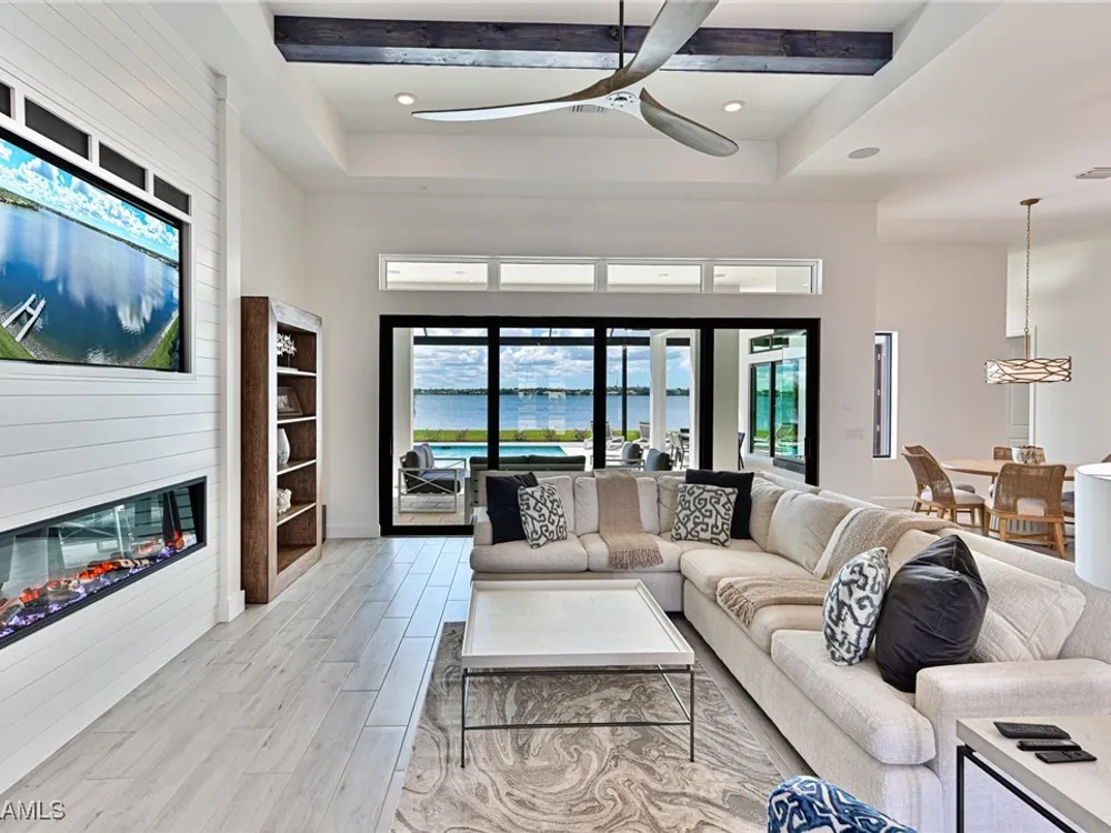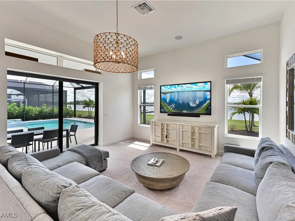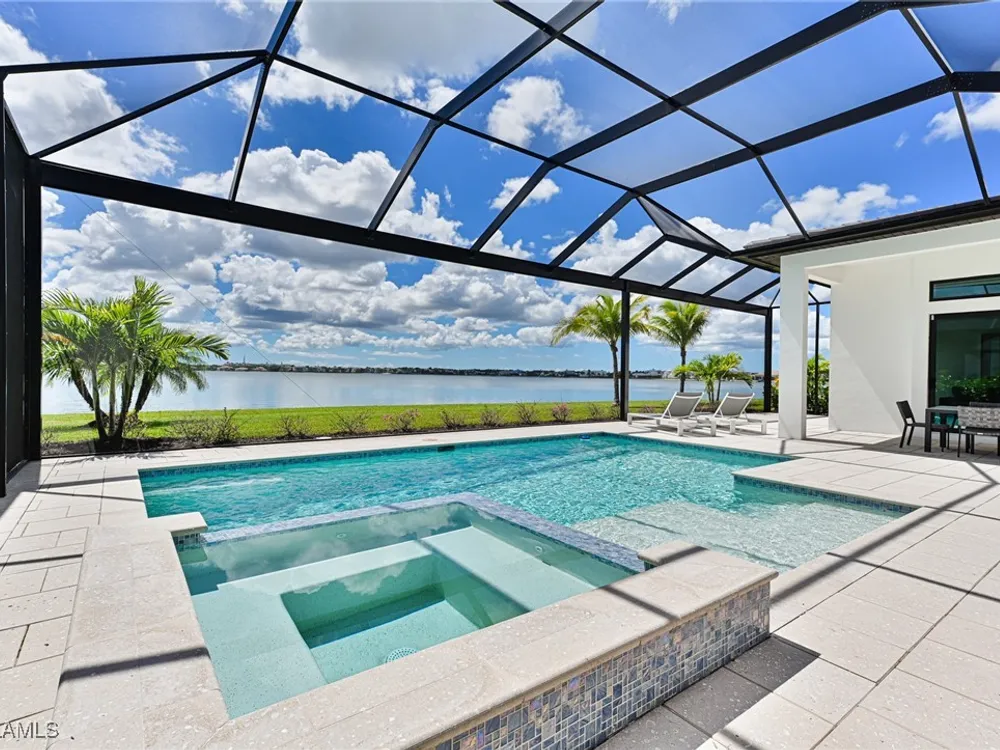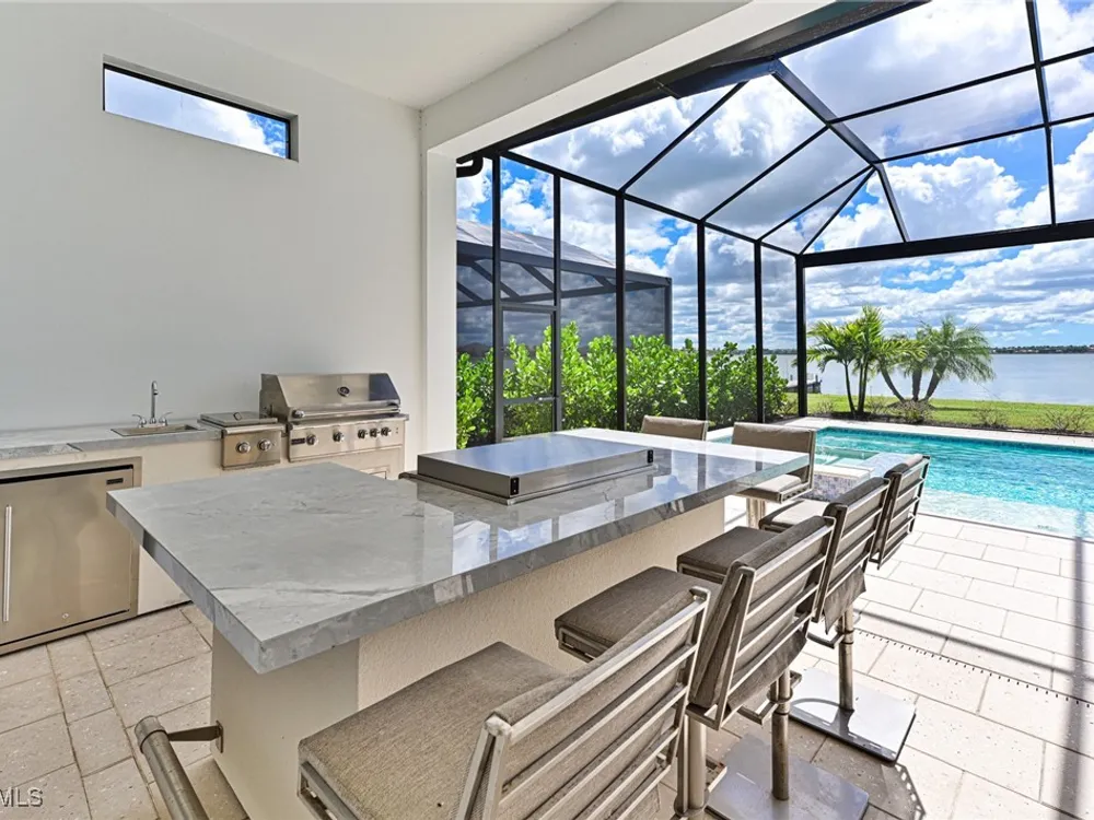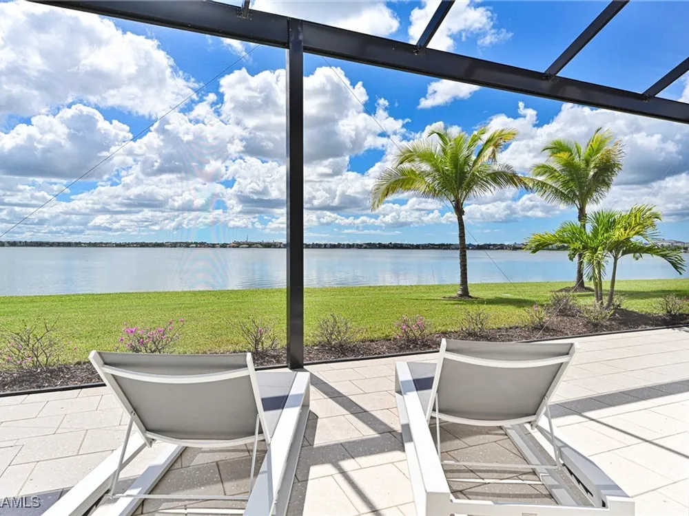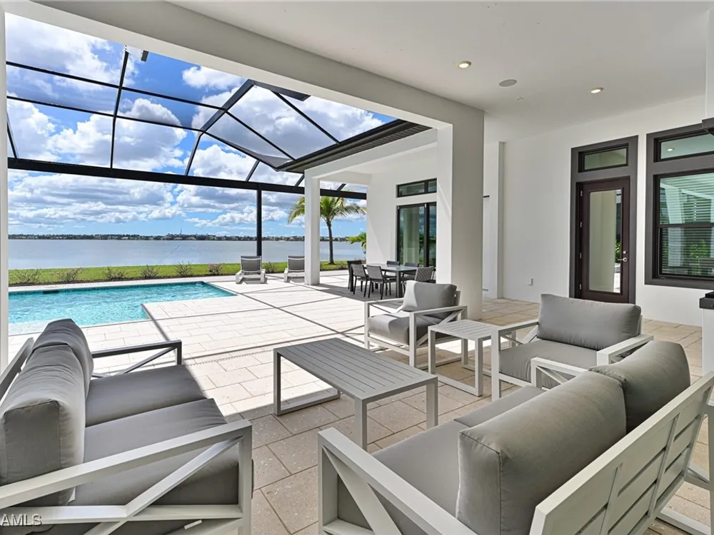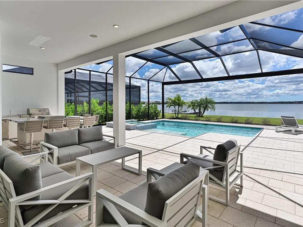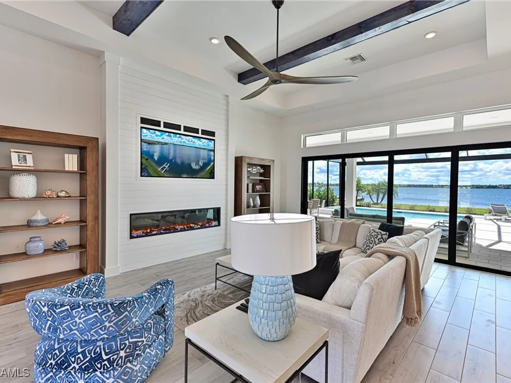 This Esplanade Lake Club home is located on one of the best lots on the widest part of Lake Como and offers everything for perfect for Florida living including: Amazing views from nearly every room in the house, 7,985 square feet of total living area, 4 bedrooms plus den/office, 5 baths, open floor plan, kitchen with gas cooktop, 2 wall ovens, top end appliances, custom cabinetry, quartz countertops, large sit at island and bar/butlers area with beverage and wine refrigerators, great room with fireplace & large screen tv above on a ship lap finished wood wall, great room dining room and kitchen all offer wide views over the oversized screen lanai with pool with sun shelf and spa plus a hibachi sit at bar with grill - full summer kitchen. The den offer a comfortable sectional couch seating & another large screen tv and wide lake views. This home lives on one level as the master suite sits right over the lake is located on the main living level with easy access to the swimming pool & spa. The spa inspired master bath features walk in glass shower, full wall of vanity custom white cabinetry with brushed brass hardware and two sinks and generous master closets. The upper level features a complete second living area with family room, kitchenette, dining area and 3 bedrooms and 3 baths. This home also offers extensive millwork, ceiling details including wood beams, large laundry room, impact windows and doors, flat tile roof with secondary water-resistance, concrete construction and a 3 car garage. Esplanade Lake Club is a 352-acre gated lakefront community on Lake Como where residents enjoy premier amenities including a lakefront beach, Bahama Bar & Grille, fitness center, tennis, pickleball, bocce, dog park, and Up to 23 foot boats are allowed on the Lake. All within minutes of RSW Airport, Gulf Coast Town Center, and world-class shopping and dining. Best of all this home is offered with it’s turnkey designer furniture and furnishings included for immediate closing and move in.