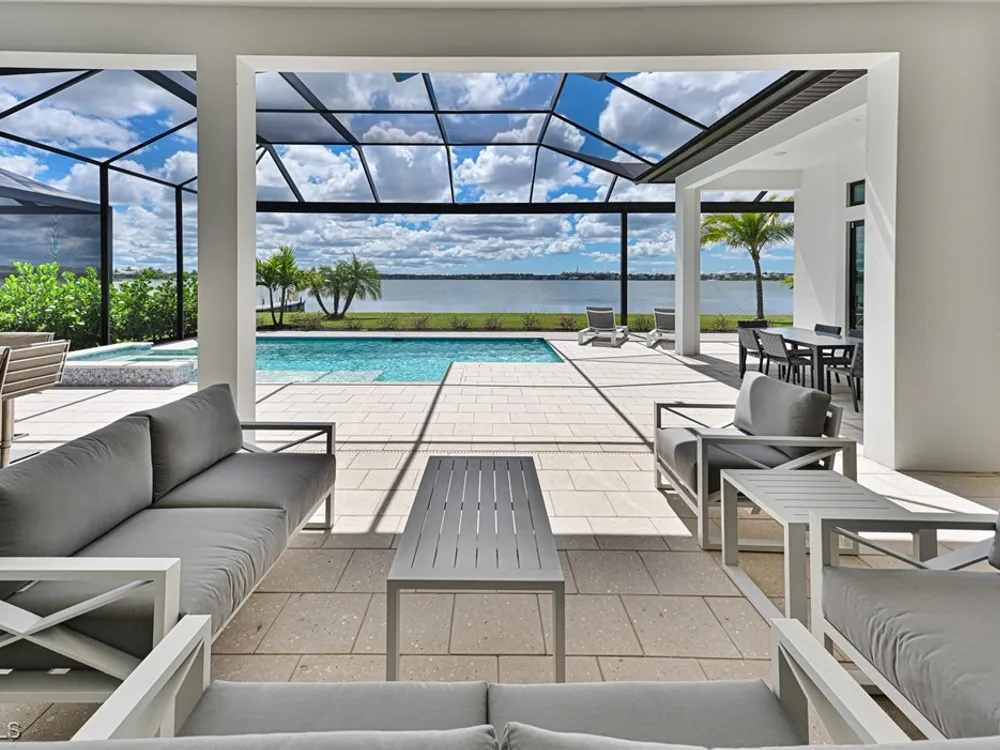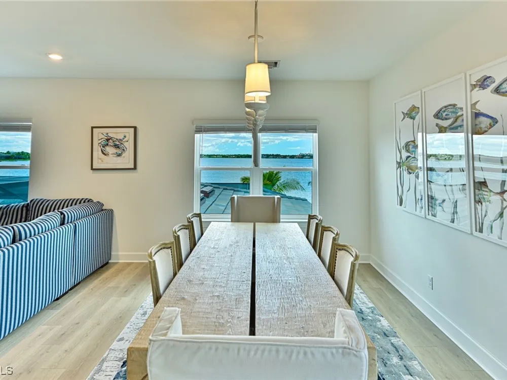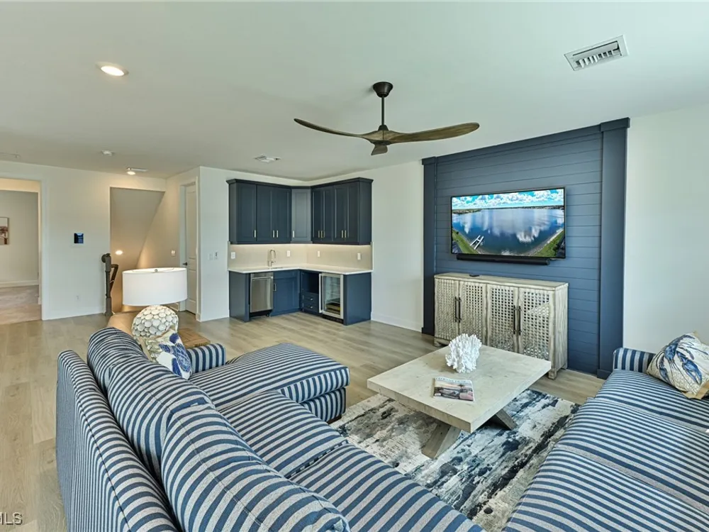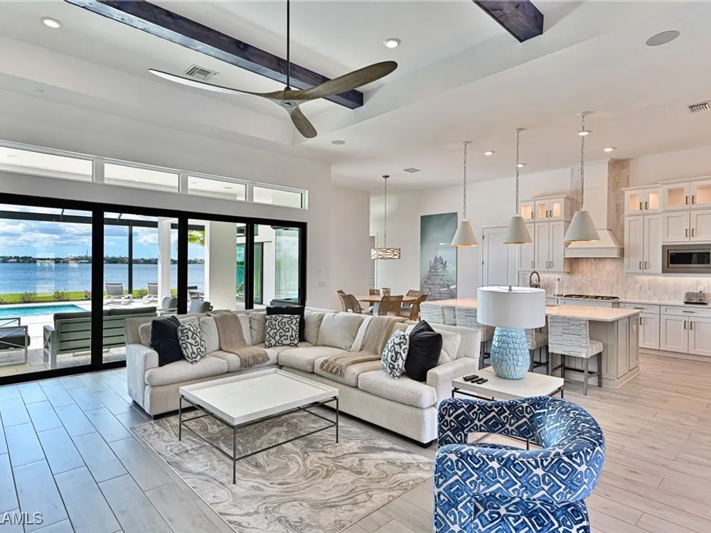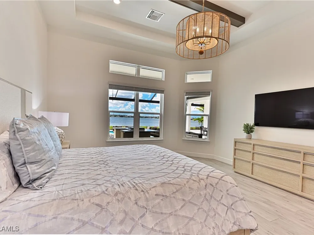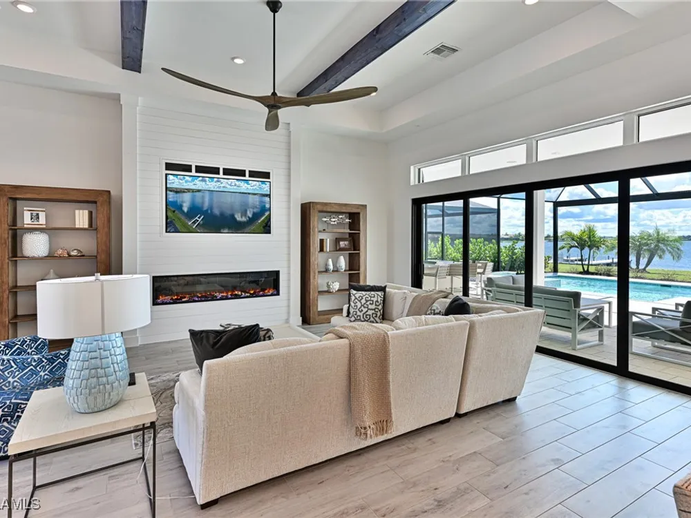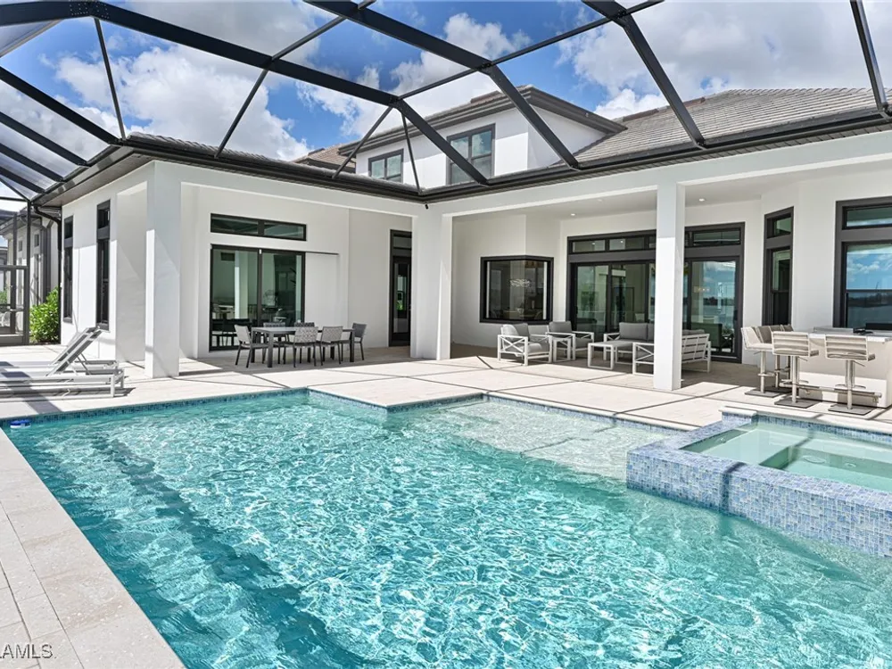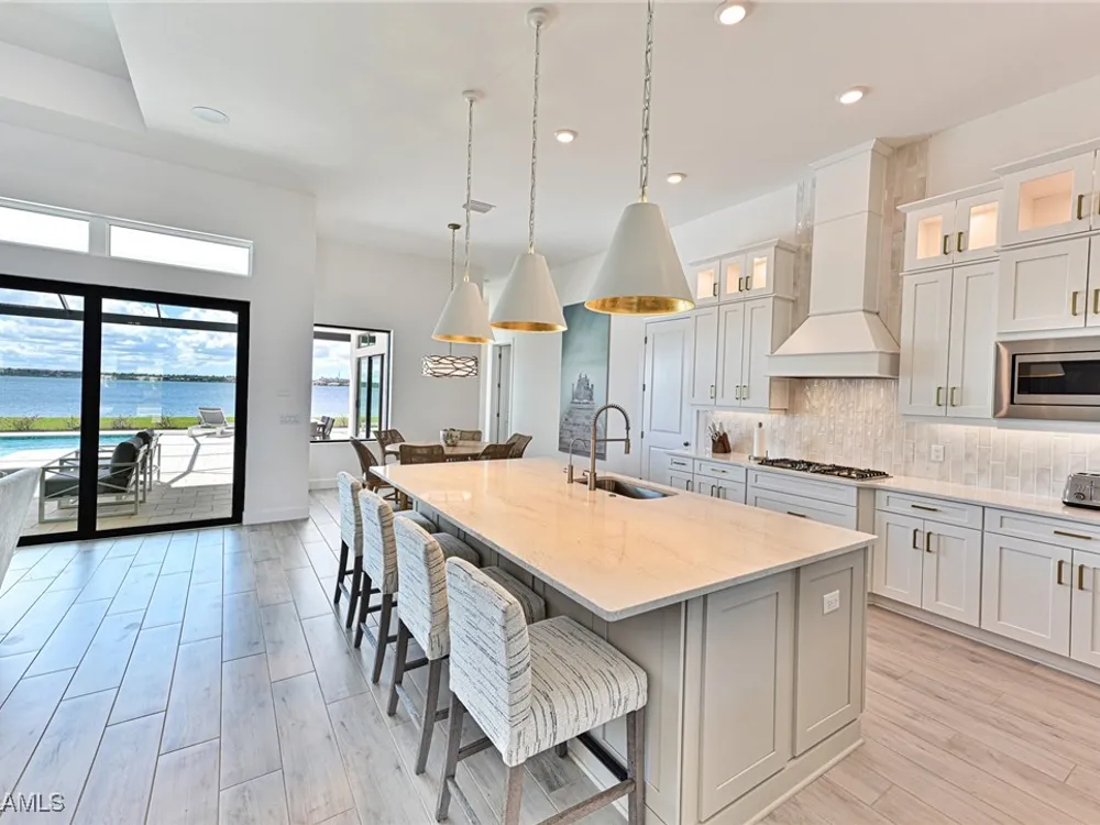 This Esplanade Lake Club home is located on one of the best lots on the widest part of Lake Como and offers everything for perfect for Florida living including: Amazing views from nearly every room in the house, 7,985 square feet of total living area, 4 bedrooms plus den/office, 5 baths, open floor plan, kitchen with gas cooktop, 2 wall ovens, top end appliances, custom cabinetry, quartz countertops, large sit at island and bar/butlers area with beverage and wine refrigerators, great room with fireplace & large screen tv above on a ship lap finished wood wall, great room dining room and kitchen all offer wide views over the oversized screen lanai with pool with sun shelf and spa plus a hibachi sit at bar with grill - full summer kitchen. The den offer a comfortable sectional couch seating & another large screen tv and wide lake views. This home lives on one level as the master suite sits right over the lake is located on the main living level with easy access to the swimming pool & spa. The spa inspired master bath features walk in glass shower, full wall of vanity custom white cabinetry with brushed brass hardware and two sinks and generous master closets. The upper level features a complete second living area with family room, kitchenette, dining area and 3 bedrooms and 3 baths. This home also offers extensive millwork, ceiling details including wood beams, large laundry room, impact windows and doors, flat tile roof with secondary water-resistance, concrete construction and a 3 car garage. Esplanade Lake Club is a 352-acre gated lakefront community on Lake Como where residents enjoy premier amenities including a lakefront beach, Bahama Bar & Grille, fitness center, tennis, pickleball, bocce, dog park, and Up to 23 foot boats are allowed on the Lake. All within minutes of RSW Airport, Gulf Coast Town Center, and world-class shopping and dining. Best of all this home is offered with it’s turnkey designer furniture and furnishings included for immediate closing and move in.