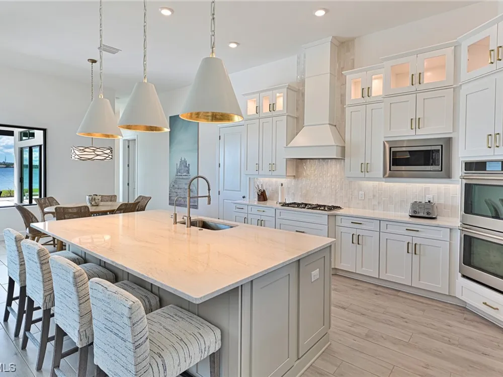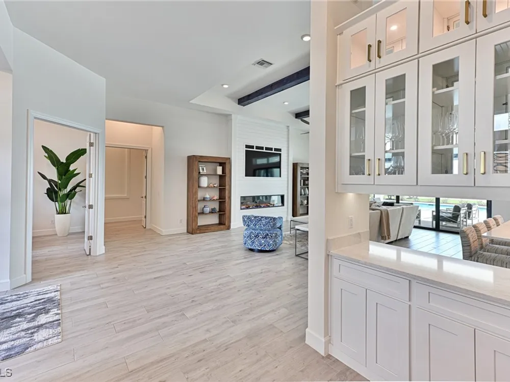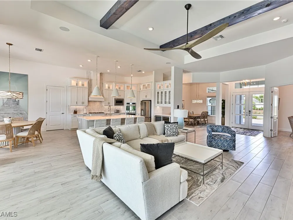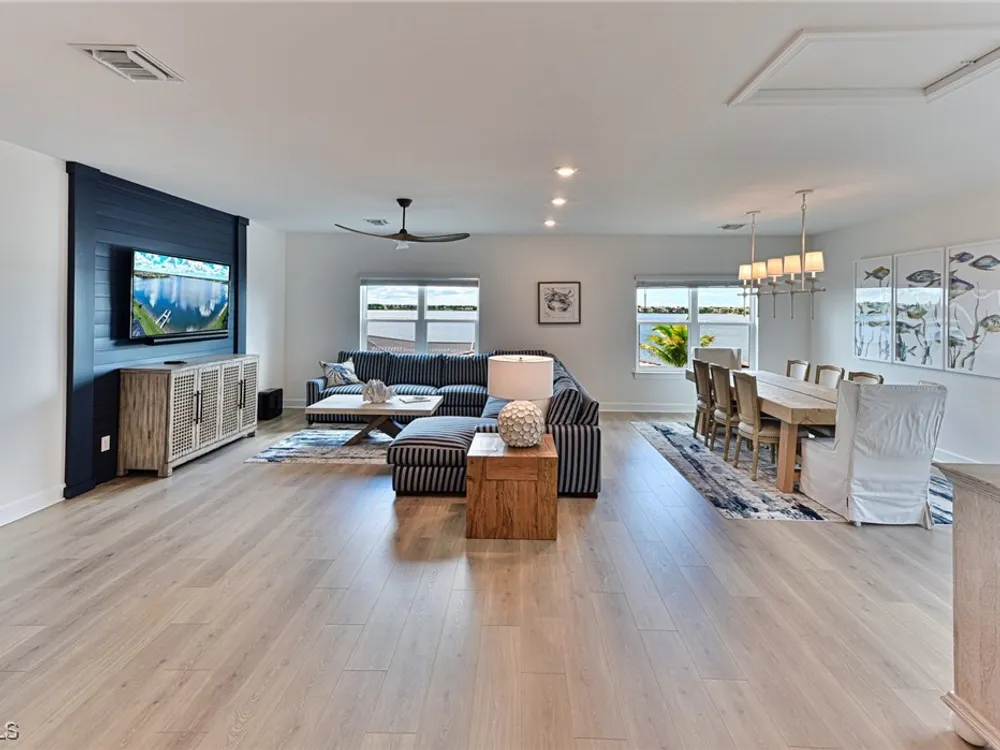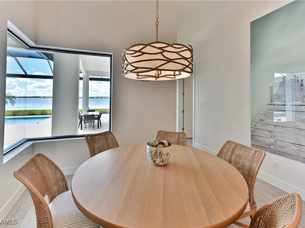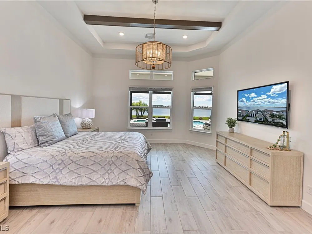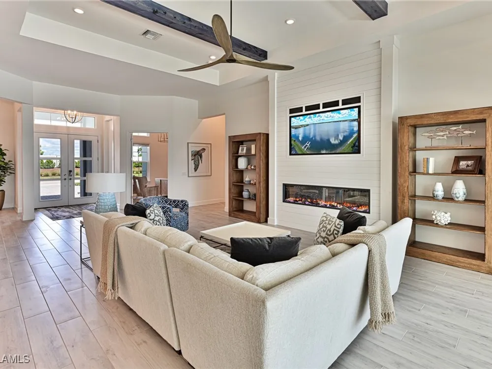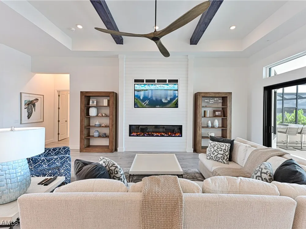This Esplanade Lake Club home is located on one of the best lots on the widest part of Lake Como and offers everything for perfect for Florida living including: Amazing views from nearly every room in the house, 7,985 square feet of total living area, 4 bedrooms plus den/office, 5 baths, open floor plan, kitchen with gas cooktop, 2 wall ovens, top end appliances, custom cabinetry, quartz countertops, large sit at island and bar/butlers area with beverage and wine refrigerators, great room with fireplace & large screen tv above on a ship lap finished wood wall, great room dining room and kitchen all offer wide views over the oversized screen lanai with pool with sun shelf and spa plus a hibachi sit at bar with grill - full summer kitchen. The den offer a comfortable sectional couch seating & another large screen tv and wide lake views. This home lives on one level as the master suite sits right over the lake is located on the main living level with easy access to the swimming pool & spa. The spa inspired master bath features walk in glass shower, full wall of vanity custom white cabinetry with brushed brass hardware and two sinks and generous master closets. The upper level features a complete second living area with family room, kitchenette, dining area and 3 bedrooms and 3 baths. This home also offers extensive millwork, ceiling details including wood beams, large laundry room, impact windows and doors, flat tile roof with secondary water-resistance, concrete construction and a 3 car garage. Esplanade Lake Club is a 352-acre gated lakefront community on Lake Como where residents enjoy premier amenities including a lakefront beach, Bahama Bar & Grille, fitness center, tennis, pickleball, bocce, dog park, and Up to 23 foot boats are allowed on the Lake. All within minutes of RSW Airport, Gulf Coast Town Center, and world-class shopping and dining. Best of all this home is offered with it’s turnkey designer furniture and furnishings included for immediate closing and move in.