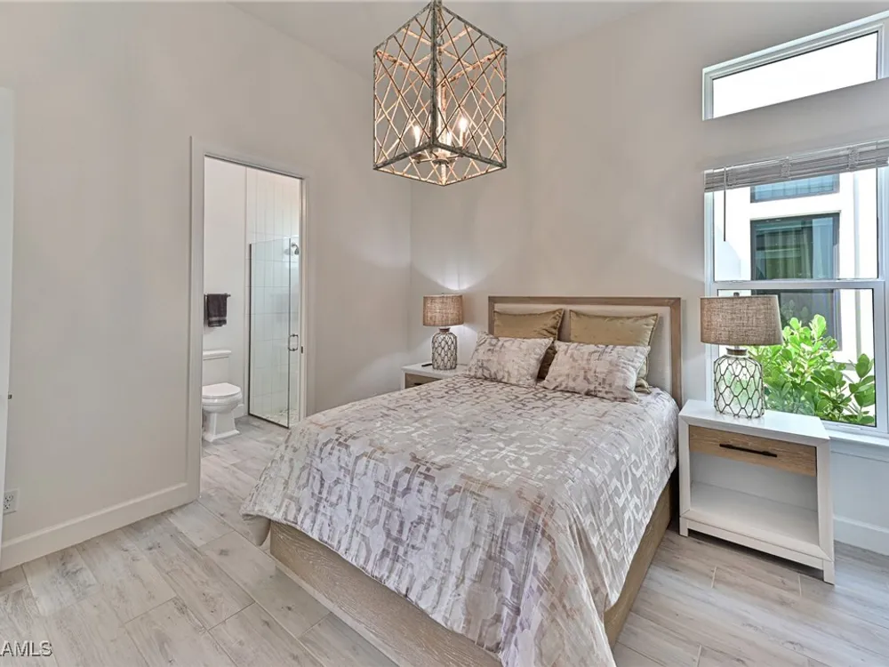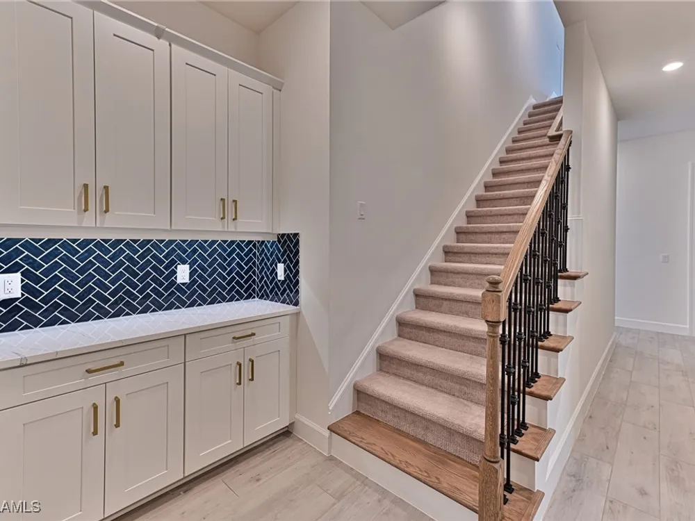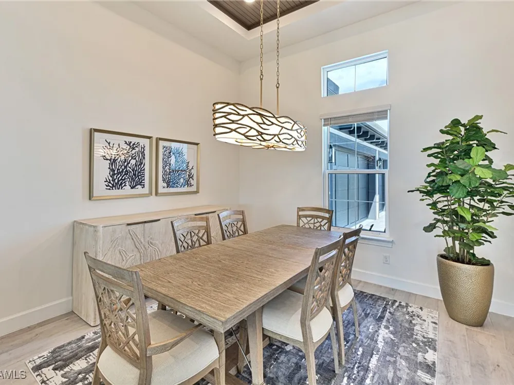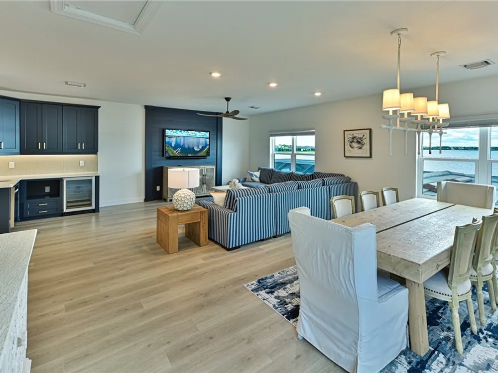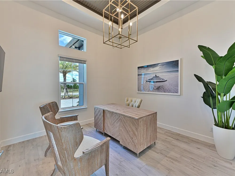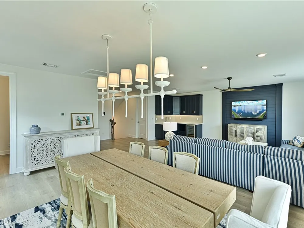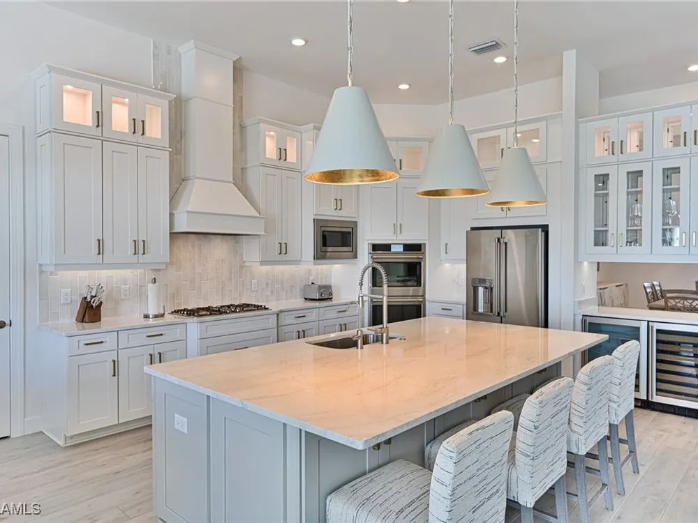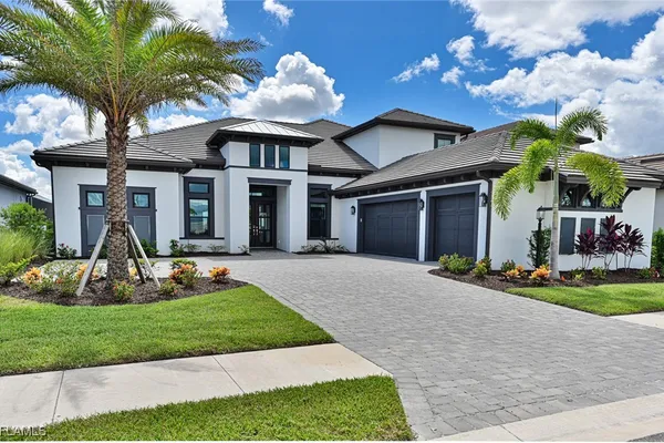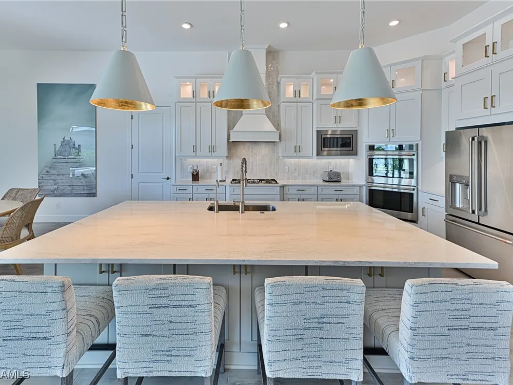 This Esplanade Lake Club home is located on one of the best lots on the widest part of Lake Como and offers everything for perfect for Florida living including: Amazing views from nearly every room in the house, 7,985 square feet of total living area, 4 bedrooms plus den/office, 5 baths, open floor plan, kitchen with gas cooktop, 2 wall ovens, top end appliances, custom cabinetry, quartz countertops, large sit at island and bar/butlers area with beverage and wine refrigerators, great room with fireplace & large screen tv above on a ship lap finished wood wall, great room dining room and kitchen all offer wide views over the oversized screen lanai with pool with sun shelf and spa plus a hibachi sit at bar with grill - full summer kitchen. The den offer a comfortable sectional couch seating & another large screen tv and wide lake views. This home lives on one level as the master suite sits right over the lake is located on the main living level with easy access to the swimming pool & spa. The spa inspired master bath features walk in glass shower, full wall of vanity custom white cabinetry with brushed brass hardware and two sinks and generous master closets. The upper level features a complete second living area with family room, kitchenette, dining area and 3 bedrooms and 3 baths. This home also offers extensive millwork, ceiling details including wood beams, large laundry room, impact windows and doors, flat tile roof with secondary water-resistance, concrete construction and a 3 car garage. Esplanade Lake Club is a 352-acre gated lakefront community on Lake Como where residents enjoy premier amenities including a lakefront beach, Bahama Bar & Grille, fitness center, tennis, pickleball, bocce, dog park, and Up to 23 foot boats are allowed on the Lake. All within minutes of RSW Airport, Gulf Coast Town Center, and world-class shopping and dining. Best of all this home is offered with it’s turnkey designer furniture and furnishings included for immediate closing and move in.