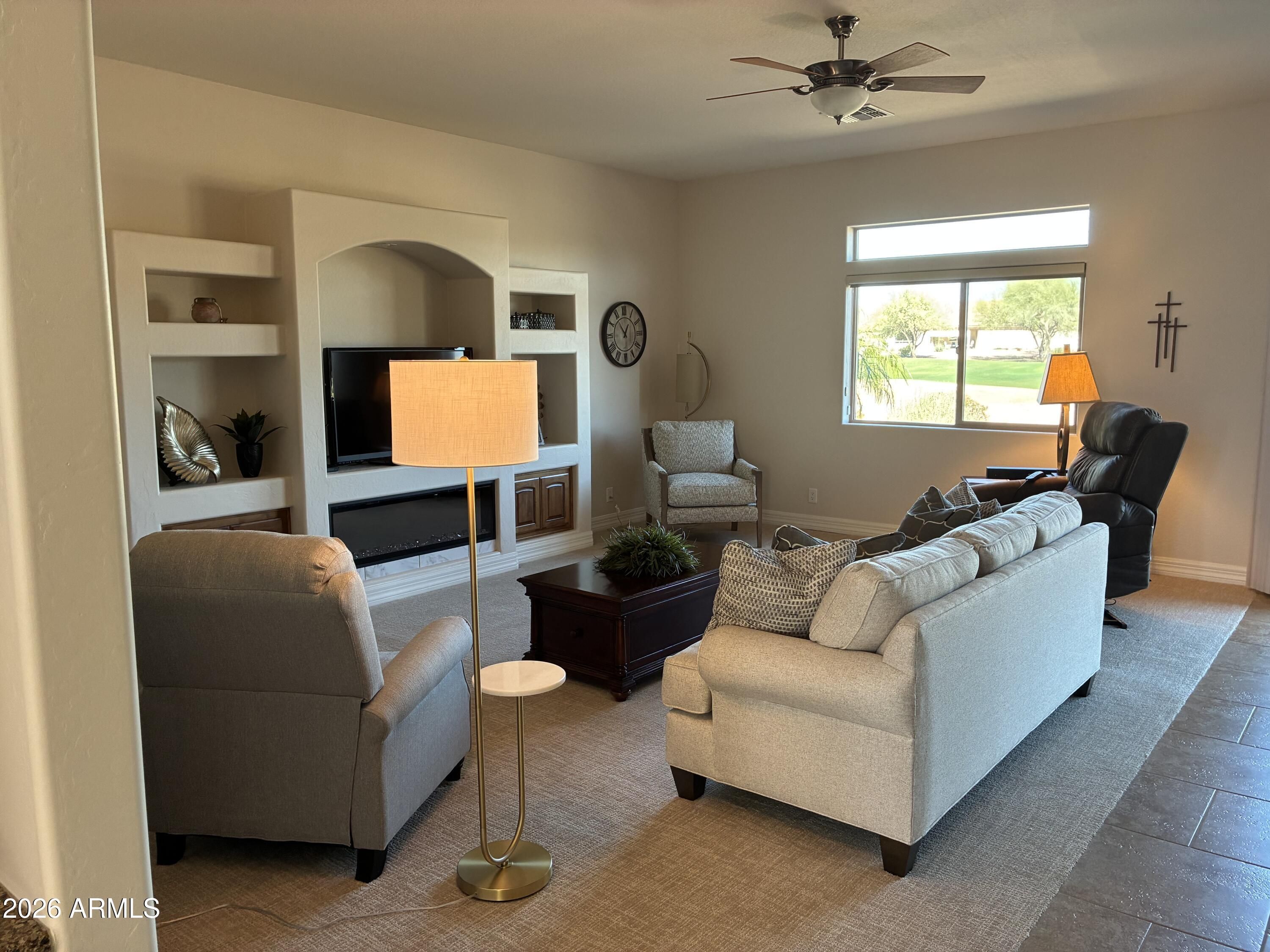 GOLF Course home with fabulous views! Beautiful interior with 2 beds and a den, 2 baths and all beautifully furnished! Open concept with kitchen, dining and great room gives you that comfortably feeling! The FULL 3 car garage is rare with ample storage cabinets! South facing, but North view of the Mountains, & a view of the golf course hole #3. A low HOA fee of $926 ANNUAL is the best in the valley with all the amenities! 2 exercise facilities, 2 pools, pickle ball & tennis courts. softball field, woodshop & the list goes on! 3 nine hole golf courses lets you complete your retirement!
