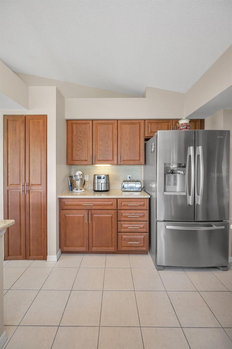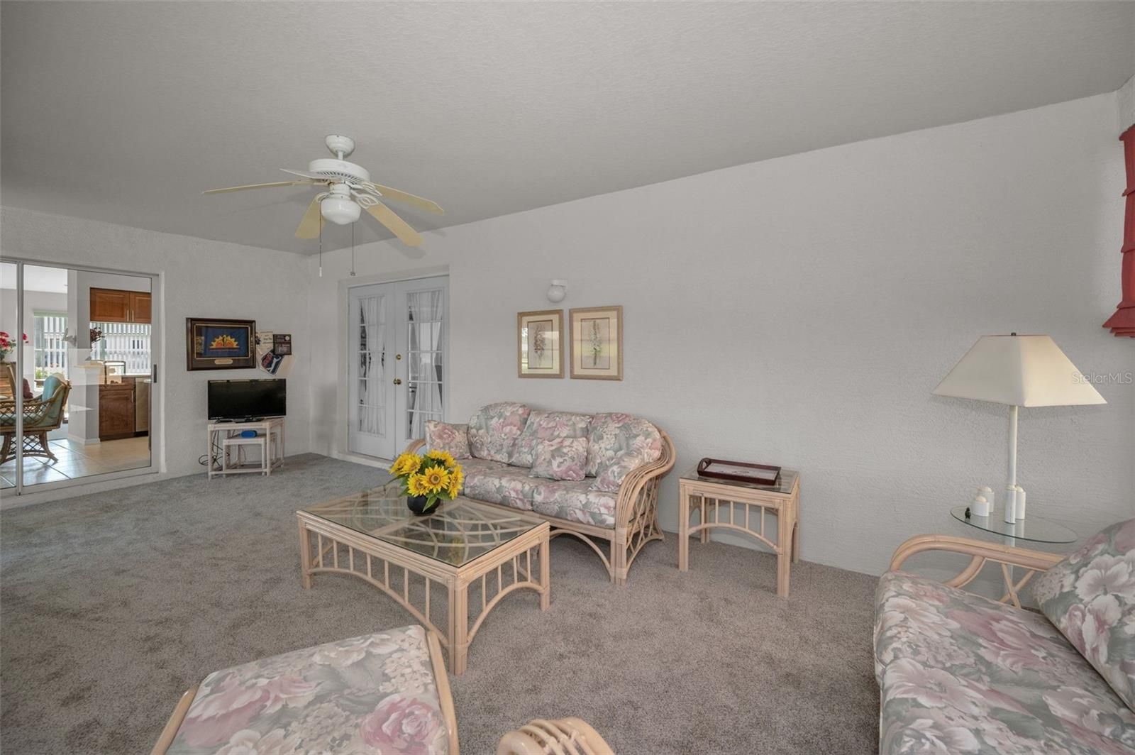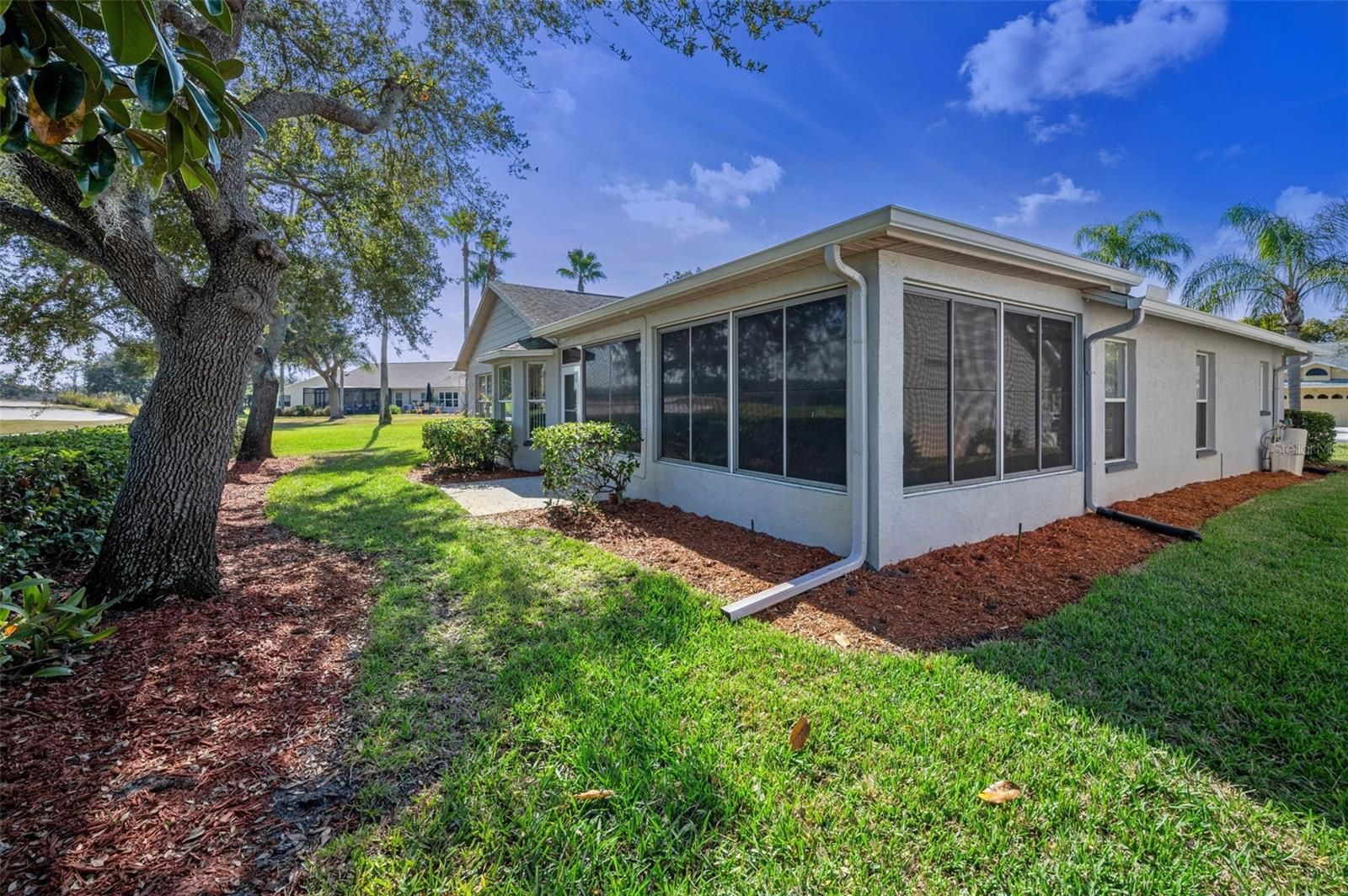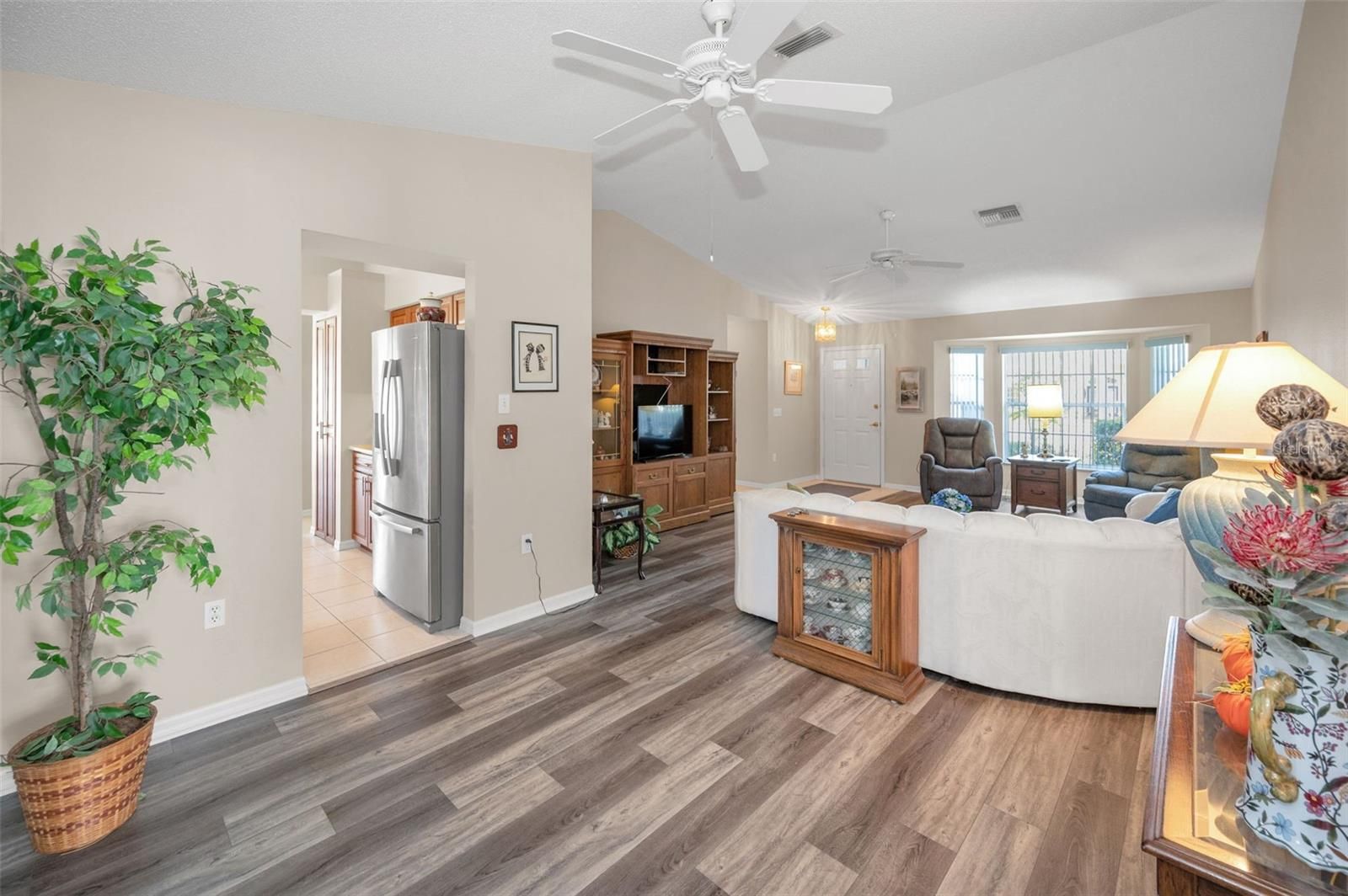 Just move right into this 3 bedrooms, 2 full bathrooms, Oversized 2 car garage! Once you arrive you will see the lush landscaping that brings you to the front door. As you enter into the foyer you have designer style laminate flooring & soaring vaulted ceilings in the formal living w/bay window and the formal dining room w/french doors to the enclosed lanai. The formal living & dining rooms are presently being used as a family room. The kitchen has been updated w/cabinets that have pullout shelves, under cabinet lighting, tile backsplash, quartz counter tops w/breakfast bar, stainless steel appliances, closet pantry and a wonderful breakfast nook area. The kitchen overlooks the family room that has carpet and is presently being used as a dining room. There is a hallway with two closets that lead you to the two guest bedrooms one w/carpet and the other is being used as home office w/laminate flooring. The guest bathroom has a tub w/shower and there is a pocket door that opens to the laundry room w/cabinets, closet, utility sink, washer & dryer. The primary bedroom has plenty of room for all your pieces plus two walk-in closets. The primary bathroom has been updated w/dual sinks and a walk-in shower. The oversized garage has pull down staircase to attic and cabinets. You and your guest will enjoy sitting in the enclosed lanai that has a fabulous view of the golf course. This gated community offers many events & activities that your social calendar will always be full! There is a golf course, tennis courts, pavilion w/picnic tables, bocce, shuffleboard, horseshoes, club house w/ restaurant & lounge, performing arts center, billiard & game room, arts & crafts room, library & computer room, heated pool & spa.