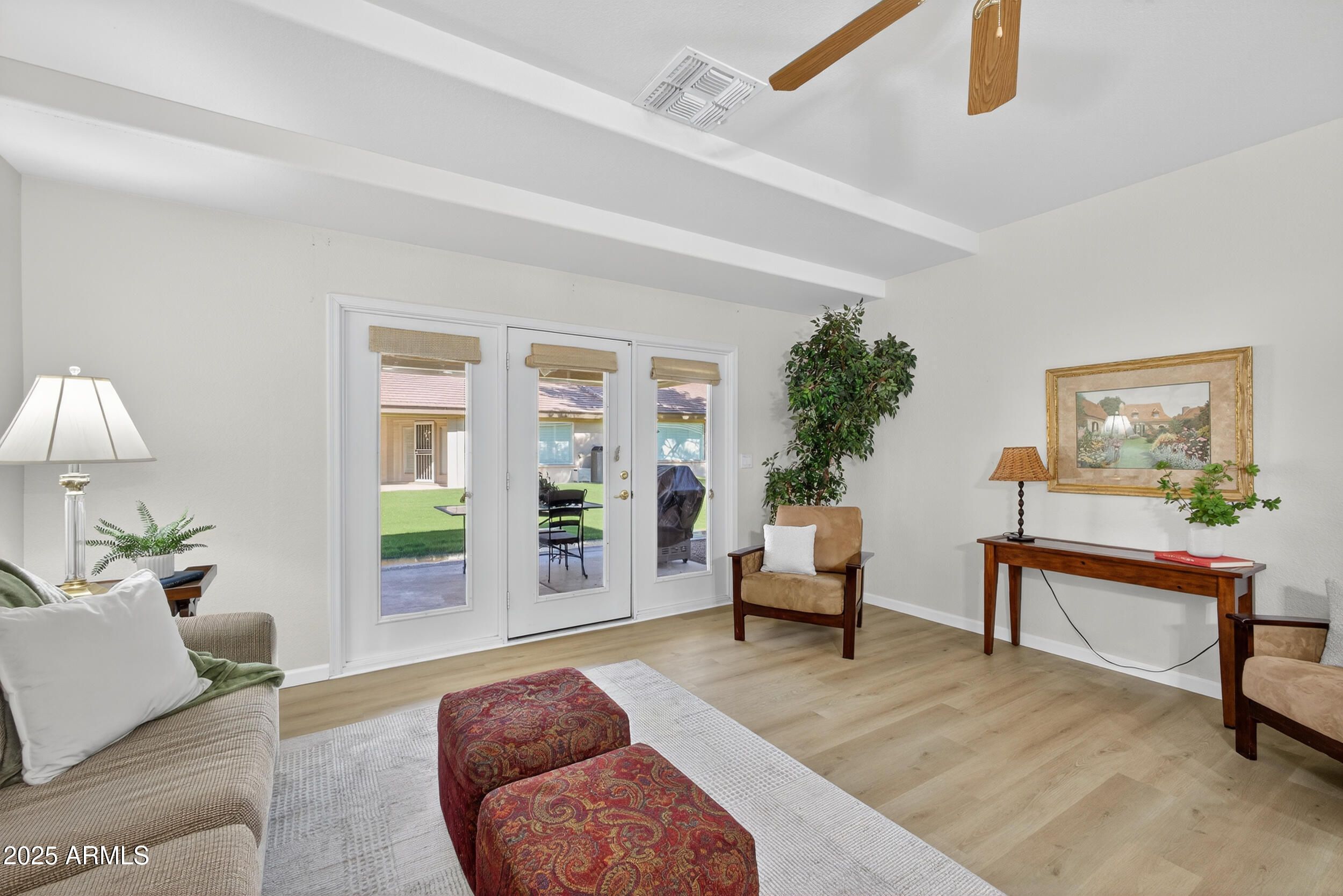Check out this Partially Furnished, 2 bedroom, 2 bathroom 2 Car Garage property in one of the best Active Adult Communities in the greater Phoenix area, Sunland Springs Village. This home has been updated with NEW Luxury Vinyl Plank, new baseboards and has a neural paint throughout. Property features a great front porch, and covered rear porch that backs up to a great green space, maintained by the HOA. Enjoy all that the community has to offer with a fantastic pool, spa, tennis court, golf and more! Located just minutes from shopping, restaurants, health care, movies, the Mesa-Gateway Airport and US60, this is the best place to be! Come check it out!