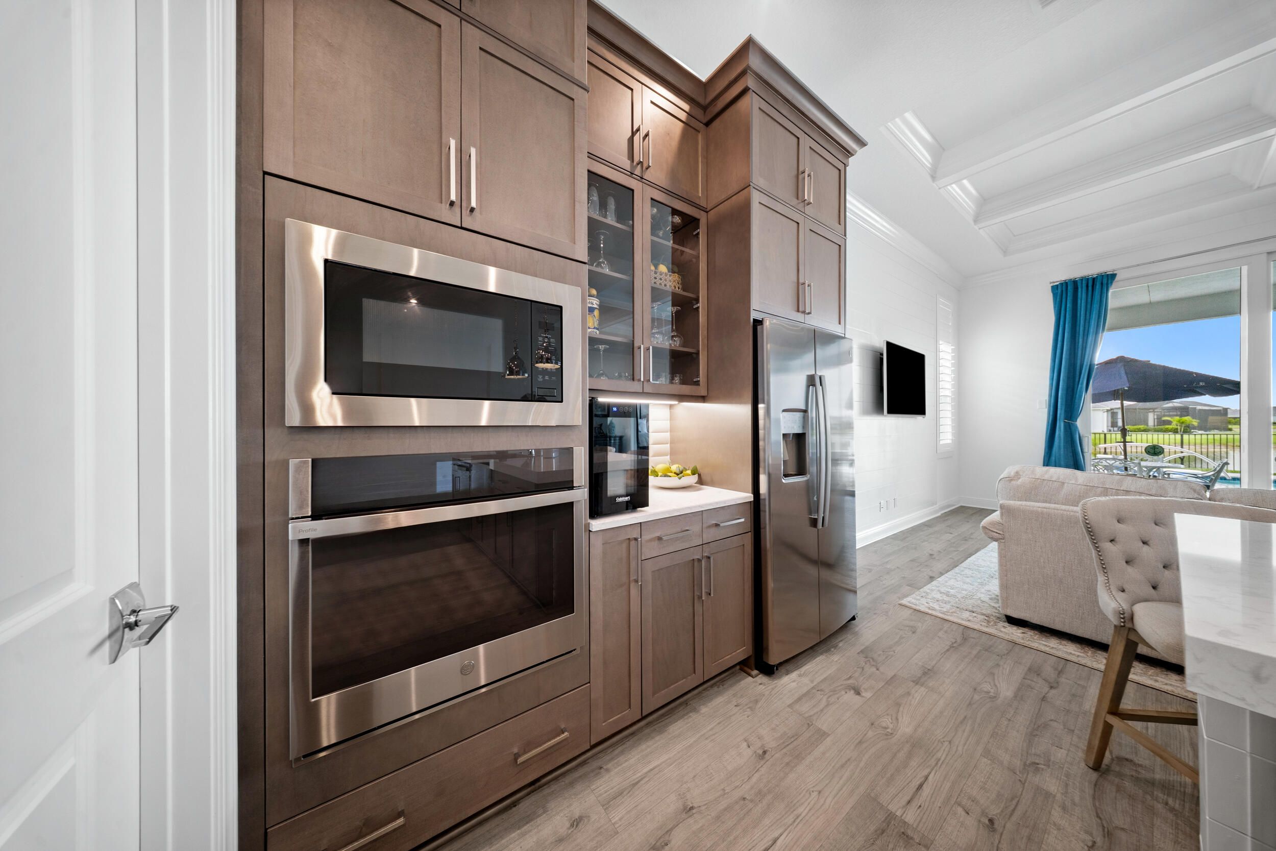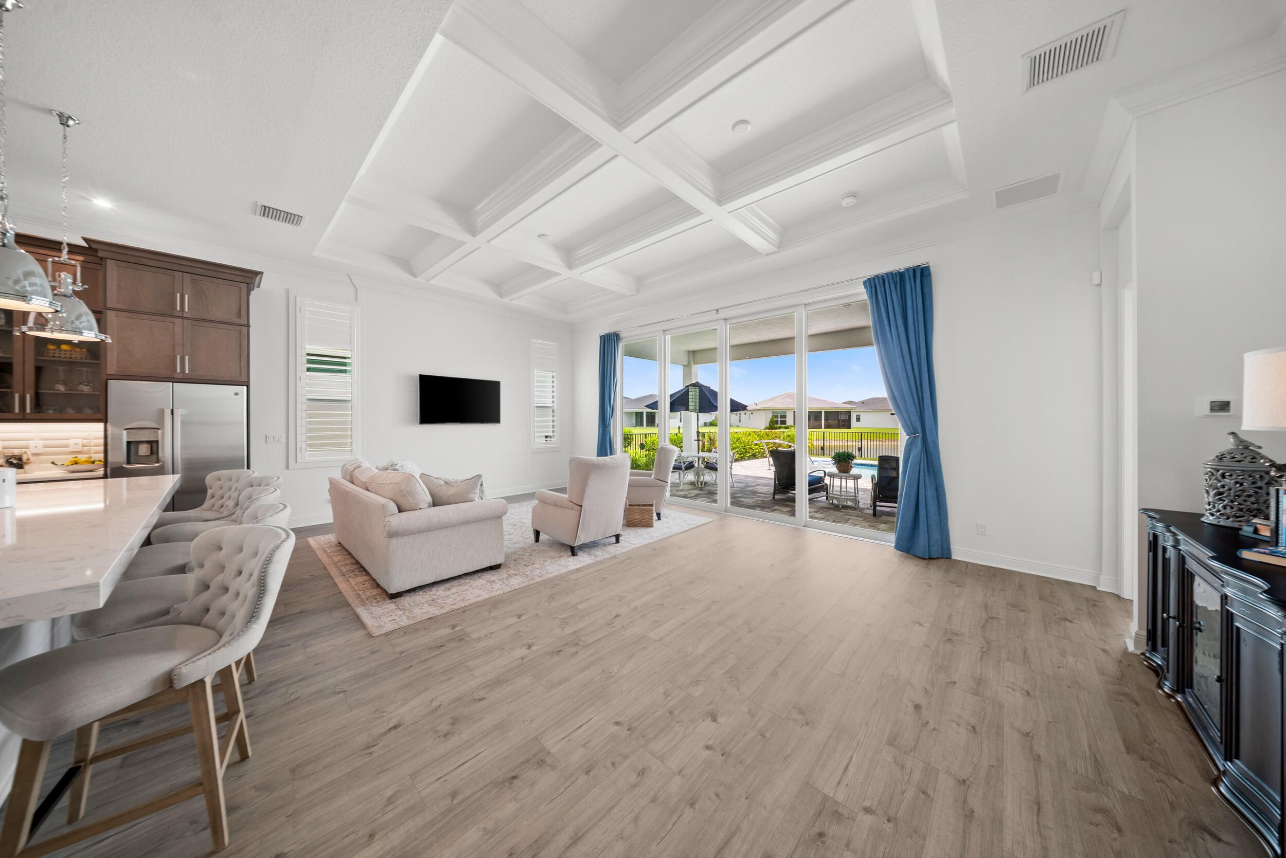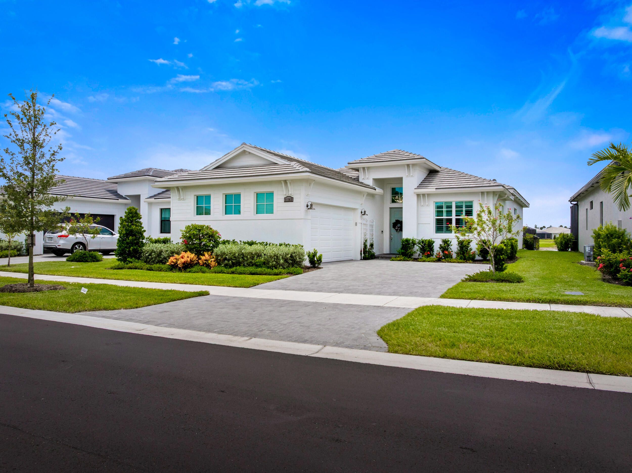 Designed for comfort and relaxation, this young home keeps stress at bay. With over $100K in upgrades, lakeview sunsets, sunshelf pool w/waterfalls and dual master suites, calm is the mood of every day. A neutral color pallette topped off with soaring coffered ceilings, and complemented by 10'sliders leading to the pool. The kitchen is the gathering place with a 10ft, 3''thick quartz island, luxe cabinetry, and a gourmet appliance package. A grand owners suite/spa like bath with TV and expanded walk in closet. A second private suite and guest room give everyone space to enjoy. Golf cart access to PGA Golf Club(memberships avail).Club Talavera, 27 pickleball courts, indoor lap pool and more will keep you fit and social. Located near restaurants, shops. 45 min to West Palm, 2hr to Orlando.