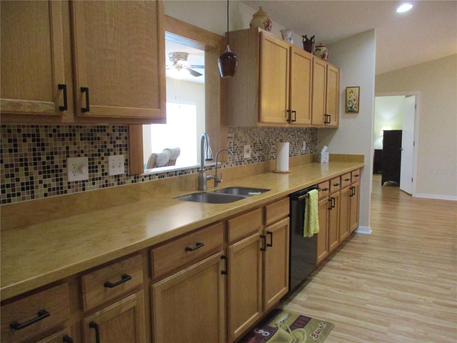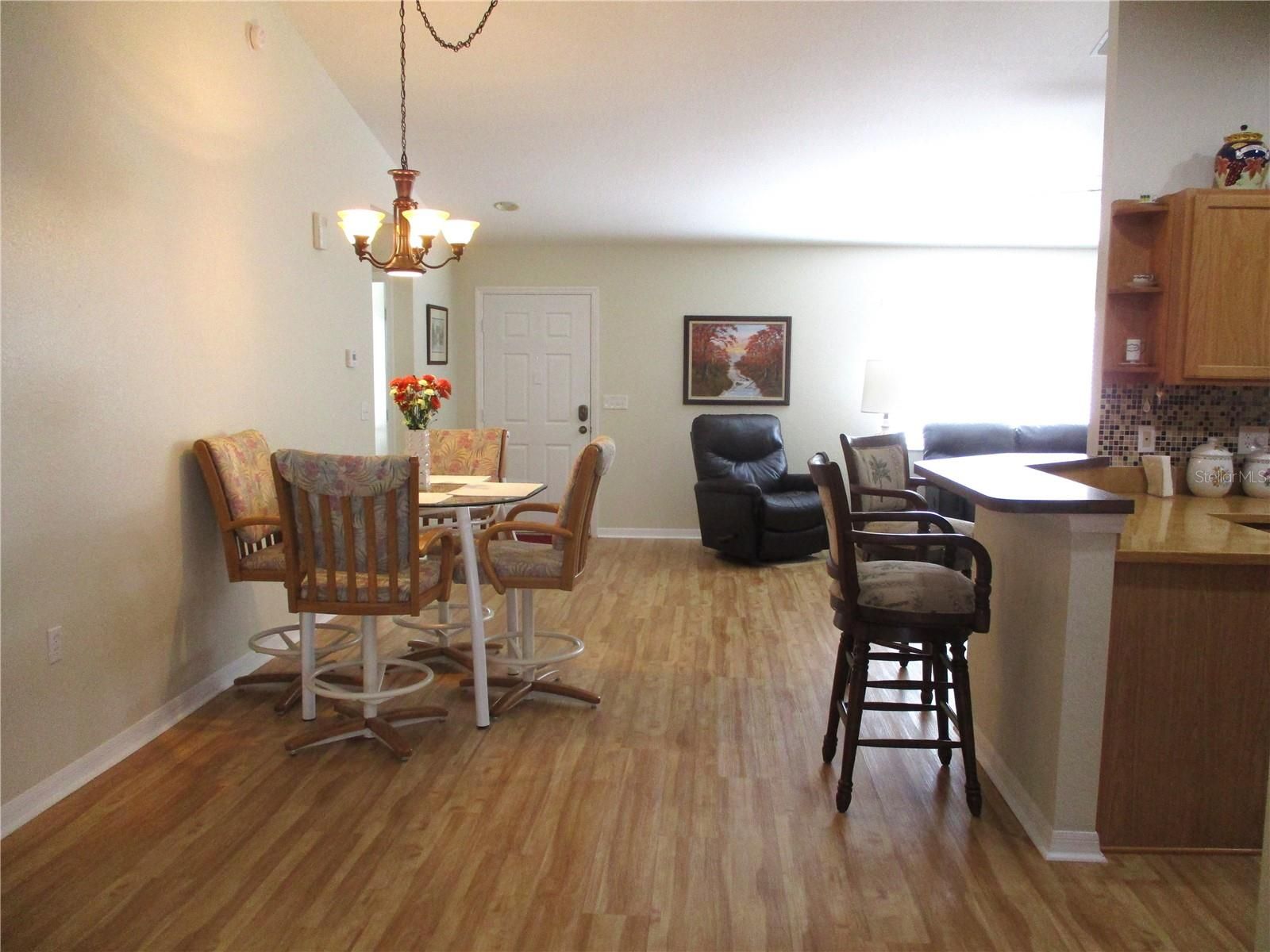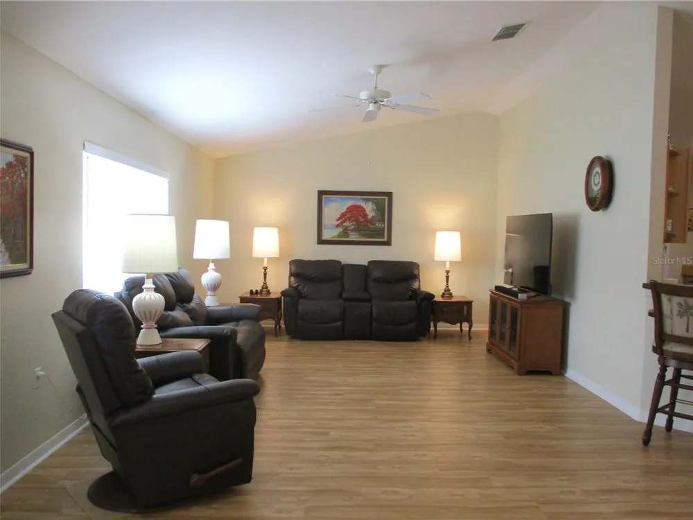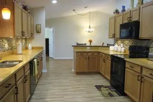 IMMACCULATE INSIDE AND OUT !! You will be impressed with the curb appeal on this lovely STUCCO 2/2/2 with Florida room, enclosed lanai, covered grilling patio, extended front porch and colorful landscape plantings within the concrete curbing. Even more inviting is the warm and welcome feeling you'll experience when you walk in the door! This SPACIOUS Palm model home has New Luxury Vinyl Plank running thru with no thresholds. Fresh interior (and exterior) paint. The kitchen is semi open, with plenty of soft close oak cabinetry, light and bright with under cabinet LED lighting as well as recessed lighting and solar tube. Loads of work space with Corian countertops, tasteful tile backsplash and black appliances. The primary bedroom has double closets and double vanities in the bathroom as well as new tile floors and water saver toilets in both bathrooms. New blinds and solar shades. Garage is 20x26., ROOF 2017, HVAC 2022, WATER HEATER 2019, TERMITE BOND, WATER SOFTENER, KITCHEN REVERSE OSMOSIS. In the fun friendly active 55+ gated golf community with pool, spa, pickleball, tennis, shuffleboard, corn hole bocce ball, fitness center, billiards, water aerobics, yoga, exercise classes, library, crafts, bingo, bunco, cards, game night, pot luck dinners, dances, social and travel groups. Minutes from golf, groceries, medical, restaurants, shopping gas, banking, hiking and biking nature trails.