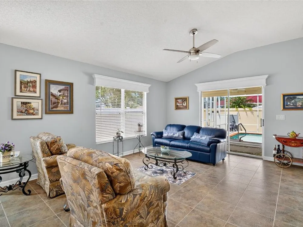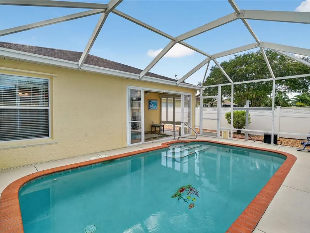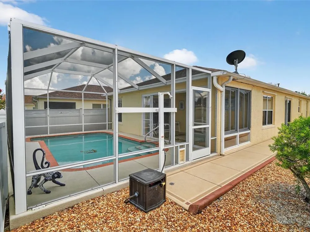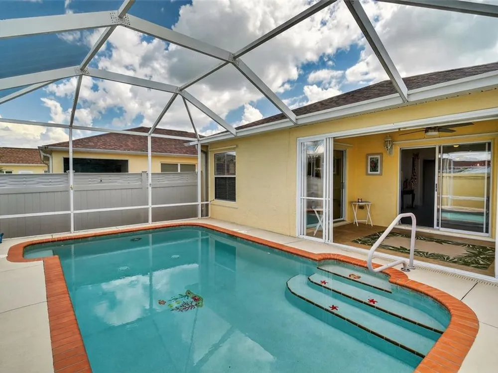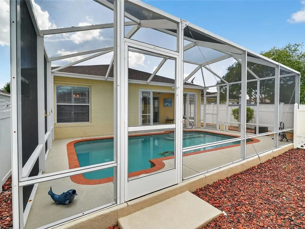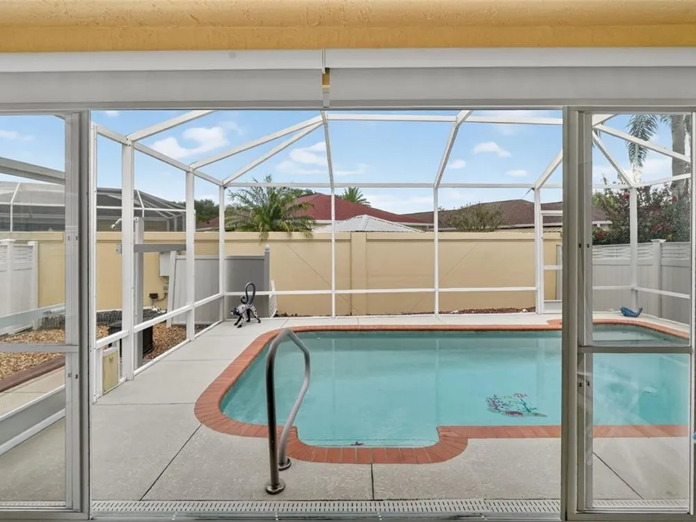 Outstanding 3/2 Foxglove Model with a Pool No BOND Located in the Prime location of the Hampton Villas Between 466 & 466A, AC & Roof 5 Yrs old Tile Flooring in all main Areas, Third Bedroom/Den Luxury Vinyl. Kitchen has Custom Laminate Counter Tops Newer SS LG Appliances Open to Dining and Living Room. Primary Bedroom has Tile flooring and In-suite Bath Enclosed Lanai Sliders to Large in-Ground Pool Bird Caged New Pool & Filter, Garage Flooring Just Painted and Parking For Car & Golf Cart. Home Walking Distance to Two Community Pool and Mail Station also between Mallory, Cane Garden CC & Lake Mona Center this home has it all some Furniture Available. Call to view this great Pool Home