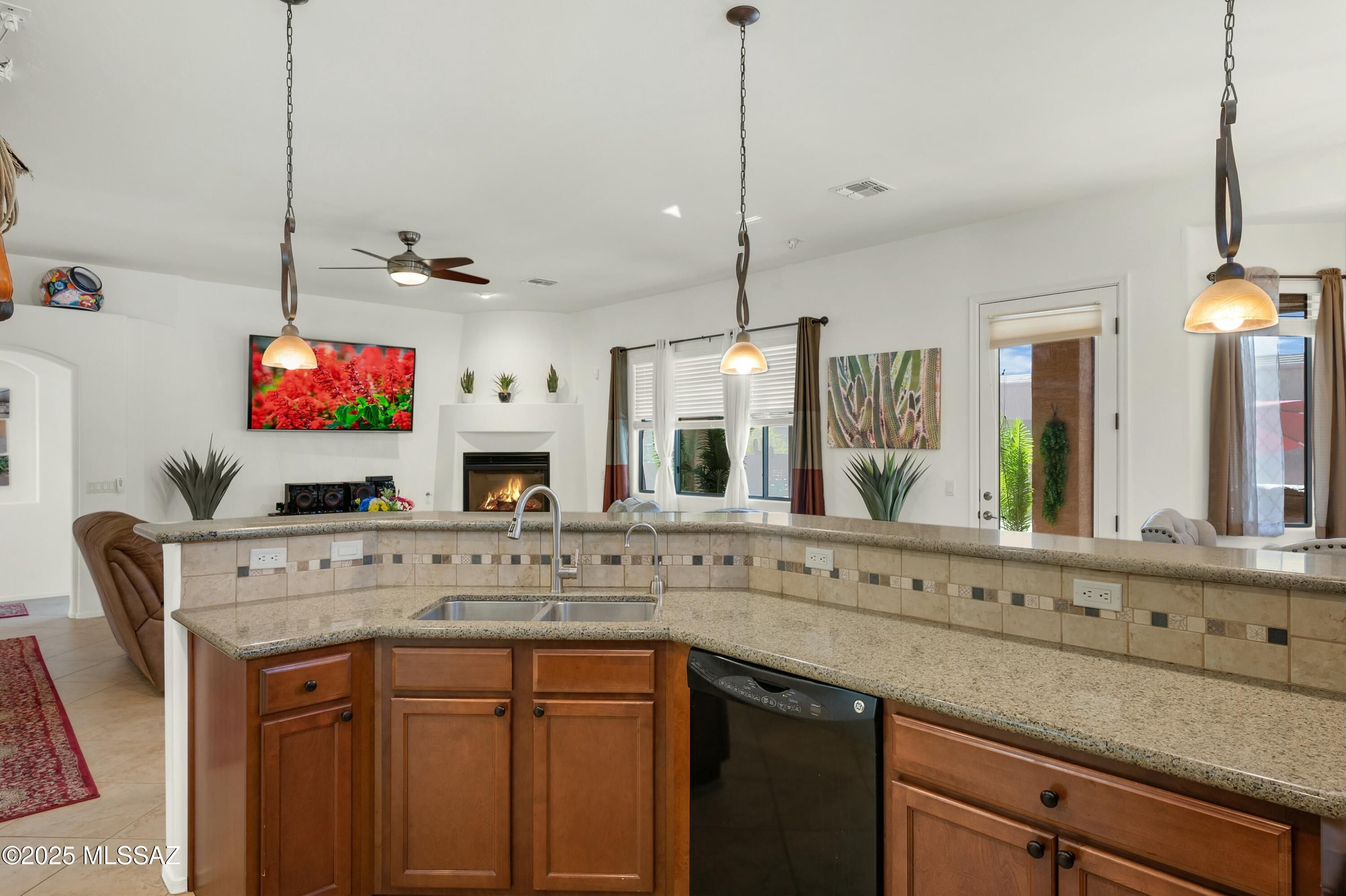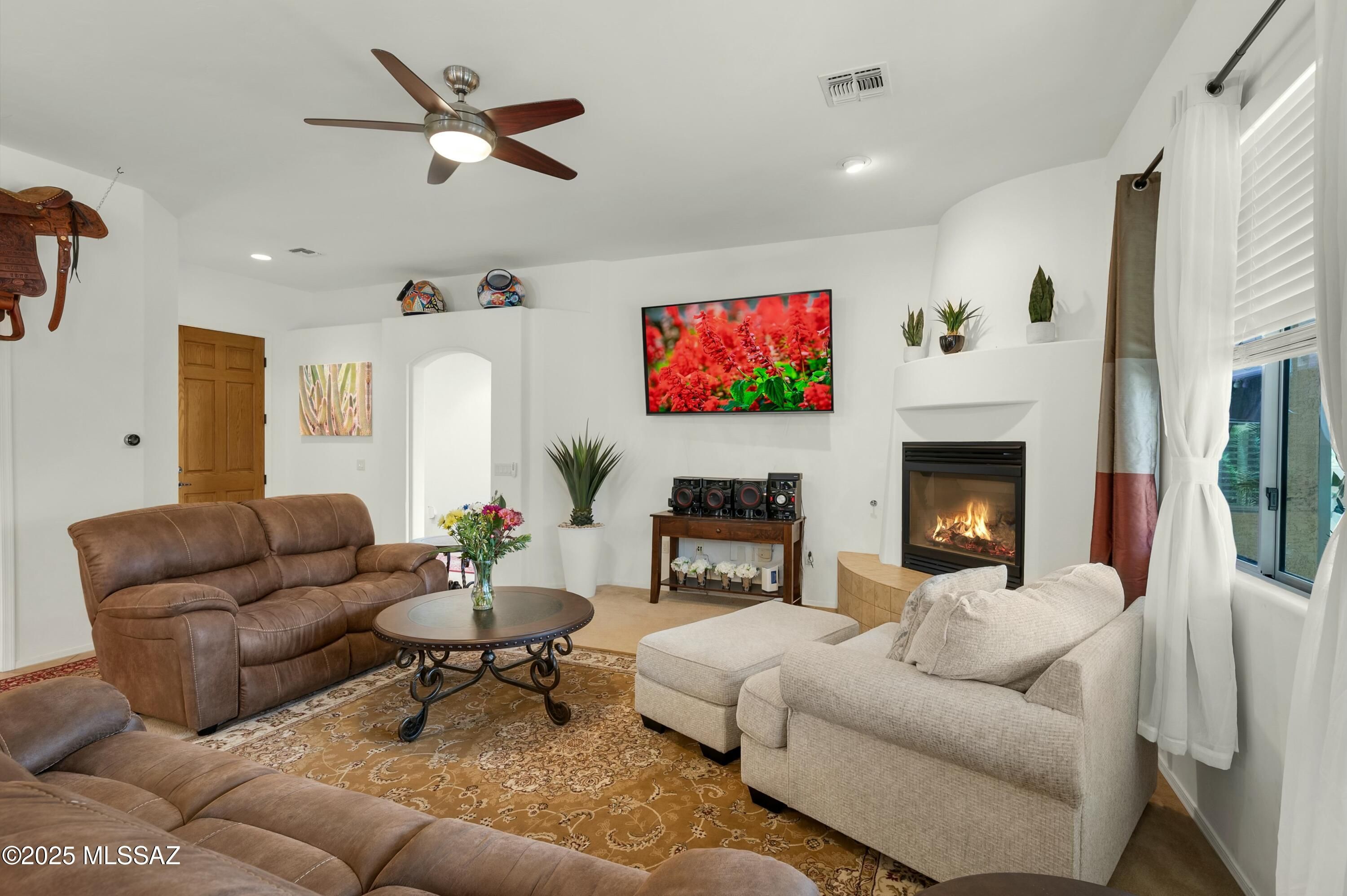 Welcome to this beautifully maintained home in the highly sought-after San Miguel neighborhood of Las Campanas, where breathtaking mountain views and resort-style living await. This move-in-ready 3-bedroom, 2-bathroom home boasts a versatile office and bonus room, providing ample space for work, hobbies, or additional guest accommodations.Step inside to an inviting open-concept floor plan, perfect for entertaining. The kitchen features granite countertops, sleek appliances, and plenty of storage, making meal preparation a delight. A split-bedroom design ensures privacy, with the spacious primary suite offering dual vanity sinks and a serene retreat. The grand living room is warm and welcoming, complete with a cozy fireplace that sets the perfect ambiance for