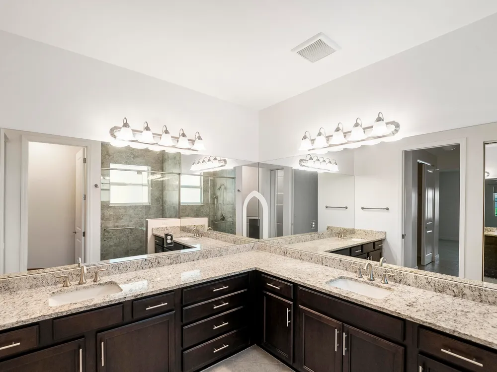 - Entrance Foyer, Kitchen Island, Pantry, Split Bedrooms, High Ceilings, Walk-In Closet(s), Home Office, Great Room, Family/Dining Room, Kitchen/Dining Combo, Eat-in Kitchen, Snack Bar, Blinds, Drapes, Impact Glass, Dual Sinks, Primary Downstairs, Separate Shower