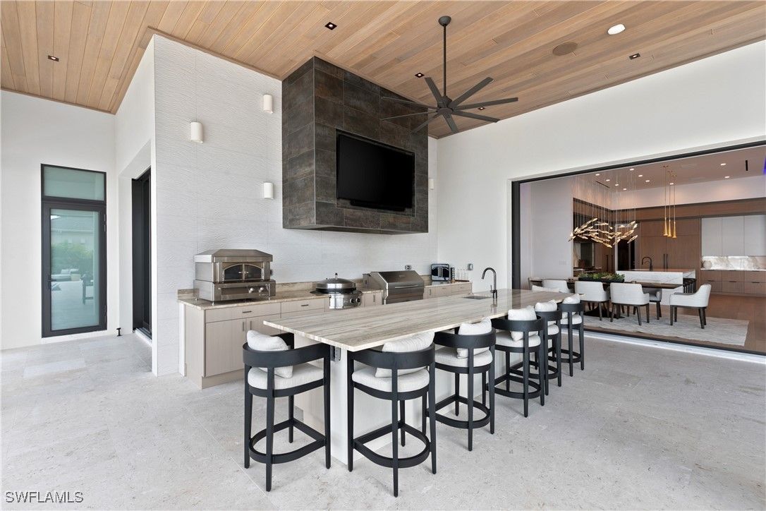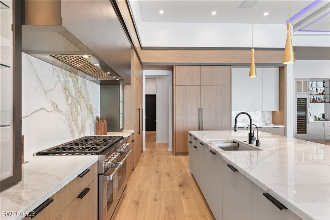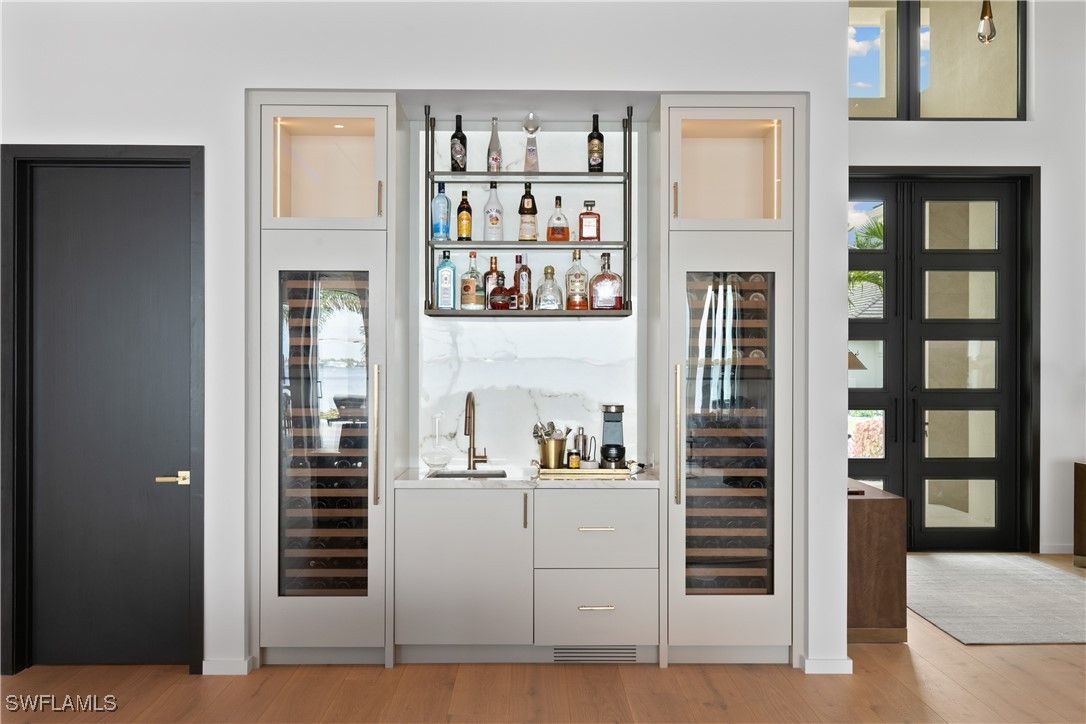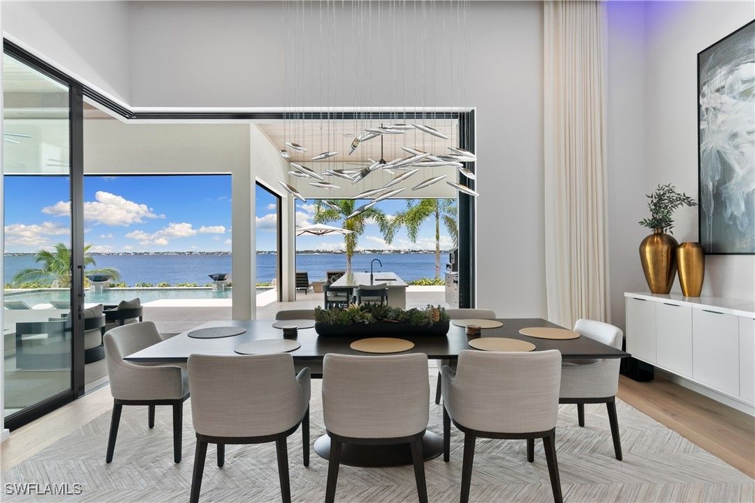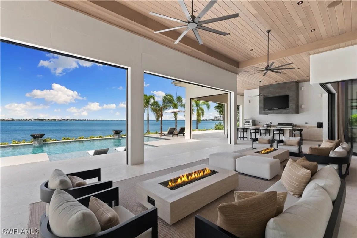Embark on a journey of exquisite living in this unparalleled waterfront residence, a sanctuary of luxury in Gulf Harbour’s prestigious Edgewater subdivision on highly sought-after Longwater Chase Court. Exuding opulence at every turn, this home will impress even the most discerning buyer. Wide-plank White Oak flooring leads through grand spaces adorned with hand-selected Italian marble and refined details. The great room offers effortless entertaining with a built-in backlit Onyx bar, dual Sub-Zero wine storage systems, and a striking 12-foot water vapor fireplace illuminated by a hand-blown Restoration Hardware fixture. The expansive chef’s kitchen features premier Wolf, Sub-Zero, True, and additional high-end appliances, seamlessly integrated with a marble butler’s pantry complete with a coffee station, dual lazy Susans, second dishwasher, microwave, and Franke sink system. The private primary suite provides sweeping water views and a spa-like bath. Three ensuite guest bedrooms ensure comfort and privacy, while an oversized water-facing bonus room—equipped with a king Murphy bed and queen sofa pullout—serves as a flexible retreat for additional guests, a home office, exercise space, or playroom. Cutting-edge smart technology elevates daily living with Loxone-powered Ketra lighting, Bowers & Wilkins in-ceiling speakers indoors and out supported by eight Sonos Amps, and fully integrated smart lighting, alarm, and climate systems. Outdoors, 110 feet of private white-sand beach and 1,400 sq. ft. of covered lanai living create a rare oasis with unobstructed Caloosahatchee River views. The saltwater pool features a built-in sun shelf, spa, and dramatic fire and water elements surrounded by lush landscaping—perfect for evenings under the stars. Ideal for boating and golf enthusiasts, Gulf Harbour provides a world-class deep-water marina with access from Sarasota to Marco Island and an acclaimed golf course with immediate memberships. A coveted D-Dock boat slip—along with a Boston Whaler 380 Realm—is available separately. Crafted by Frank Jenkins Custom Homes, this masterpiece represents the pinnacle of craftsmanship and Southwest Florida living, offering an extraordinary opportunity to move right into a one-of-a-kind waterfront oasis.