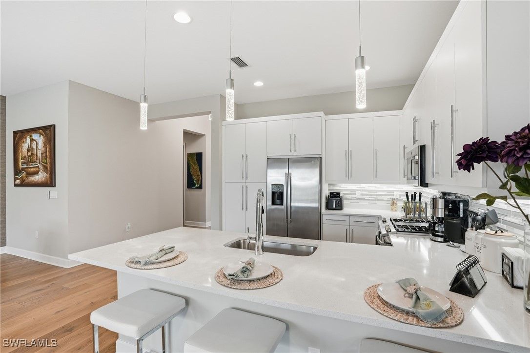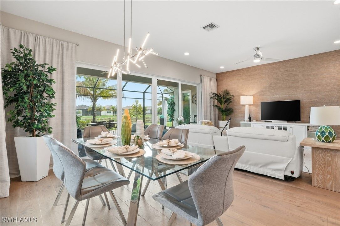 The moment you walk in, you notice how beautifully done and light-filled this home is bright, welcoming, and easy to live in. Nothing feels tight or overdone; it just flows. The kind of home where you can picture living here full-time or spending time seasonally, surrounded by the people you love. Built just two years ago and thoughtfully upgraded with over $100,000 in premium enhancements, this residence stands apart from standard builder offerings and features hurricane-impact glass throughout for added peace of mind. The living space opens right out to the extended lanai and lake, which is really where this home shines. This is where mornings start with coffee outside, dinners stretch a little longer because no one’s in a rush to leave, and friends, family, and guests feel instantly at home. The lake gives you space and privacy, and being on a corner lot means you’re not looking into someone else’s windows. Inside, the layout just makes sense. You’ve got three bedrooms plus a den, so everyone has their own space. The den works perfectly as a home office, hobby room, or extra sleeping space when visitors come down from up north. With three full bathrooms, hosting is easy, even when the house is full. The kitchen has already been upgraded, including natural gas cooking, so you’re not walking in thinking about projects. Wide-plank white oak wood flooring, custom finishes, and thoughtful details throughout reflect a home where the work has already been done and done well. The primary suite feels like a true retreat, complete with custom closet systems that make daily living simpler, not more complicated. The split floor plan adds another layer of privacy, with the primary suite set apart from guest spaces. Even the garage has been elevated, featuring air-conditioning and epoxy flooring, ideal for storage, fitness gear, bikes, golf equipment, or simply keeping everything clean and organized. What really sets this home apart is how low-maintenance life feels here. Valencia Trails is a newer 55+ community designed for people who want to stay active, social, and engaged without feeling obligated to do it all. There’s a large dog park, miles of walking trails, multiple pools, and a beautiful clubhouse that includes a cooking studio, spa, billiards room, indoor and outdoor bars, and a banquet hall with shows and events. Add pickleball, tennis, and a wide variety of clubs and activities, and it’s easy to fill your days exactly how you want or keep them as full or relaxed as you choose. And soon, a back gate directly out to Vanderbilt Beach Road will make getting in and out effortless whether you’re heading to dinner, the beach, or meeting friends and family. This isn’t just a place to live it’s a home that supports how you want to spend your time now. Whether it’s just the two of you or a house full of visitors escaping winter, everything has its place, everyone has space, and life here simply feels… easy.