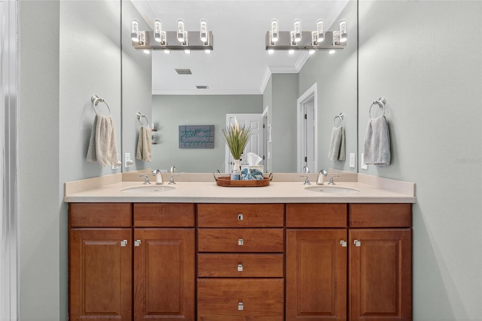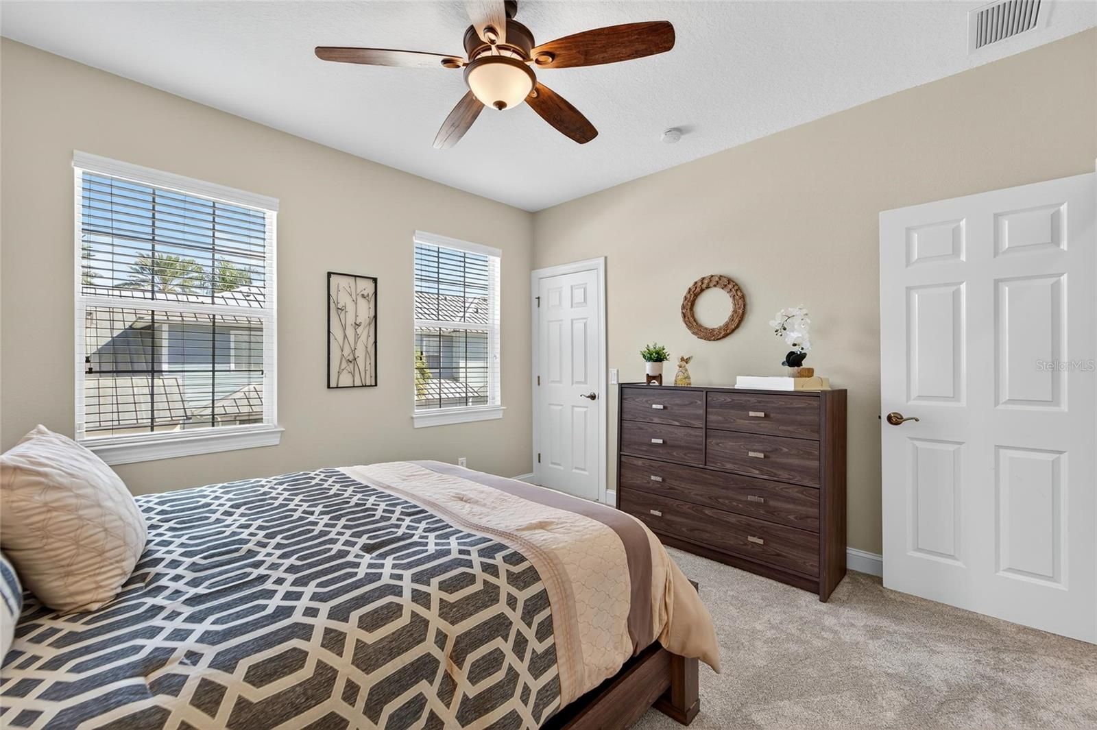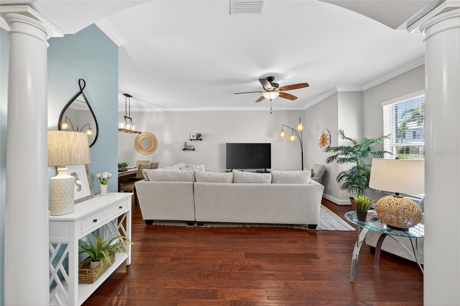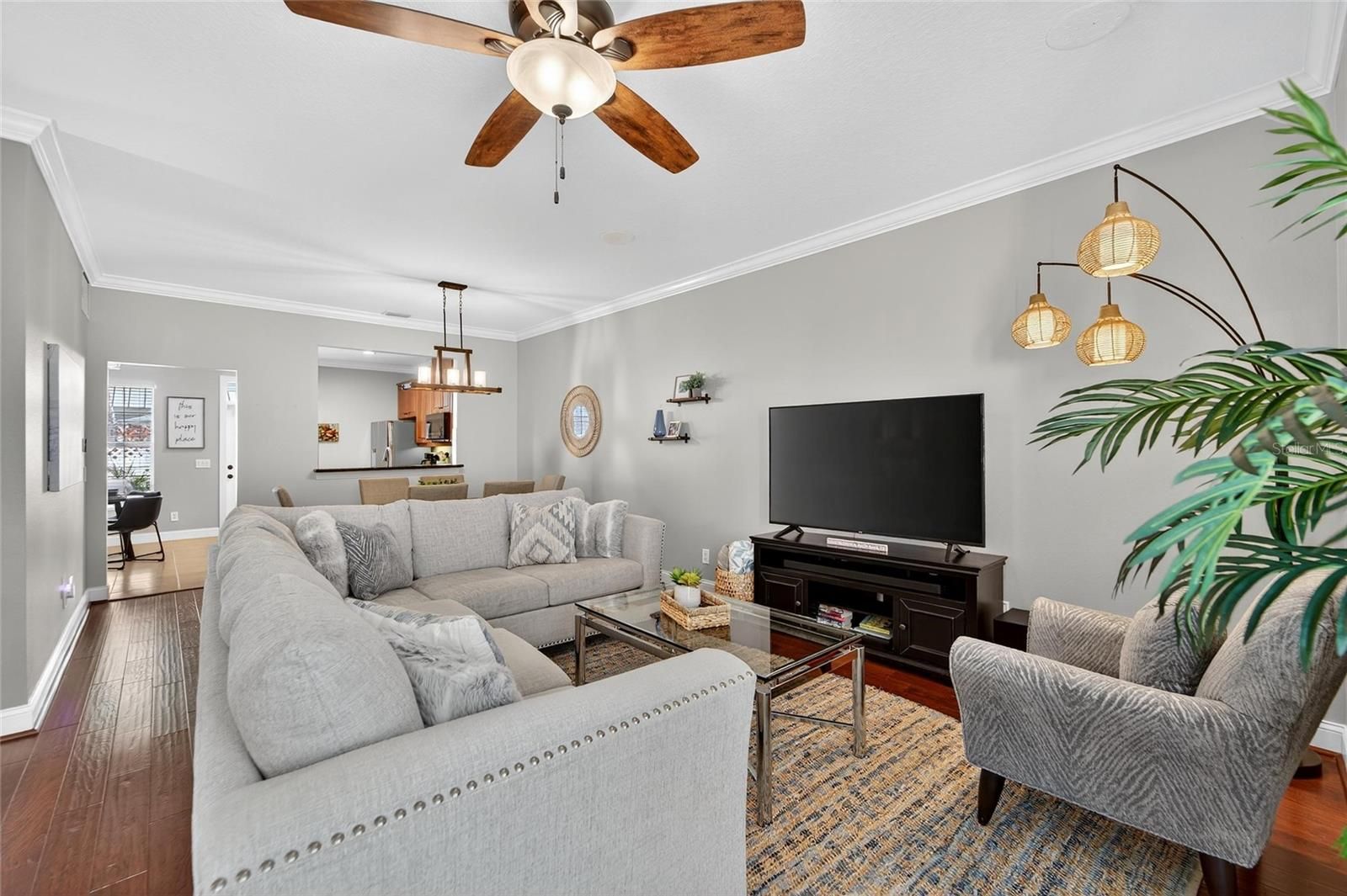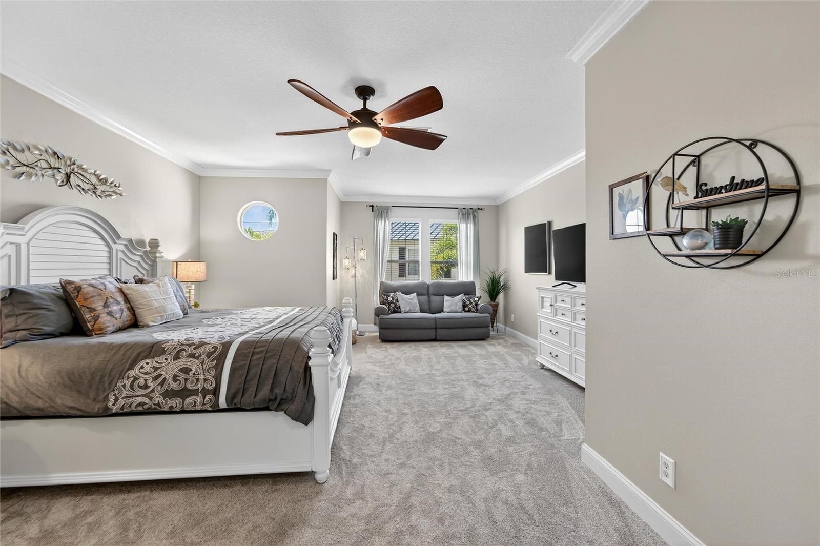 - Ceiling Fan(s), Crown Molding, Eat-in Kitchen, High Ceilings, Kitchen/Family Room Combo, Living/Dining Room, Open Floorplan, Upper Level Primary, Solid Surface Counters, Solid-Wood Cabinets, Split Bedrooms, Thermostat, Tray Ceiling(s), Walk-In Closet(s), Window Treatments