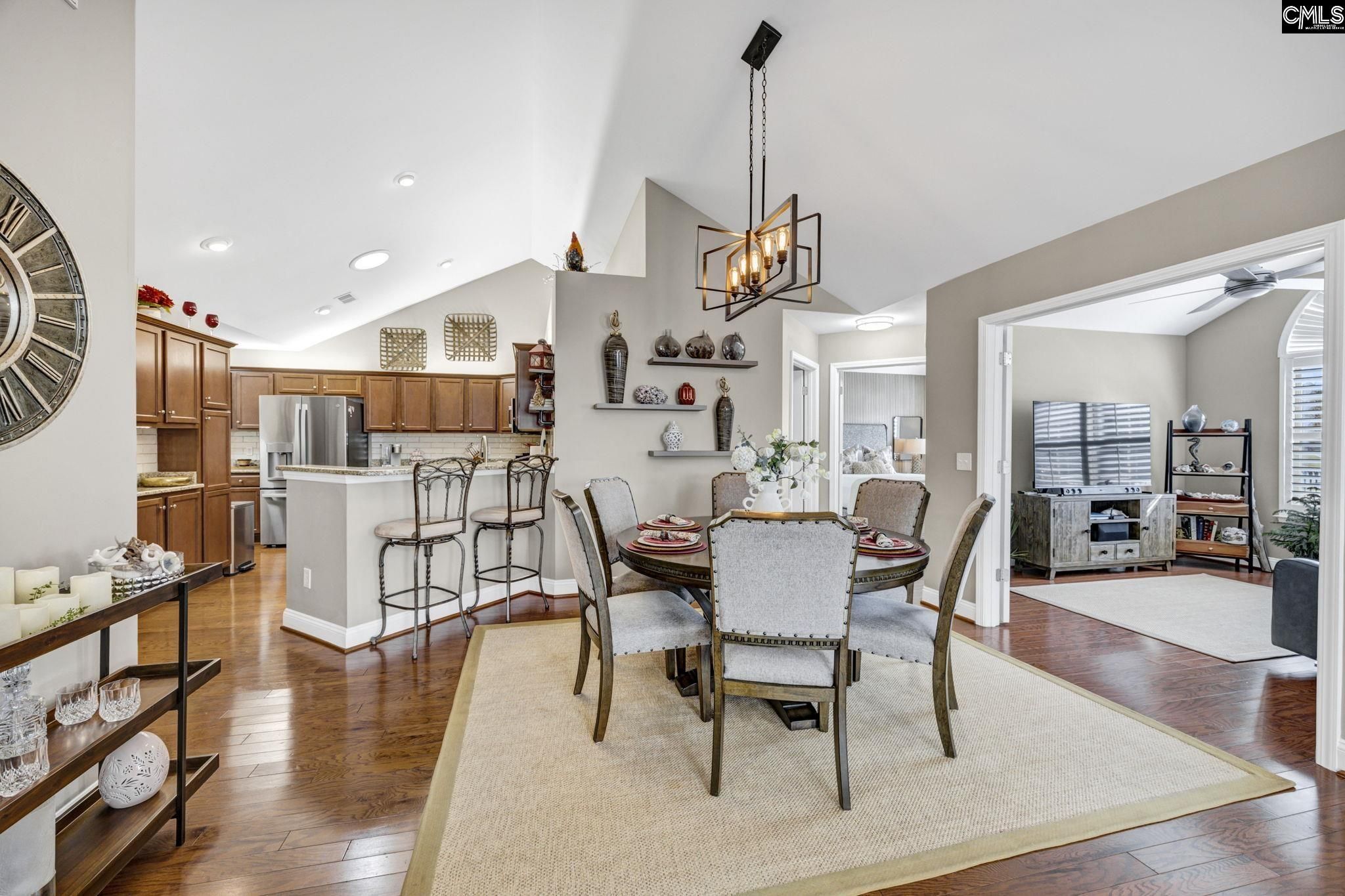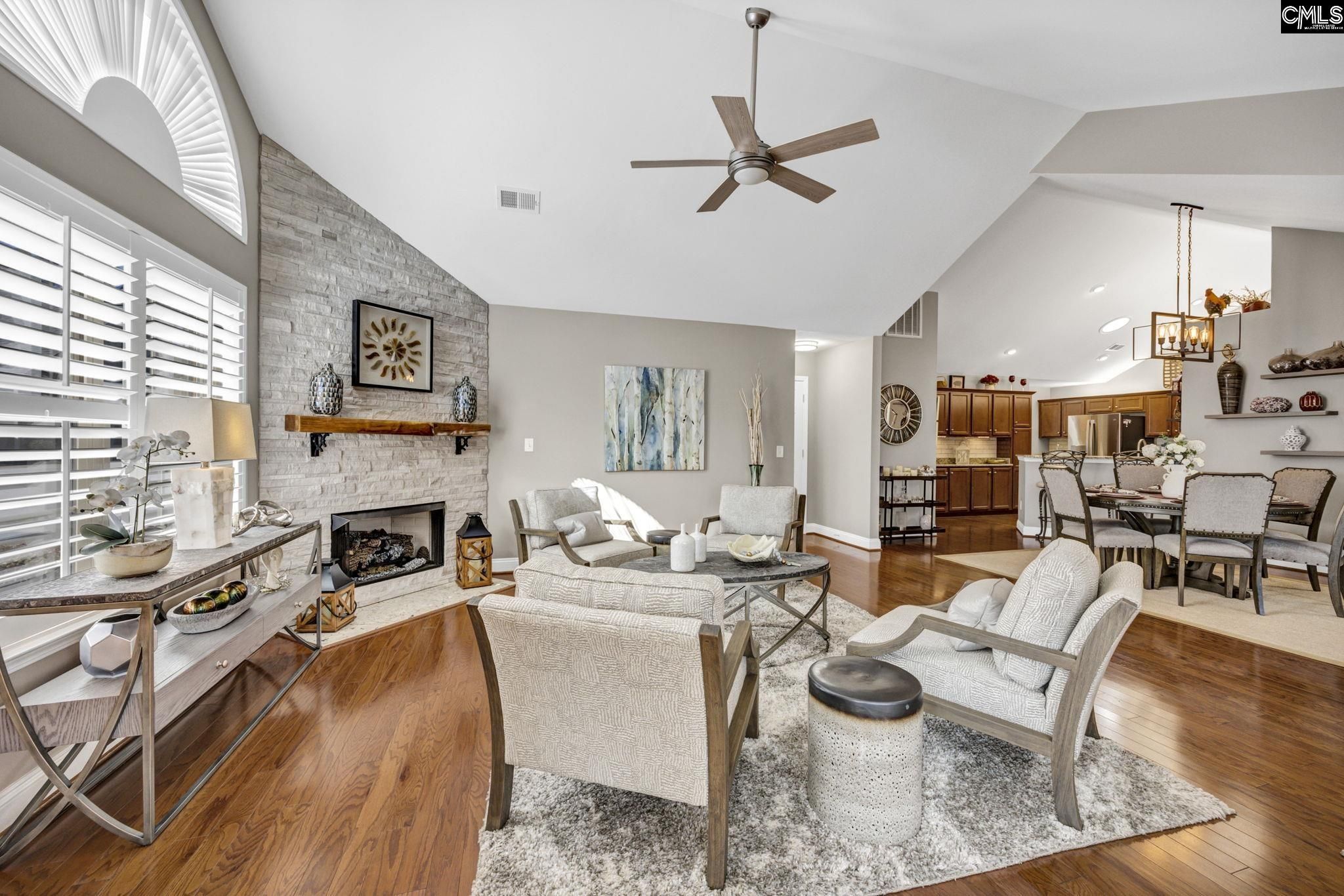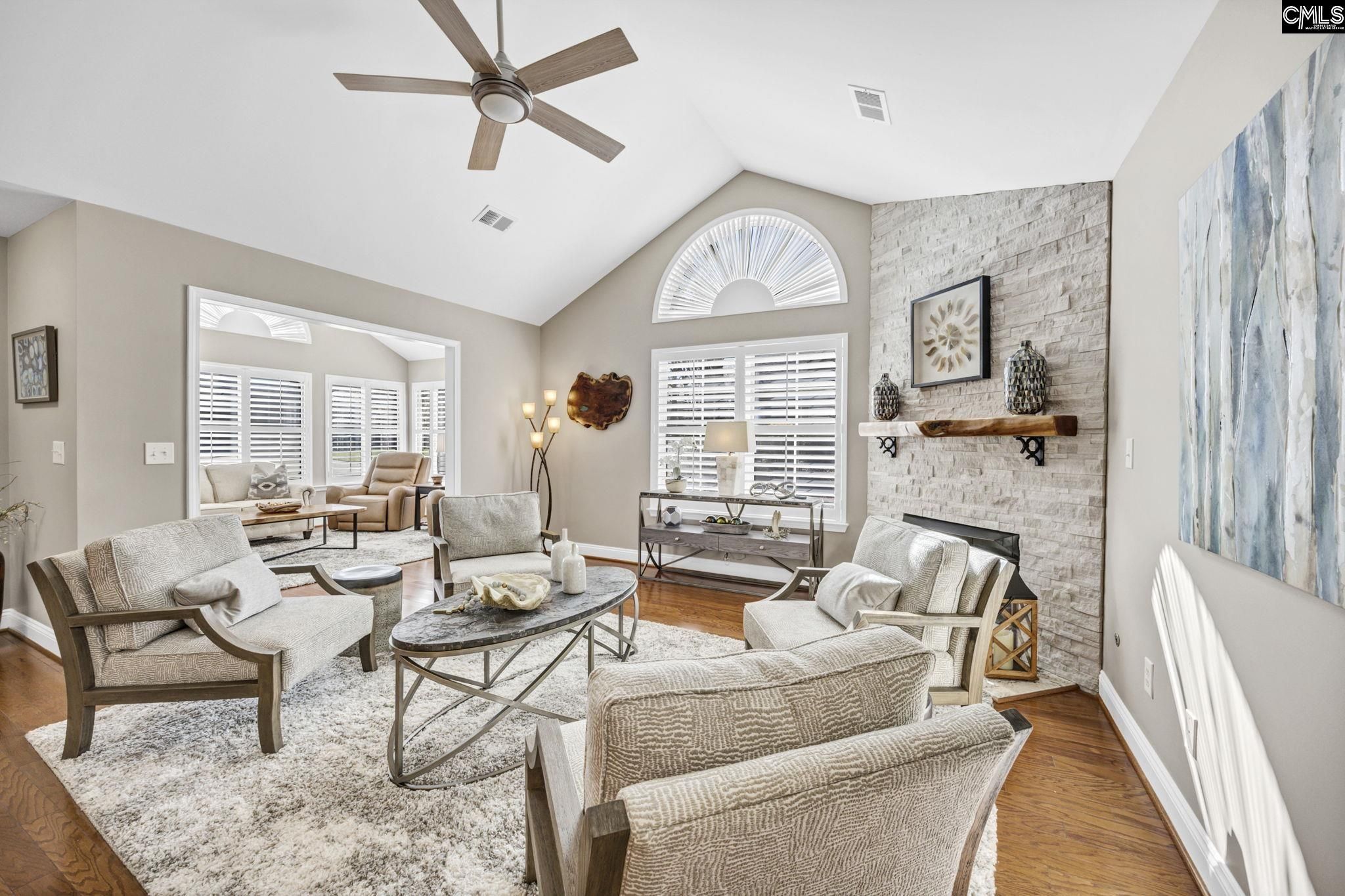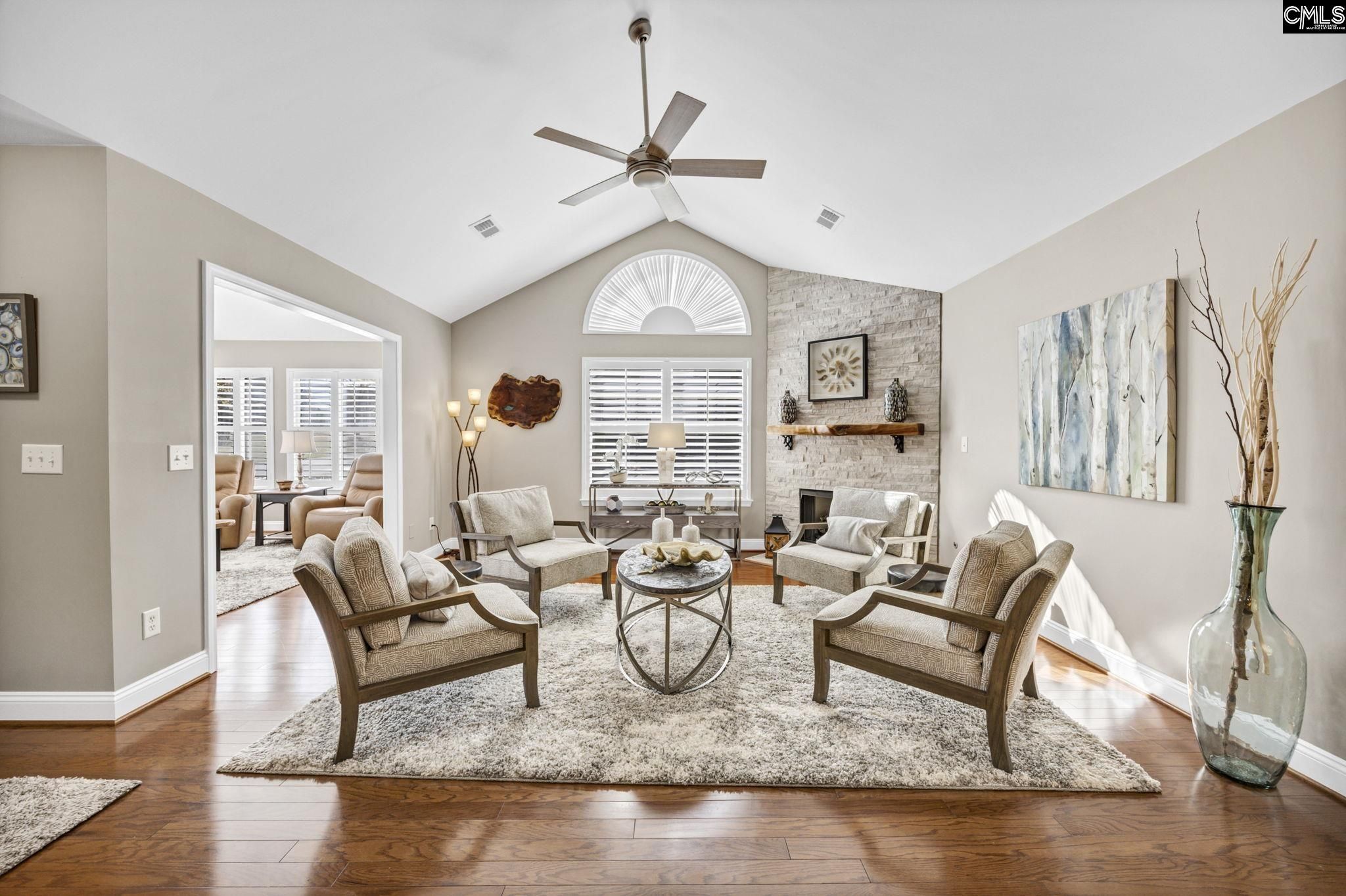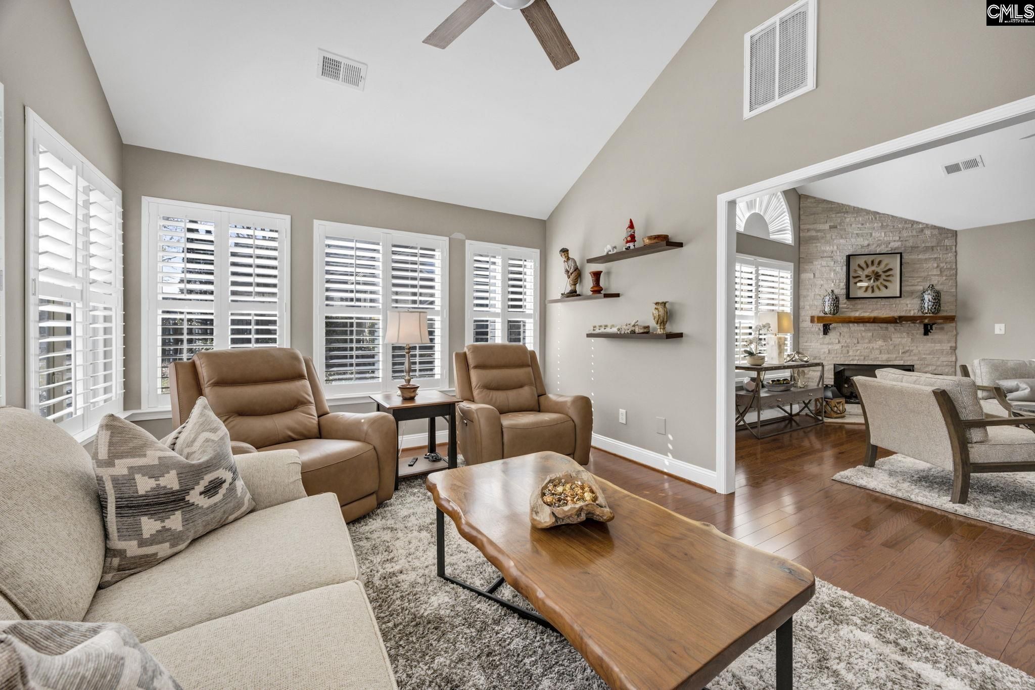 Welcome to 114 Peach Grove Circle, where style, comfort, and low-maintenance living come together beautifully. From the moment you step through your private fenced patio, you are greeted by soaring vaulted ceilings and an inviting open-concept layout filled with natural light and gleaming hardwood floors. The living room makes a statement with its stacked stone fireplace and custom hand-carved wood mantle, creating a warm and sophisticated focal point. Just beyond, the sunroom offers additional living space perfect for relaxing or entertaining, all bathed in sunlight. A versatile flex room with French doors provides the ideal space for a home office, library, craft room, or second living area. The spacious dining area flows seamlessly into the well-appointed kitchen, featuring granite countertops, a modern tiled backsplash, stainless steel appliances, and abundant cabinetry. A built-in desk area adds both function and convenience for everyday living. Tucked away for privacy, the large laundry room includes cabinetry, a sink, and an additional storage closet. The primary suite is a true retreat with vaulted ceilings, decorative panel molding, and a luxurious en suite bathroom complete with a double vanity, granite countertops, and a fully tiled walk-in shower. The space continues into a walk-in closet with custom built-ins. The secondary bedroom also features vaulted ceilings, a stylish acoustic slat accent wall, and access to a beautifully updated bathroom. Located in the desirable Peach Grove Villas community, residents enjoy a low-maintenance lifestyle with access to amenities including a clubhouse and pool. This is easy living at its finest. Disclaimer: CMLS has not reviewed and, therefore, does not endorse vendors who may appear in listings.