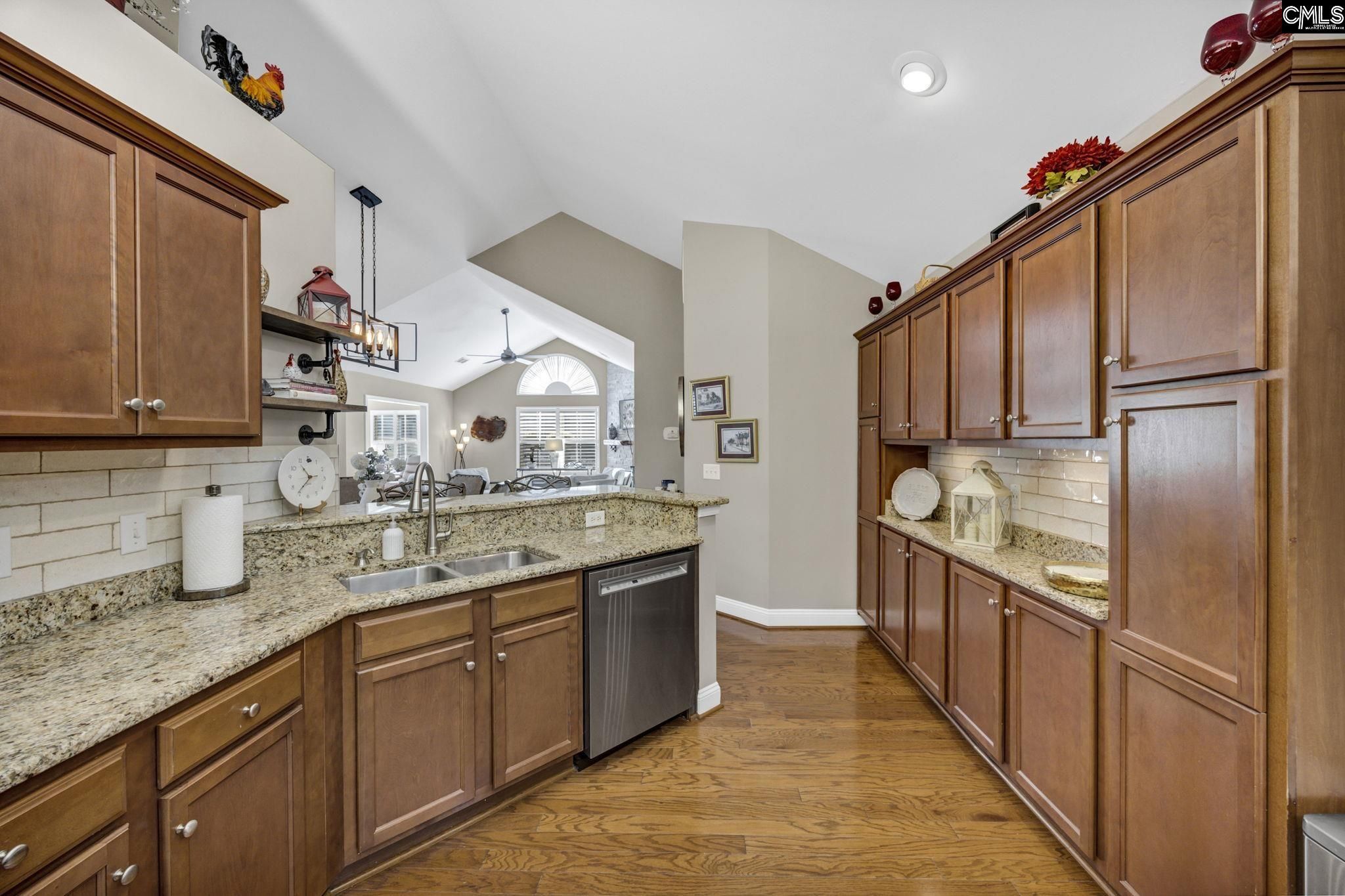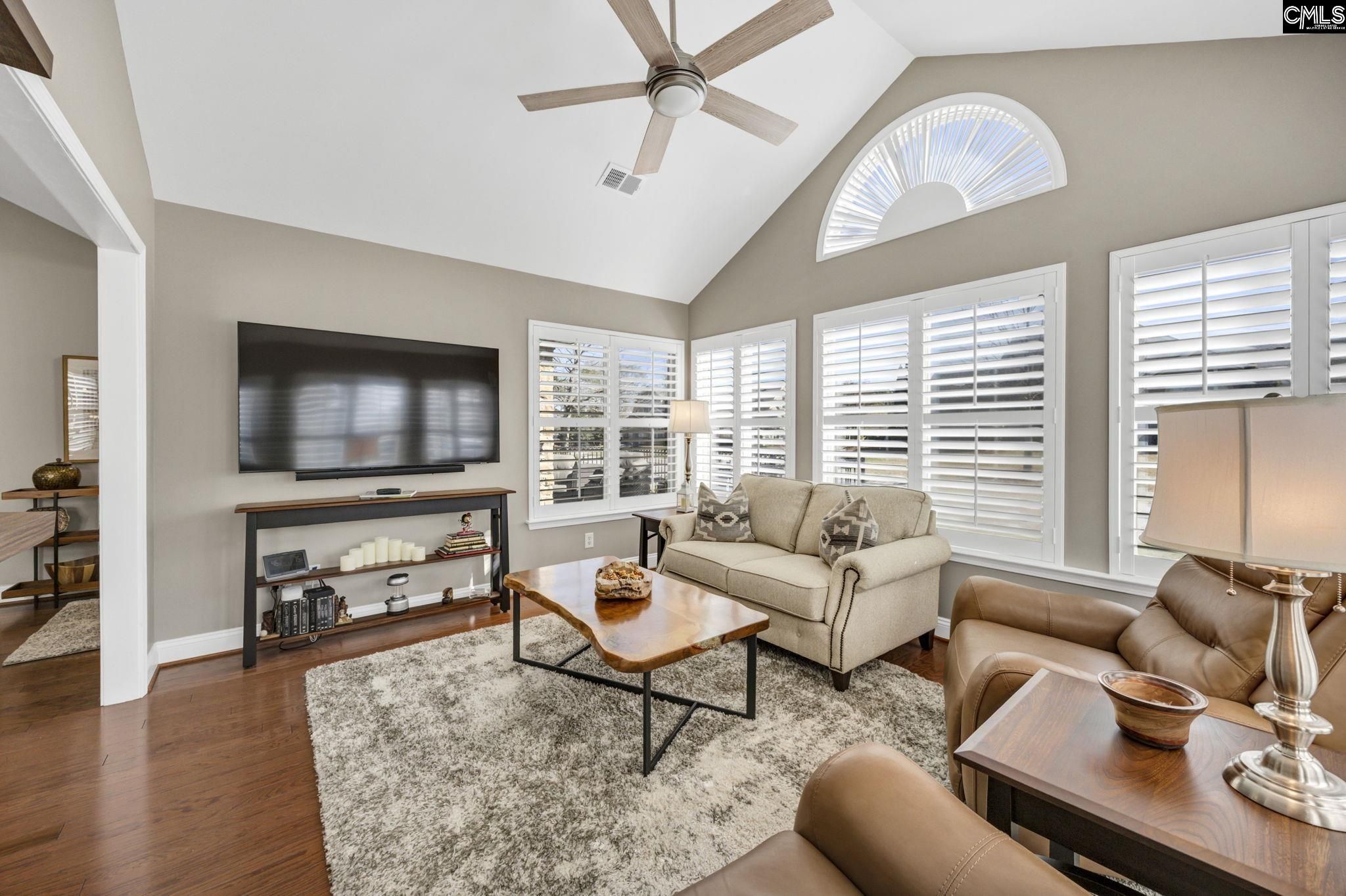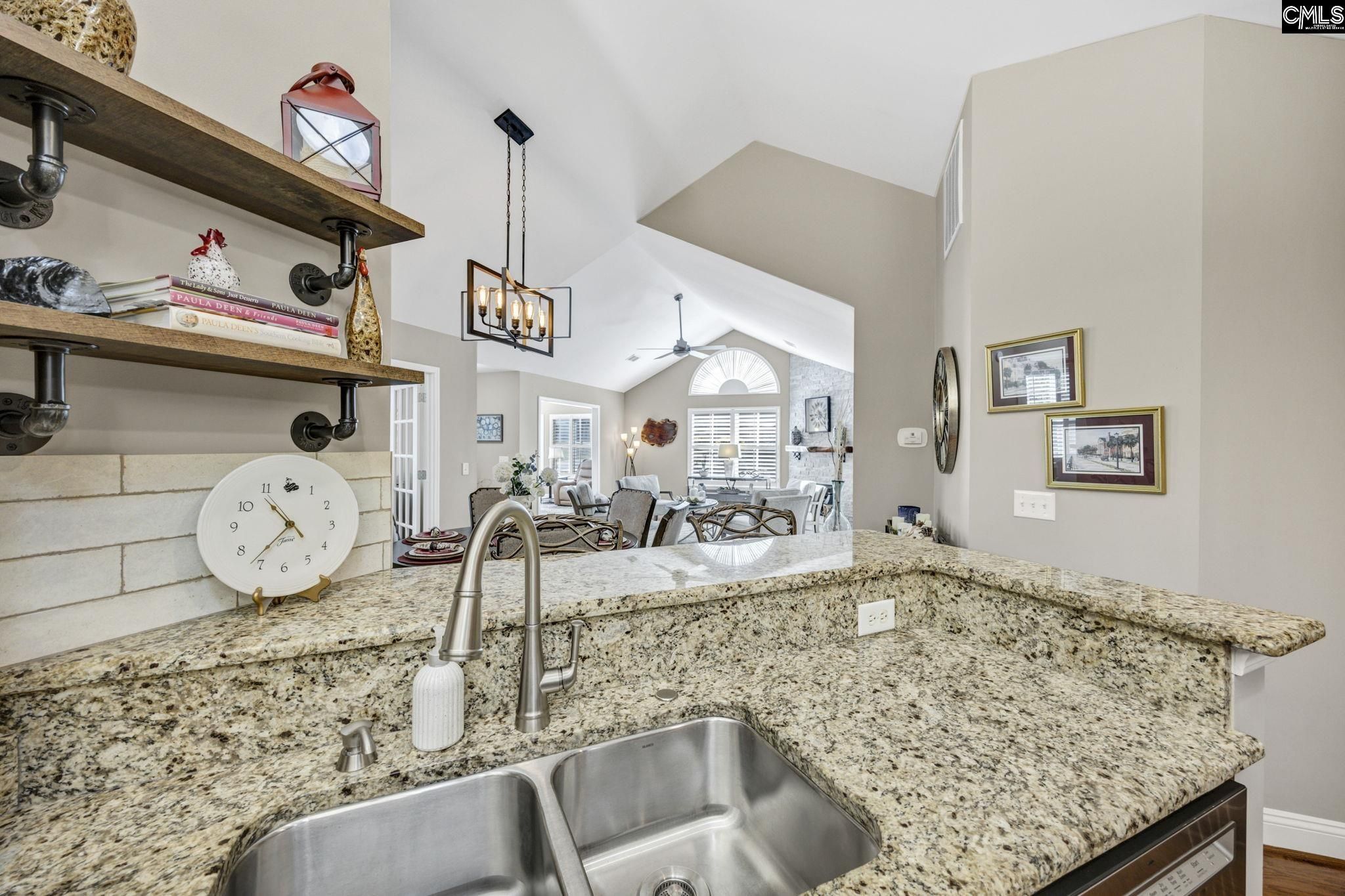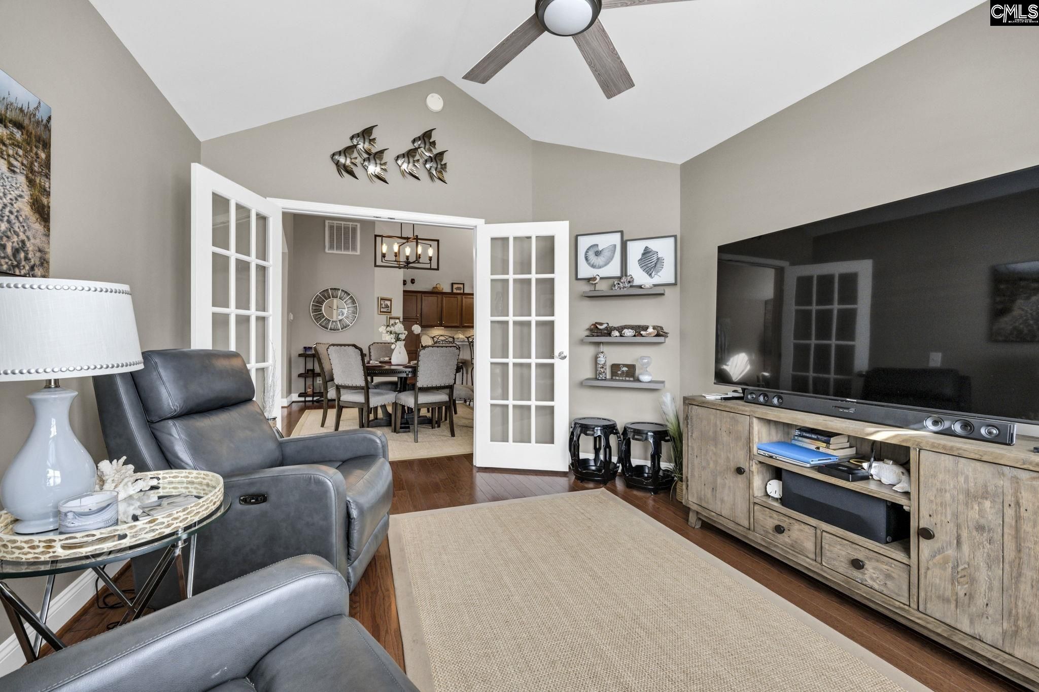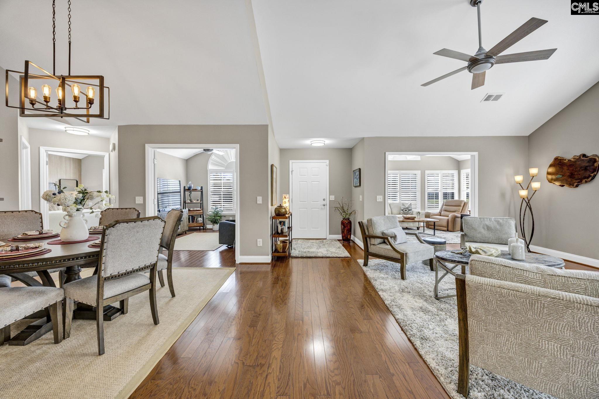 Welcome to 114 Peach Grove Circle, where style, comfort, and low-maintenance living come together beautifully. From the moment you step through your private fenced patio, you are greeted by soaring vaulted ceilings and an inviting open-concept layout filled with natural light and gleaming hardwood floors. The living room makes a statement with its stacked stone fireplace and custom hand-carved wood mantle, creating a warm and sophisticated focal point. Just beyond, the sunroom offers additional living space perfect for relaxing or entertaining, all bathed in sunlight. A versatile flex room with French doors provides the ideal space for a home office, library, craft room, or second living area. The spacious dining area flows seamlessly into the well-appointed kitchen, featuring granite countertops, a modern tiled backsplash, stainless steel appliances, and abundant cabinetry. A built-in desk area adds both function and convenience for everyday living. Tucked away for privacy, the large laundry room includes cabinetry, a sink, and an additional storage closet. The primary suite is a true retreat with vaulted ceilings, decorative panel molding, and a luxurious en suite bathroom complete with a double vanity, granite countertops, and a fully tiled walk-in shower. The space continues into a walk-in closet with custom built-ins. The secondary bedroom also features vaulted ceilings, a stylish acoustic slat accent wall, and access to a beautifully updated bathroom. Located in the desirable Peach Grove Villas community, residents enjoy a low-maintenance lifestyle with access to amenities including a clubhouse and pool. This is easy living at its finest. Disclaimer: CMLS has not reviewed and, therefore, does not endorse vendors who may appear in listings.