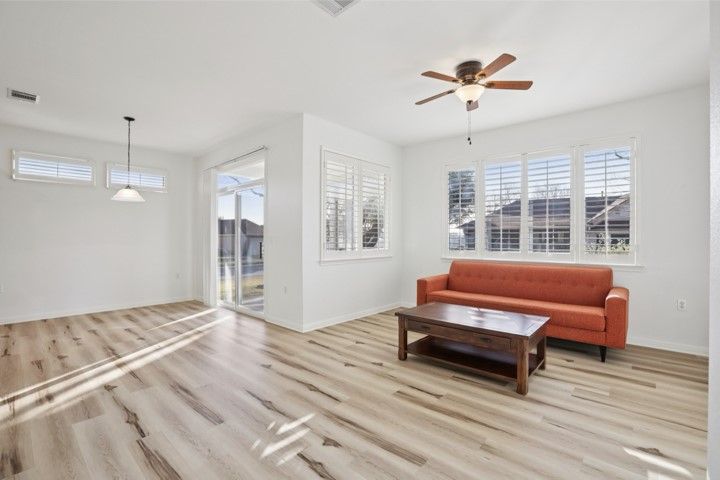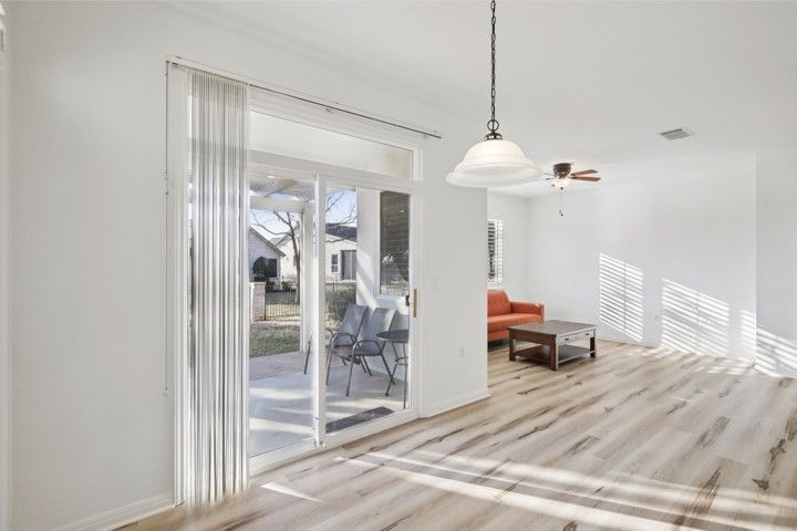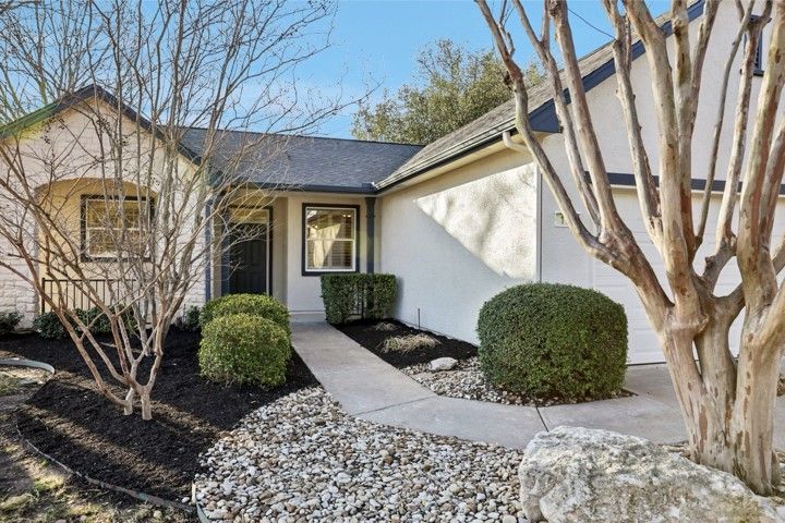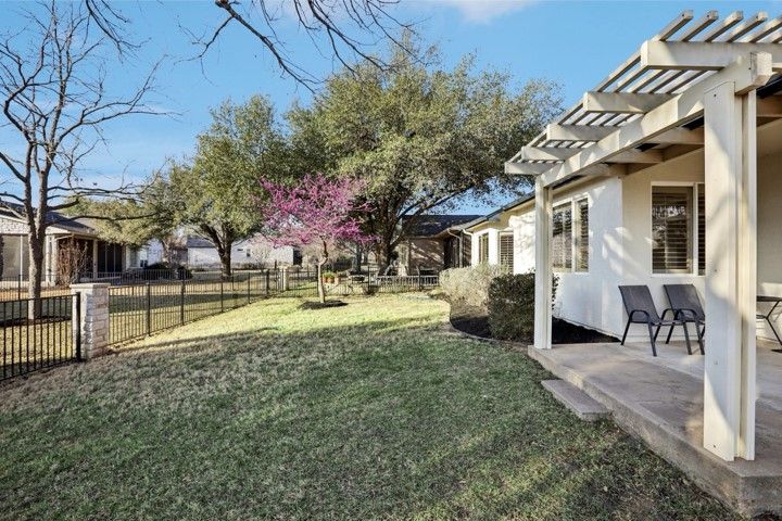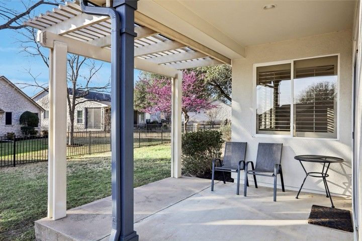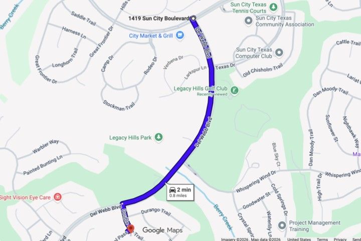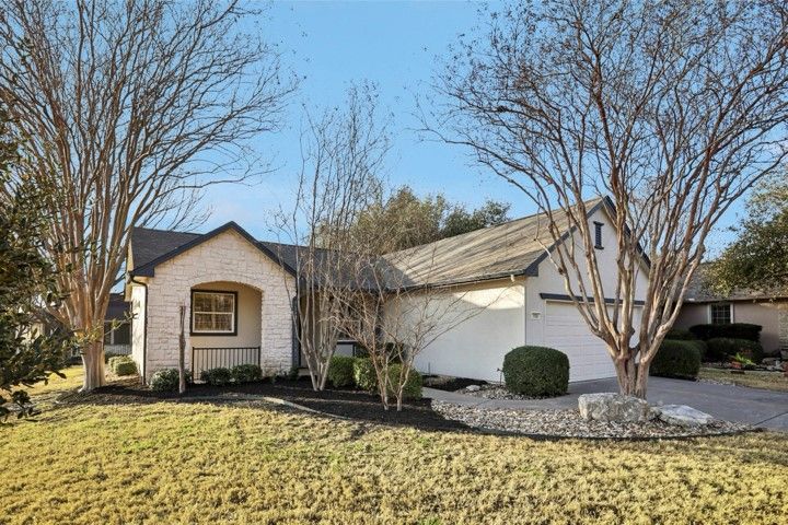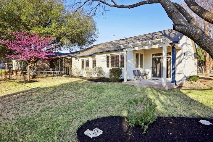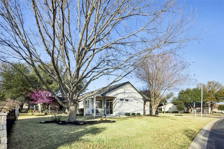 They found it the way most people find the right home in Sun City — not by searching, but by recognizing it. A single-story Littlefield on a corner lot at Sotol Pass, with two front trees, a backyard oak, and crepe myrtles along the walkway. East-facing rear porch for morning light and cool evening shade. Stone and stucco, no front entry steps — built to age in place without feeling like you're aging at all. Since 2021, the owners have steadily updated from the inside out: replaced HVAC, luxury vinyl plank flooring in living areas and bedrooms, both toilets replaced, GE gas stove, washer/dryer, upgraded faucets in the main bath and kitchen, water softener, LED garage lighting, grab bars in the main bath, and kitchen/entry tile professionally cleaned and sealed. New this year — full interior and exterior paint, fresh premium black mulch beds, new window screens, LED ceiling lights in the kitchen and entry, and the entire home professionally cleaned including windows. Plantation shutters dress every window. This home doesn't show like 2000. It shows like yesterday. The open plan connects the family room to a kitchen with maple cabinetry, stainless appliances, and solid surface counters. Sliding glass doors open to the covered patio with pergola — the kind of spot where coffee becomes a two-hour conversation. The primary suite has a bay window and barn door to the en suite bath and walk-in closet. The second bedroom works as a guest room or office, with a full bath and granite vanity down the hall. Two-car garage with built-in storage and floored attic access. Sprinklered lot, partial wrought iron fencing, and Zoysia sod under the oak stays green when everything else goes dormant. Legacy Hills Country Club is six-tenths of a mile away; City Center and major amenities under a mile. 2025 tax assessed value: $308,107. No steps. No flood zone. No deferred maintenance. Every known issue addressed — move-in ready, down to the last detail.