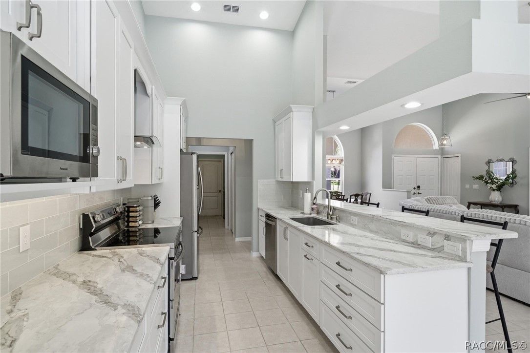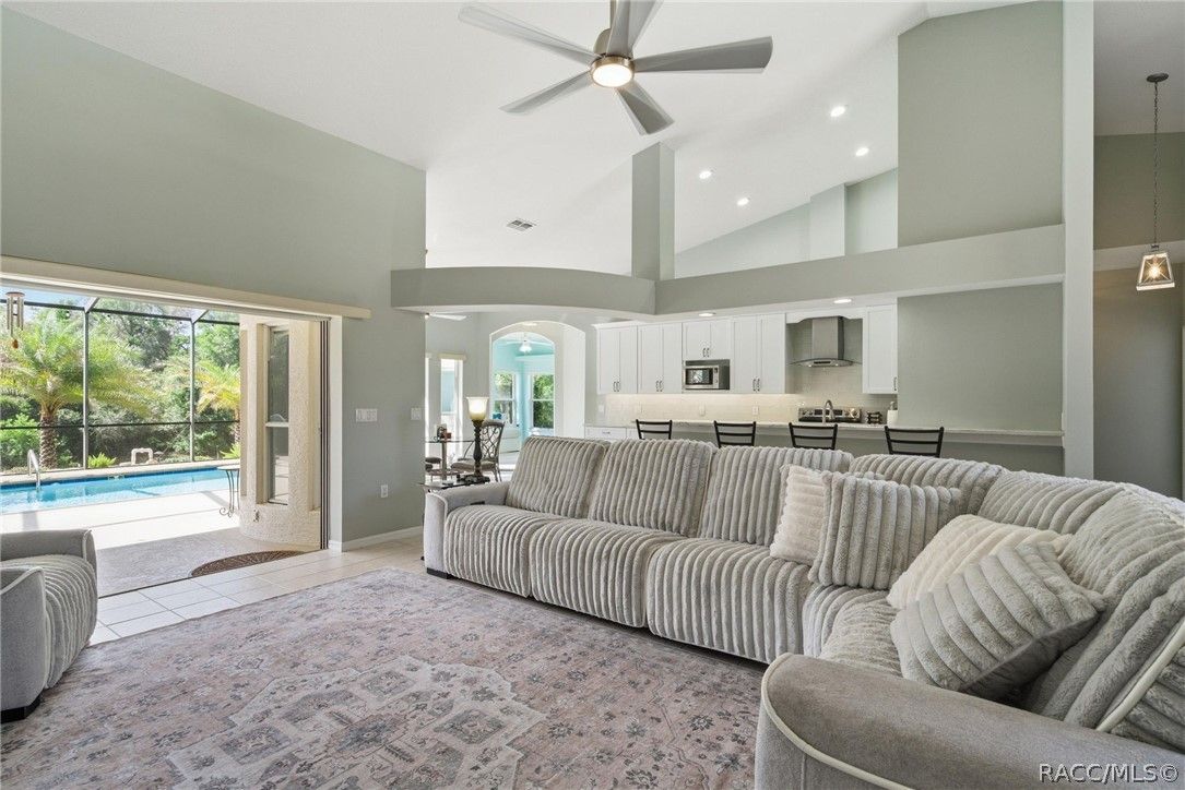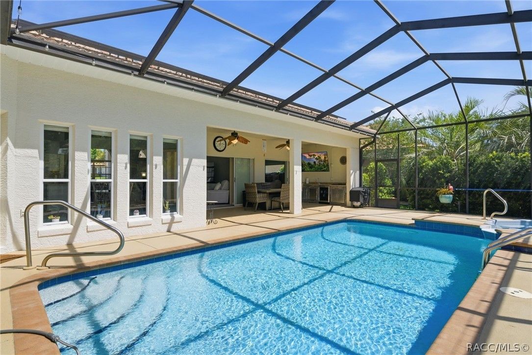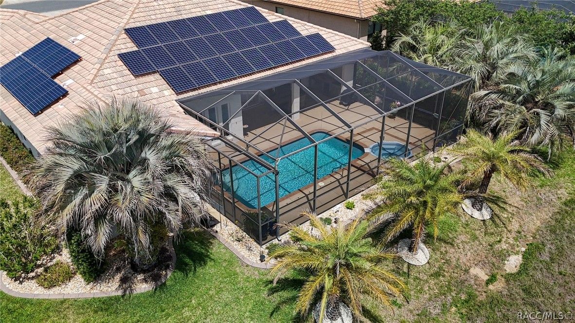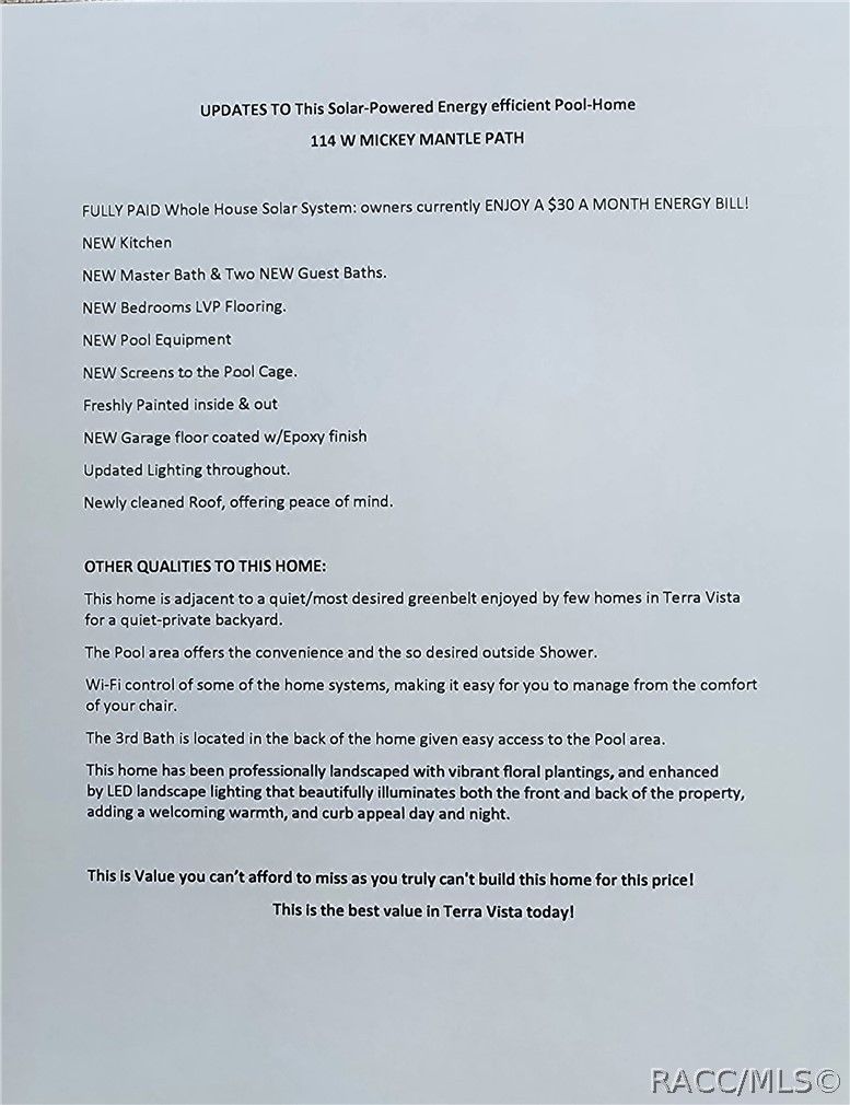 This Solar-Powered Energy efficient Pool-Home in Terra Vista is ready for you! 3 Bedrooms, Den, 3 Baths, 2 Oversize Car Garage, on private greenbelt & surrounded by beautiful homes within short distance to the Activity Center. Terra Vista is a Premier Golf resort Community. Designed for discerning buyers seeking year-round sunshine & vibrant lifestyle. Everyone will envy the incredible Savings of the FULLY PAID Whole House Solar System: owners currently ENJOY A $30 A MONTH ENERGY BILL! Several UPDATES done in the last 3 years, NEW Kitchen & Baths. NEW LVP Flooring. NEW Pool Equipment & NEW Screens to the Pool Cage. Painted inside-out, NEW Garage floor coated w/Epoxy finish, Updated Lighting & Newly cleaned Roof. This is such great Value as you truly can't build this home for this price! Designed w/Open Great Room, Dining Room & Kitchen is entertainer’s delight, and it doesn’t disappoint. The Gourmet Kitchen shines with White custom soft-close Cabinetry, ample storage, Quartz Counter, Stainless Appliances, & 2 Pantries. Tile flooring & LVP Flooring for easy maintenance. This Home is bright & cheerful, the POCKET GLASS DOORS bring the outside in! Step into your private backyard oasis, the Lanai & large screen enclosure, equipped w/Summer Kitchen & outside Shower. Picture yourself enjoying the inviting Salt-Water/Heated Pool & Spa while sipping your favorite drink to truly experience Paradise! This home is adjacent to a quiet/most desired greenbelt enjoyed by few homes in Terra Vista for a quiet-private backyard. Plus Wi-Fi control of some home systems, making it easy for you to manage from the comfort of your chair. The Master Suite, offers a spa-like retreat w/a newly renovated Bath w/walk-in shower, His & Her Vanities w/Granite Countertops, Make-up Counter, custom Lighting & updated finishes. 2 Guest Bedrooms & Den are in the opposite side of the home, Guest Bathrooms are beautifully renovated. The Den is used as Flex-Office/4th Bedroom for work or play. Den & 3rd Bath are in the back of the home for easy access to the Pool area. The Inside Laundry Room is ample w/nice storage. The Angled-Oversized garage w/storage for golf cart, or workshop. The Tile Roof was just soft washed, offering peace of mind. This home has been professionally landscaped w/floral plantings & enhanced by LED landscape lighting that beautifully illuminates both the front & back of the property, adding a welcoming warmth, and curb appeal day and night. Enjoy Terra Vista's resort-style living Amenities. Dancing at the Tiki-Bar, playing golf, pickleball, tennis, staying active at the fitness center, spa, sauna, restaurants, trails, & social activities. You can also, Explore Citrus County restaurants, shops & its Nature Playground w/biking, hiking, kayaking, boating, fishing, snorkeling, cave diving & swimming w/manatees. The new Suncoast Parkway extension makes commuting to Tampa & Orlando easier than ever! If you’re looking for the perfect blend of luxury, comfort & community, this beautiful home is waiting for you!