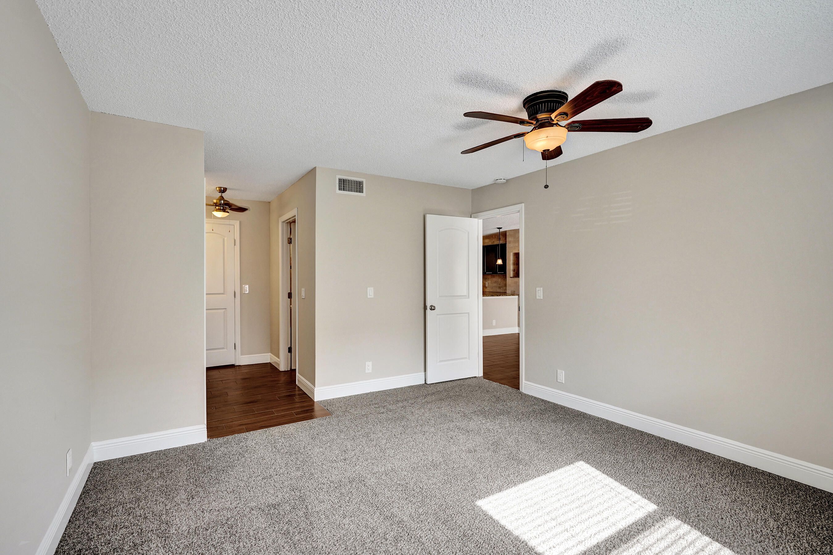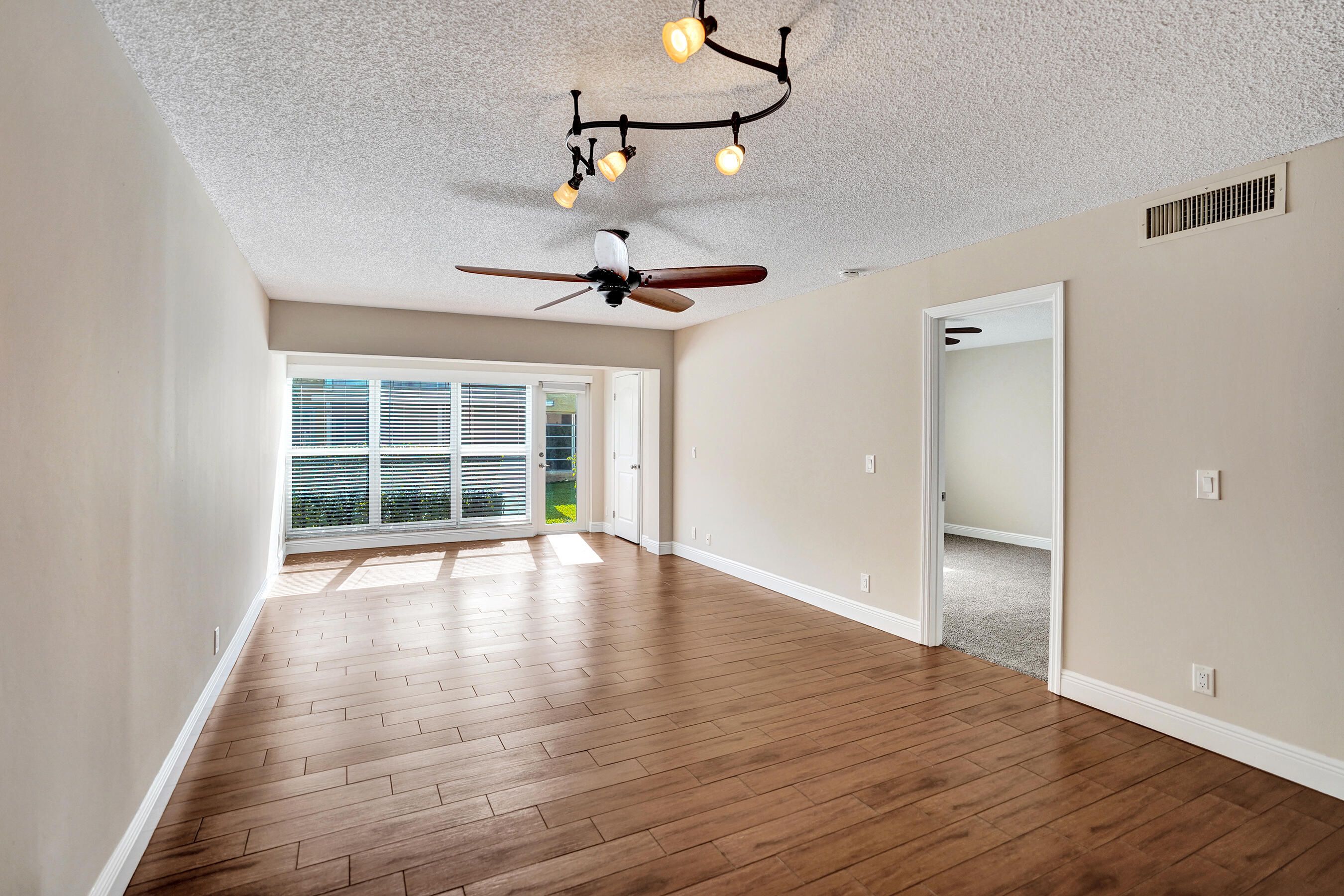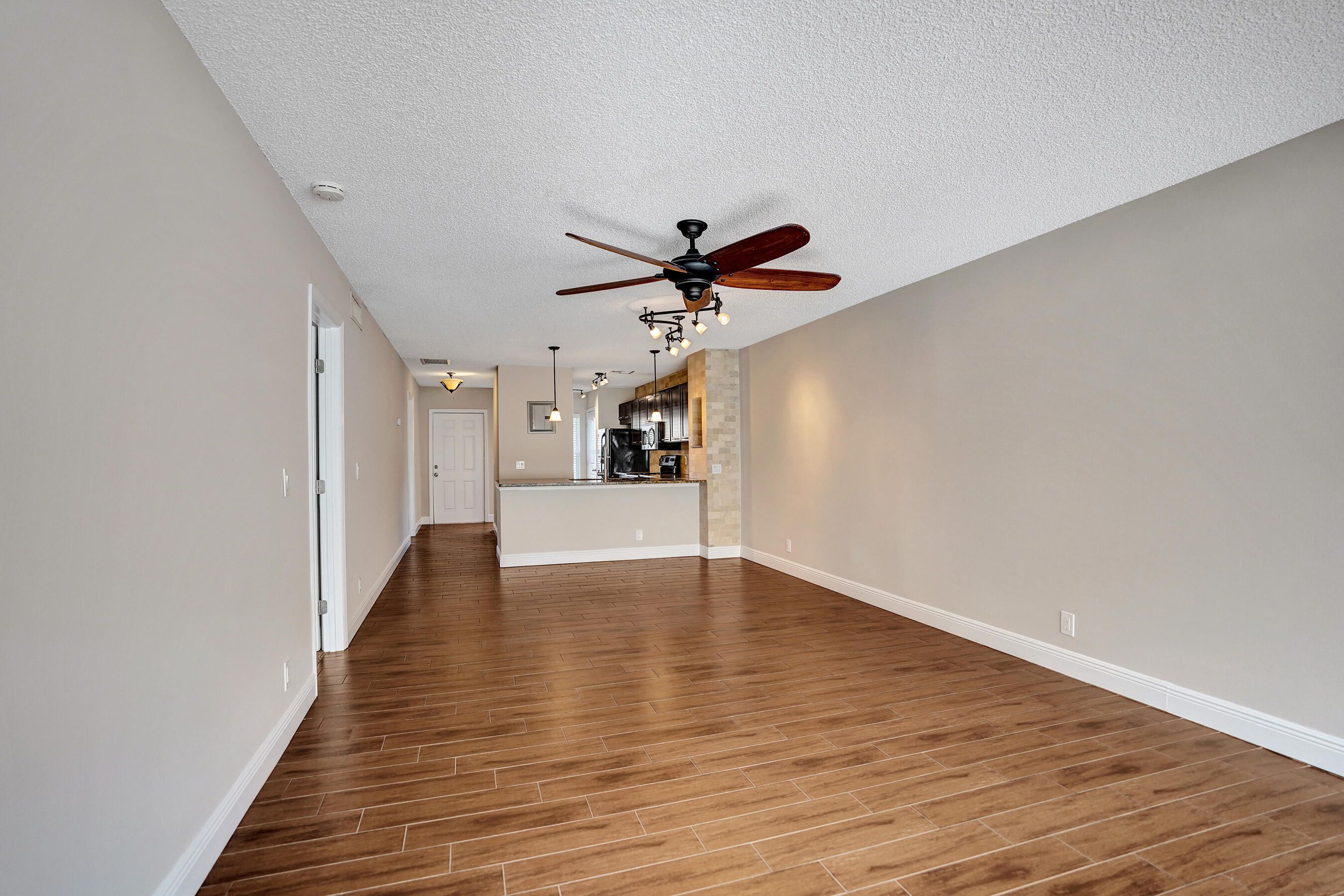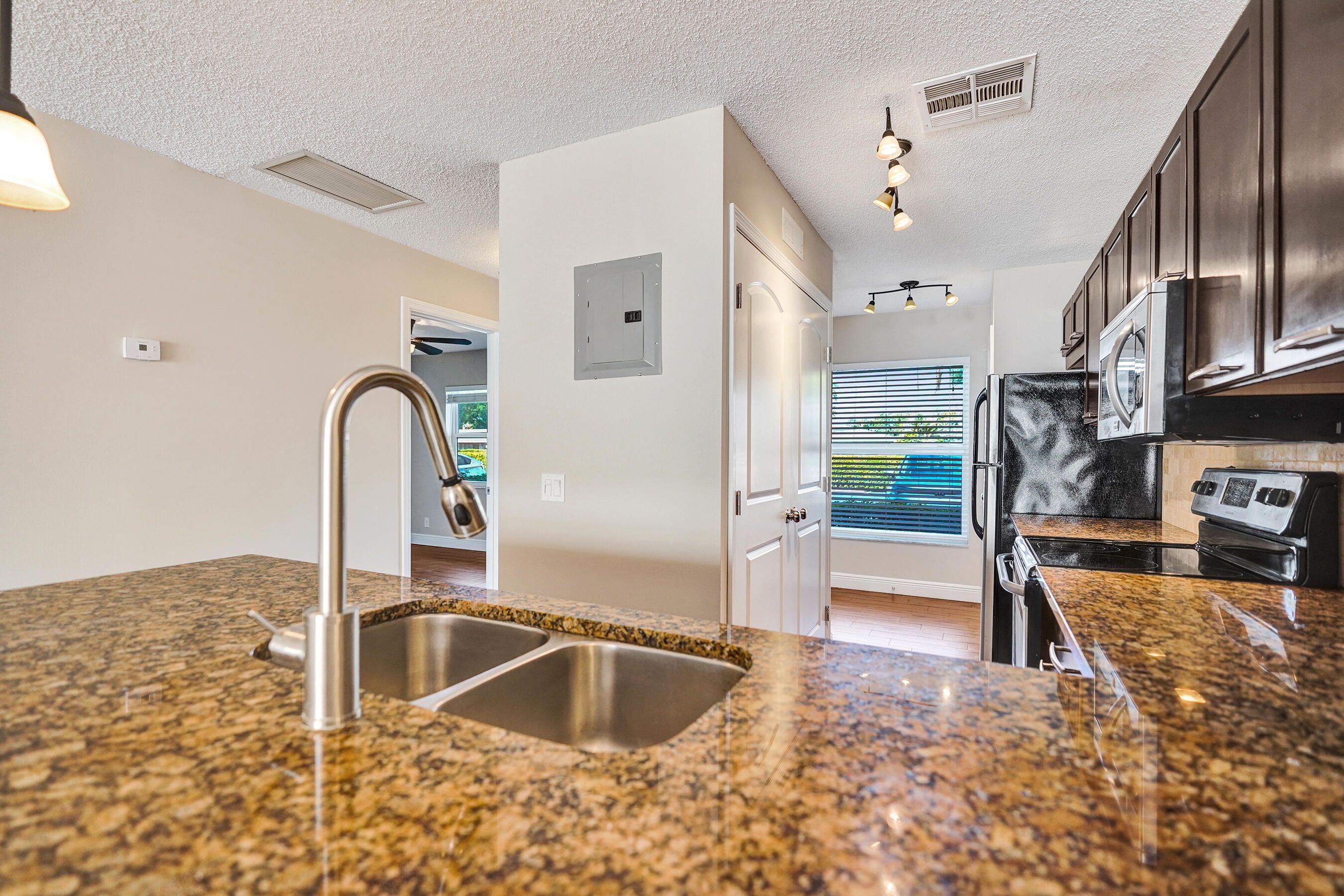 Exceptional 1st floor renovation with custom home designer finishes. Spanning 1,167 square feet of contemporary living space, this home features 2 spacious bedrooms and 2 luxurious bathrooms. Newly painted and with flooring that is primarily a stylish 24" x 6" ceramic wood tile, the property shines. Plus it showcases all hurricane impact glass windows and doors. The open kitchen design integrates with the living area and boasts custom wood cabinetry, granite countertops, tumbled marble backsplash, a double door laundry closet with full size washing machine (with cabinetry above). The bathrooms and master dressing area are equipped with modern granite- top vanities, custom tiled walk-in showers and 2 vessel sinks in the master suite And the property is equipped with a 2026 AC SYSTEM. . The residence spans 1,167 square feet of contemporary living space - where modern design meets comfort. This home features two spacious bedrooms and two luxurious bathrooms - each thoughtfully designed with high end finishes. A newly painted interior and 24" x 6" ceramic wood tile throughout (except for the newly carpeted master bedroom) make this property shine.. The home showcases all PGT FLORIDA 7/16th inch hurricane impact glass windows, a PGT FLORIDA hurricane impact French out swing back door with 7/16th" glass and a JELD-WEN hurricane impact front door- making this residence as secure as it is stylish. The heart of the residence is the open kitchen design that seamlessly integrates with the living area, creating a perfect flow for entertaining. The kitchen boasts custom wood cabinetry, granite countertops, tumbled marble back splash and upper walls, dual 9" deep stainless steel sinks, a double door laundry closet with full size side-by-side washing machine and dryer (as well a coffee bar and additional cabinetry above) and a separate full size pantry closet. The bathrooms and master dressing area offer modern granite-top vanities and custom tiled walk-in showers, while the master suite boasts 2 Fresca Adoura vessel sinks . The property is equipped with a 2026 energy efficient 2-ton 14.3 SEER Rheem "Endeavor" AC system, a 2020 Rheem 28-gallon water heater (with 3500 watt elements) and a USA-manufactured Eaton indoor load center (electrical panel).Plus you'll enjoy the comfort of three oversized paddle fans that enhance airflow throughout the rooms. EQUIPMENT: AC SYSTEM: Installed in 2026 RHEEM Endeavor Line Select Series iC RHEEM CONDENSER M# WSA14AY24AJ1NA S# W512519589 2 Ton; 14.3 SEER2, 11.7 EER2; 208/230/1/60, R-454B Refrigerant;Fully Louvered Steel Cabinet; Optimized 7mm Coil Design; PlusOne Refrigerant Detection System 2; Single Stage Scroll Compressor; 76 dBA. RHEEM HANDLER M# RB2TY2417STANMJB05 S#: W402513103 Constant Torque Motor, Two-Stage Airflow, 14.3 SEER2; Thermal Expansion Valve. RHEEM WATER HEATER: (2020) M# PROE28S2RU95 S# Q402073924 28 gallon capacity; Isolated tank design;Resistored 3500 watt stainless steel upper and lower heating elements; Premium grade anode rod; Over-temperature protector; Automatic thermostat; Ruudglas tank lining; T & P relief valves. PGT FLORIDA HURRICANE IMPACT WINDOWS (2021) M# PGT 7700A Series 7/16th" thickness: Window Specs: MDCA Butacite PVB; 16 CFR 120111; ANSI Z971 2015; 7/16th" U A SGCC #2472; 0013 05/28/2021 L2. PGT FLORIDA HURRICANE IMPACT BACK DOOR M# PGT 101 Series French Outswing door with 7/16th" glass JELD-WEN HURRICANE IMPACT FRONT DOOR M# FRC JEL-M-2 S# 11-02604243 Steel Wood Edge Door (EDSL); Strong and durable the door includes include wood stiles and rails with mitred top corners to prevent water absorption. Galvanized steel facings. EATON INDOOR LOAD CENTER (ELECTRICAL PANEL) M# BRP12B100 FRESCA VESSEL SINKS (2) M# FVS8110WH Fresca Adour white ceramic vessel sinks are beautiful basins with a smooth, round shape.The overall dimensions are 15.5''W x 15.5''D x 6''H. It commands attention, yet is elegant and stylishly simple. GLACIER BAY TOILETS (2) M# 686-826 All-in-one high efficiencty toilets; chair height; elongated bowls; 1.28 GPF. APPLIANCES: FRIGIDAIRE REFRIGERATOR M# FFTR1814QS0 S# BA43742150 30 Inch Top-Freezer Stainless Steel Refrigerator with Gallon Door Storage, Dairy Bin, Icemaker, Store-More Humidity Controlled Crisper Drawers, Sliding Wire Shelves and 18.0 cu. ft. Capacity. FRIGIDAIRE RANGE M# LFEF3048QFA S#VF44005059 30-in Glass Top Stainless Steel Electric Range;5.3-cu ft capacity oven; 4 elements, including 1 dual and 1 extra-large element; 2 oven racks with 6 possible positions; 12-hour automatic shut-off feature; 1-touch self-cleaning; Smooth cooktop surface; Ready-Select electronic controls. FRIGIDAIRE MICROWAVE OVEN M# FGMV175QFA S# KG43014086 30 Inch Over-the-Range 1.7 cu ft. capacity Microwave Oven with SpaceWise, Effortless Sensor Cooking, One-Touch Options, Ducted/Ductless Option, 1000 Cooking Watts and 300 CFM Venting System: Stainless Steel FRIGIDAIRE DISHWASHER M# LFBD2409LF0B S# TH44291849 Front Control 24-in Stainless Steel Dishwasher,)ENERGY STAR, 55-dBA; SpaceWise® multi-compartment, removable silverware basket; 5 wash cycles with Precision wash technology; Fits-More capacity with a tall tub design fits up to 14 place settings INSINKERATOR GARBAGE DISPOSAL M# BADGER 5-89 S# 222061446181 1/2 HP, 26 oz grind chamber capacity; Dura-Drive induction 1725 RPM motor, galvanized steel grind components and stainless steel swivel lugs. MAYTAG WASHING MACHINE M# MVWC425BW1 S#: C43634295 27 Inch Top-Load Washer with 3.8 cu. ft. Capacity, 11 Wash Cycles, Power Wash Cycle, 5 Water Temperatures, Water Level Sensor and Stainless Steel Drum. WHIRLPOOL DRYER M# WED4815EW1 S#: M74556811 29 Inch 7.0 cu. ft. Capacity Electric Dryer with 14 Drying Cycles, 4 Temperature Settings, Heavy Duty Cycle, Wrinkle Shield, Cool Down Cycle, AutoDry and Timed Dry. 2026 Monthy Maintenance Fee: $623.00 All 684 units pay the same monthly fee and it includes city water & sewer, Xfinity fiber optic cable (including HBO), Xfinity in-unit WIFI ("inte