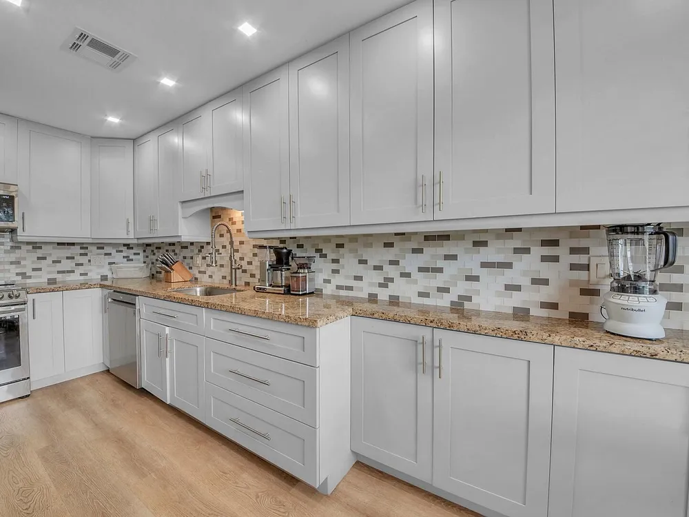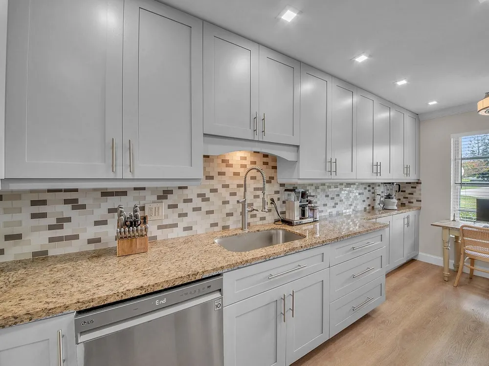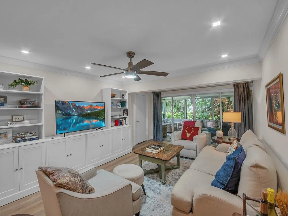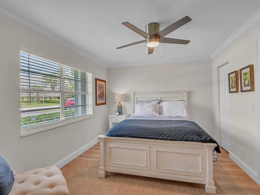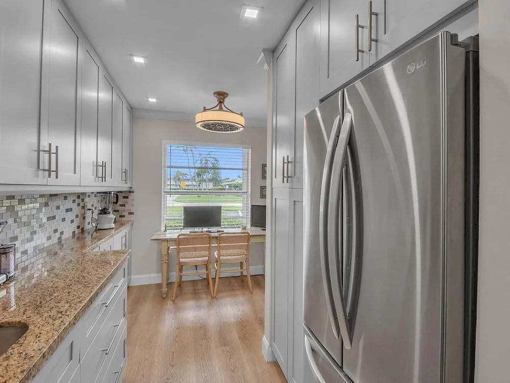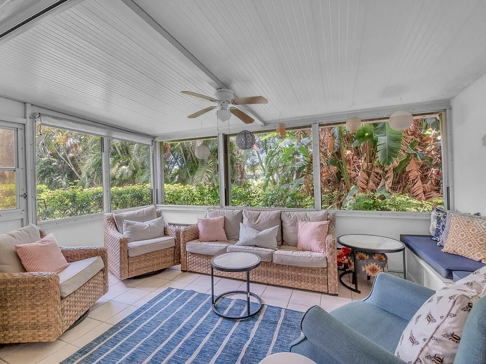 You're going to love this recently remodeled first floor 2BR/2BA condo in the meticulously-maintained 55+ community Pines Of Delray. Twice the amount of cabinet space you usually find in a condo of this size, the new kitchen boasts stainless appliances and lots of granite counter space with under cabinet lighting and self-closing cabinet doors. There is recessed lighting throughout the living spaces, crown molding in every room, and pergola wood floors. A beautiful built-in entertainment center with lots of storage space defines the living room, leading out to a large screened porch with mature tropical flora and fauna offering loads of privacy. Two walk-in closets in the large MBR, and a second en-suite bedroom offers a perfect place for guests, a home office or den.