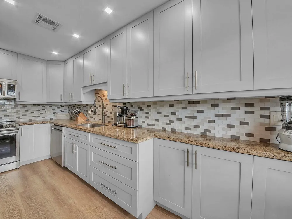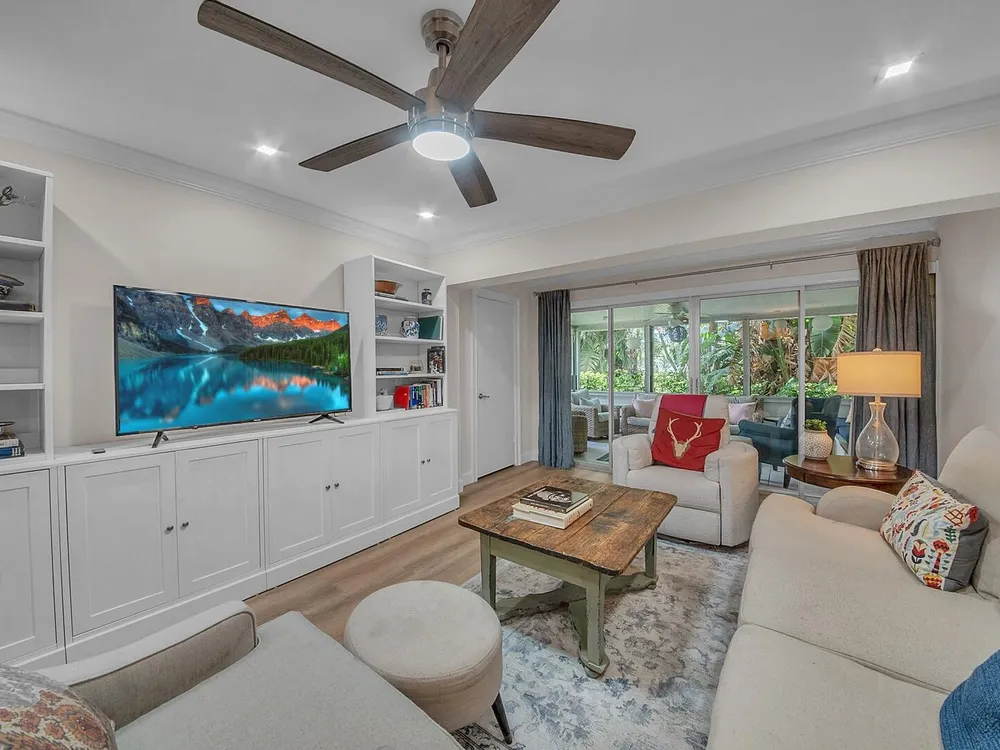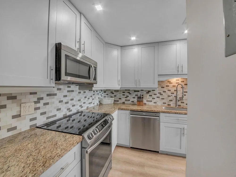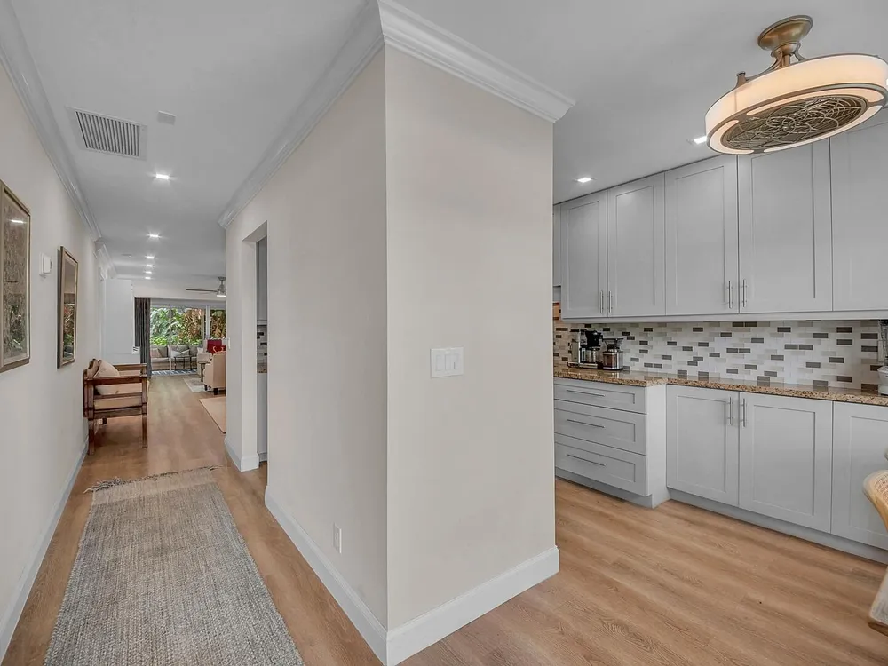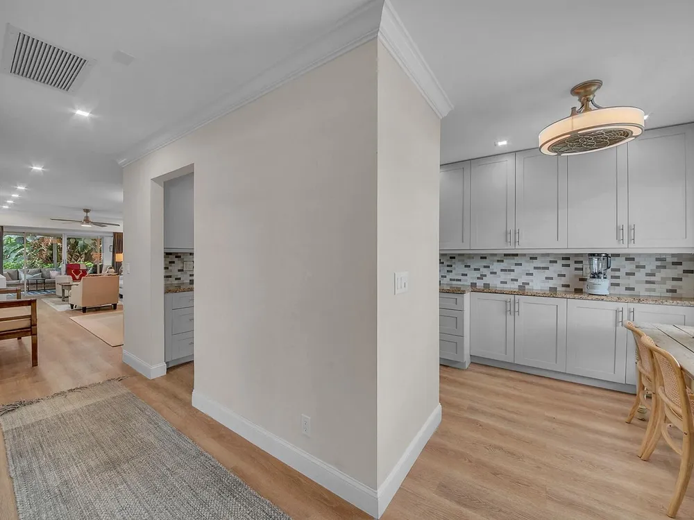 You're going to love this recently remodeled first floor 2BR/2BA condo in the meticulously-maintained 55+ community Pines Of Delray. Twice the amount of cabinet space you usually find in a condo of this size, the new kitchen boasts stainless appliances and lots of granite counter space with under cabinet lighting and self-closing cabinet doors. There is recessed lighting throughout the living spaces, crown molding in every room, and pergola wood floors. A beautiful built-in entertainment center with lots of storage space defines the living room, leading out to a large screened porch with mature tropical flora and fauna offering loads of privacy. Two walk-in closets in the large MBR, and a second en-suite bedroom offers a perfect place for guests, a home office or den.