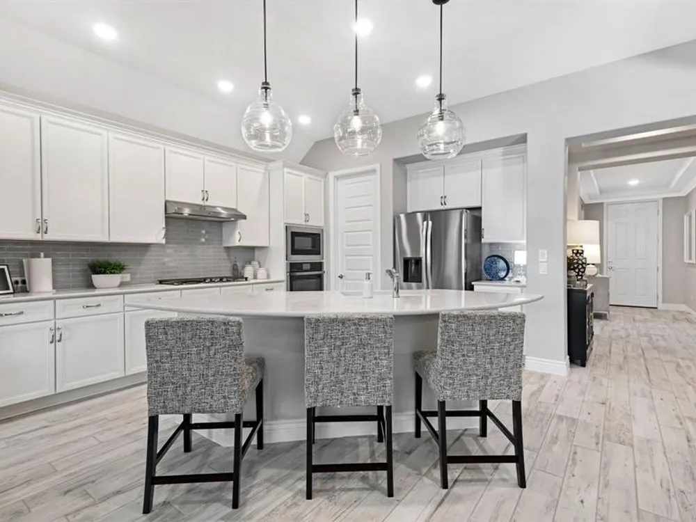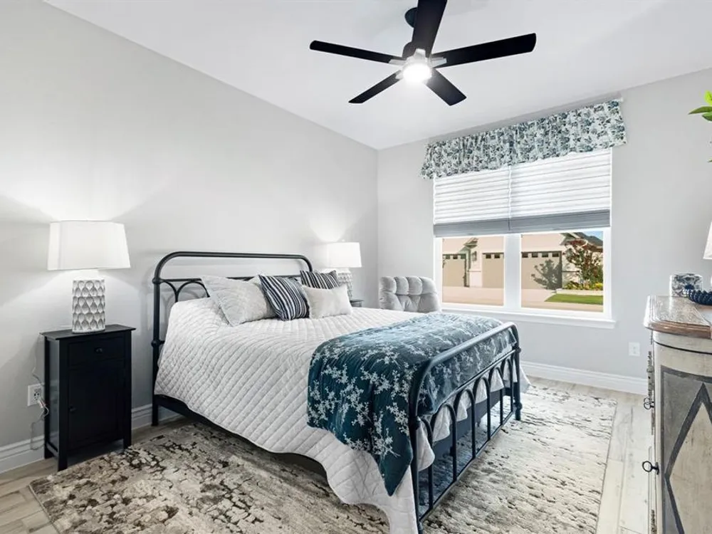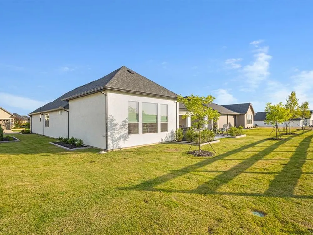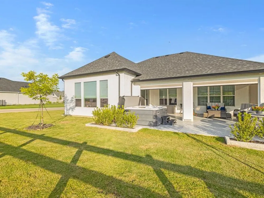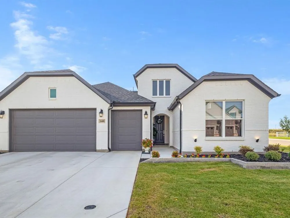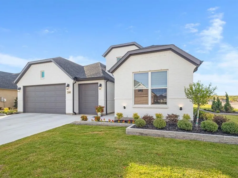 This stunning custom-built home, completed in 2025, showcases the sought-after Fresco Model Elevation B with an elegant white brick exterior. Situated in the heart of the gated and guard-monitored Robson Ranch community, this single-story residence features 2 spacious bedrooms, a versatile den, 2.5 bathrooms, and an oversized 2.5-car garage—perfect for two vehicles plus a golf cart or workshop space. Inside, the home boasts beautiful upgrades throughout, and the back patio is a standout feature, ideal for relaxing or entertaining. The hot tub stays with the house, adding to the home's appeal. Residents of Robson Ranch enjoy a vibrant, resort-style lifestyle with access to exceptional amenities, including 27 holes of championship golf, a clubhouse with a restaurant and bar, indoor and outdoor pools, 16 pickleball courts, tennis courts, bocce ball courts, a state-of-the-art fitness center, an indoor sports building, a beauty salon, saunas, greenbelts, sidewalks, fishing ponds, and scenic walking and biking trails. With engaging community events and activities for every interest, this home offers the perfect blend of comfort, luxury, and active living.