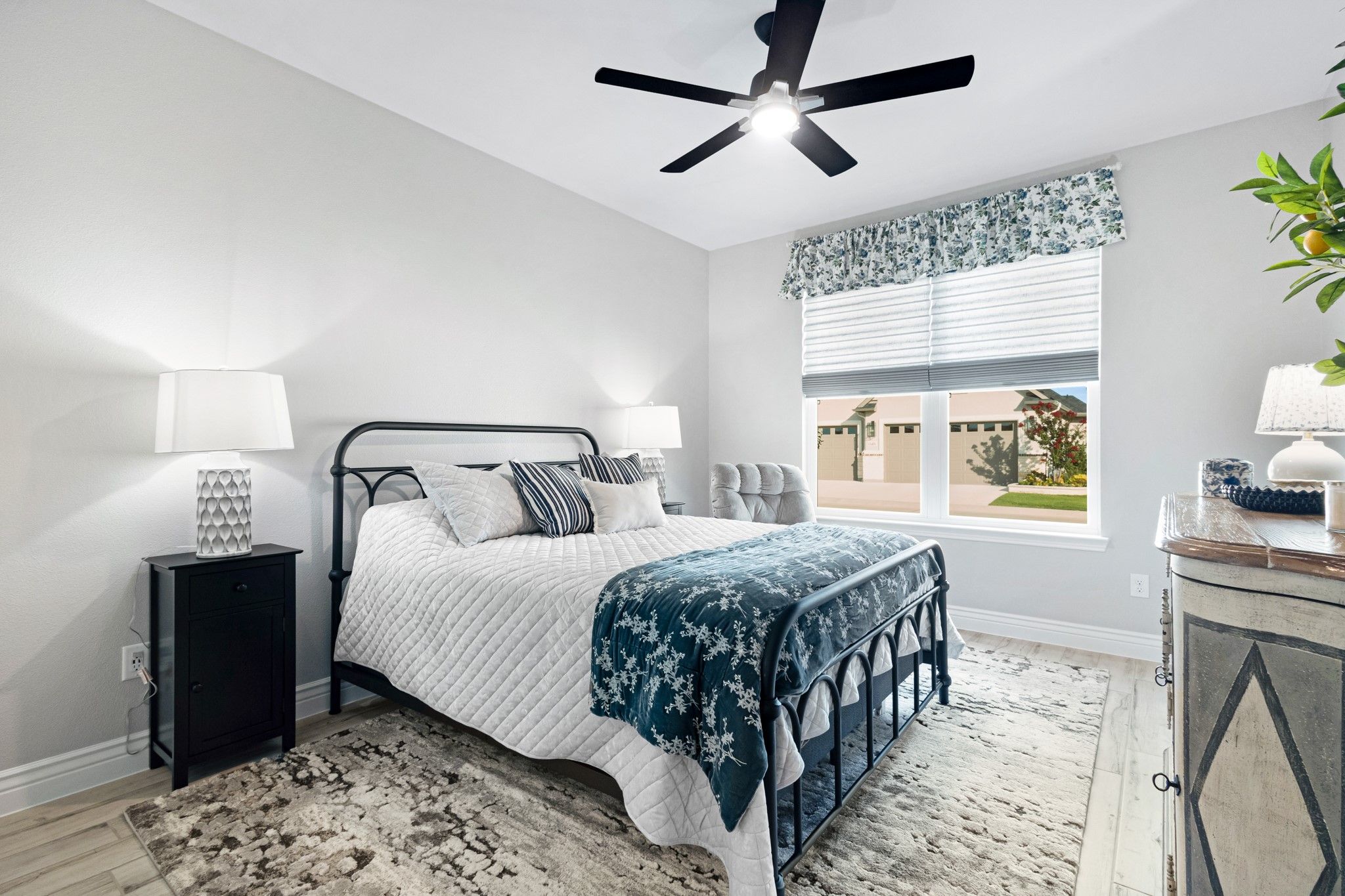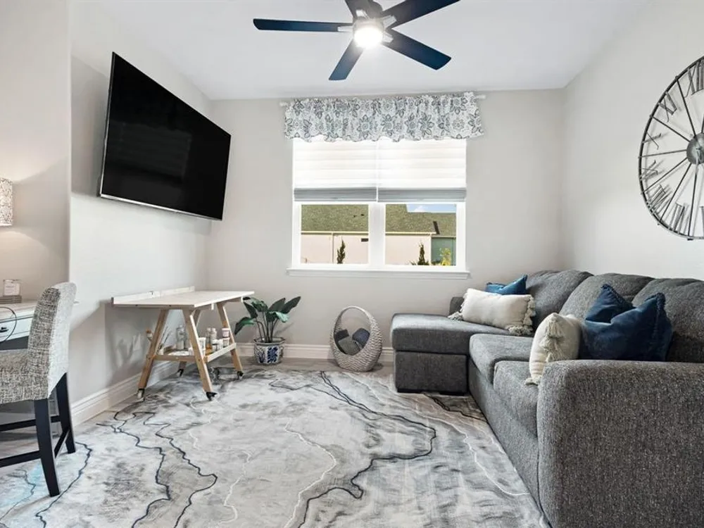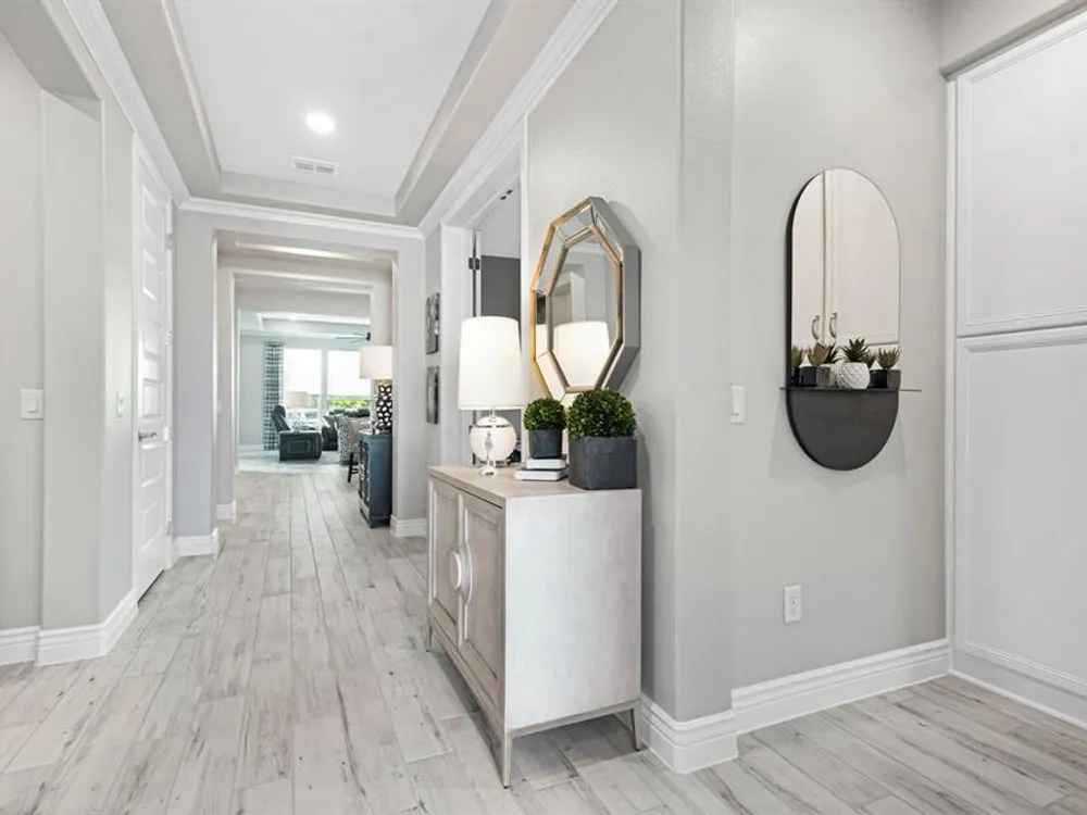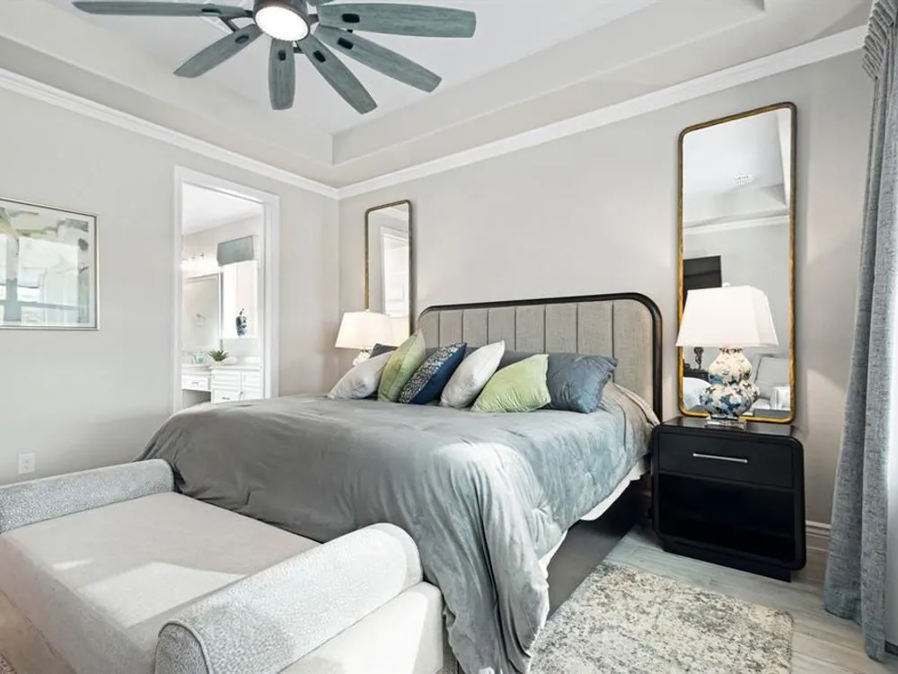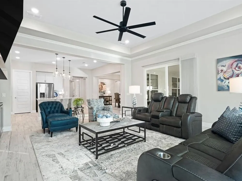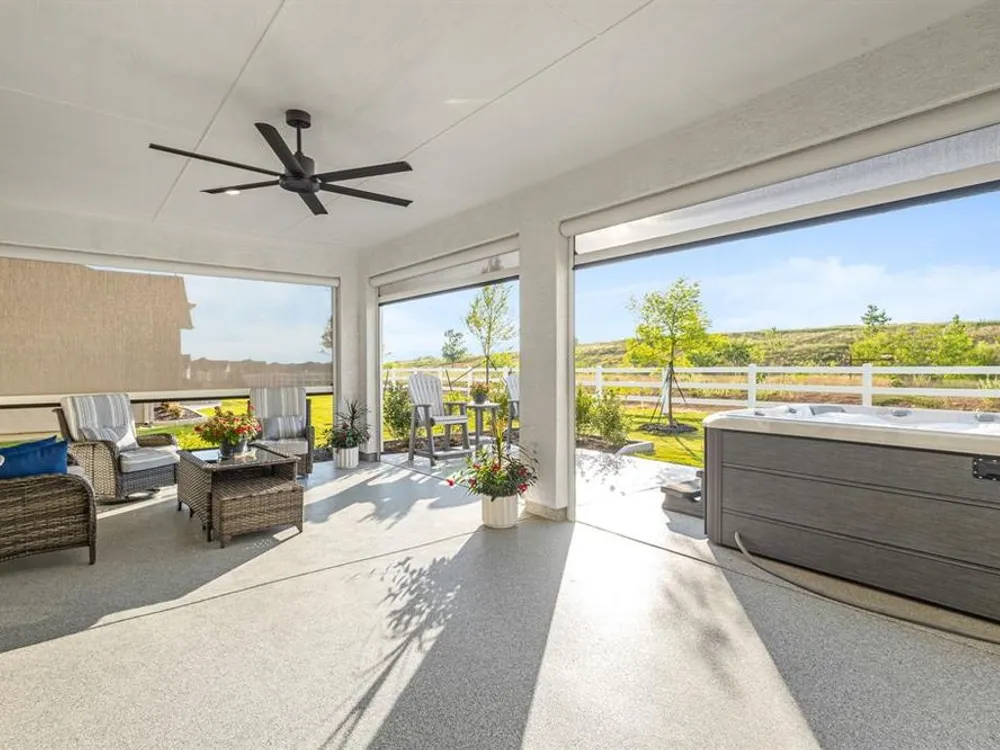 This stunning custom-built home, completed in 2025, showcases the sought-after Fresco Model Elevation B with an elegant white brick exterior. Situated in the heart of the gated and guard-monitored Robson Ranch community, this single-story residence features 2 spacious bedrooms, a versatile den, 2.5 bathrooms, and an oversized 2.5-car garage—perfect for two vehicles plus a golf cart or workshop space. Inside, the home boasts beautiful upgrades throughout, and the back patio is a standout feature, ideal for relaxing or entertaining. The hot tub stays with the house, adding to the home's appeal. Residents of Robson Ranch enjoy a vibrant, resort-style lifestyle with access to exceptional amenities, including 27 holes of championship golf, a clubhouse with a restaurant and bar, indoor and outdoor pools, 16 pickleball courts, tennis courts, bocce ball courts, a state-of-the-art fitness center, an indoor sports building, a beauty salon, saunas, greenbelts, sidewalks, fishing ponds, and scenic walking and biking trails. With engaging community events and activities for every interest, this home offers the perfect blend of comfort, luxury, and active living.