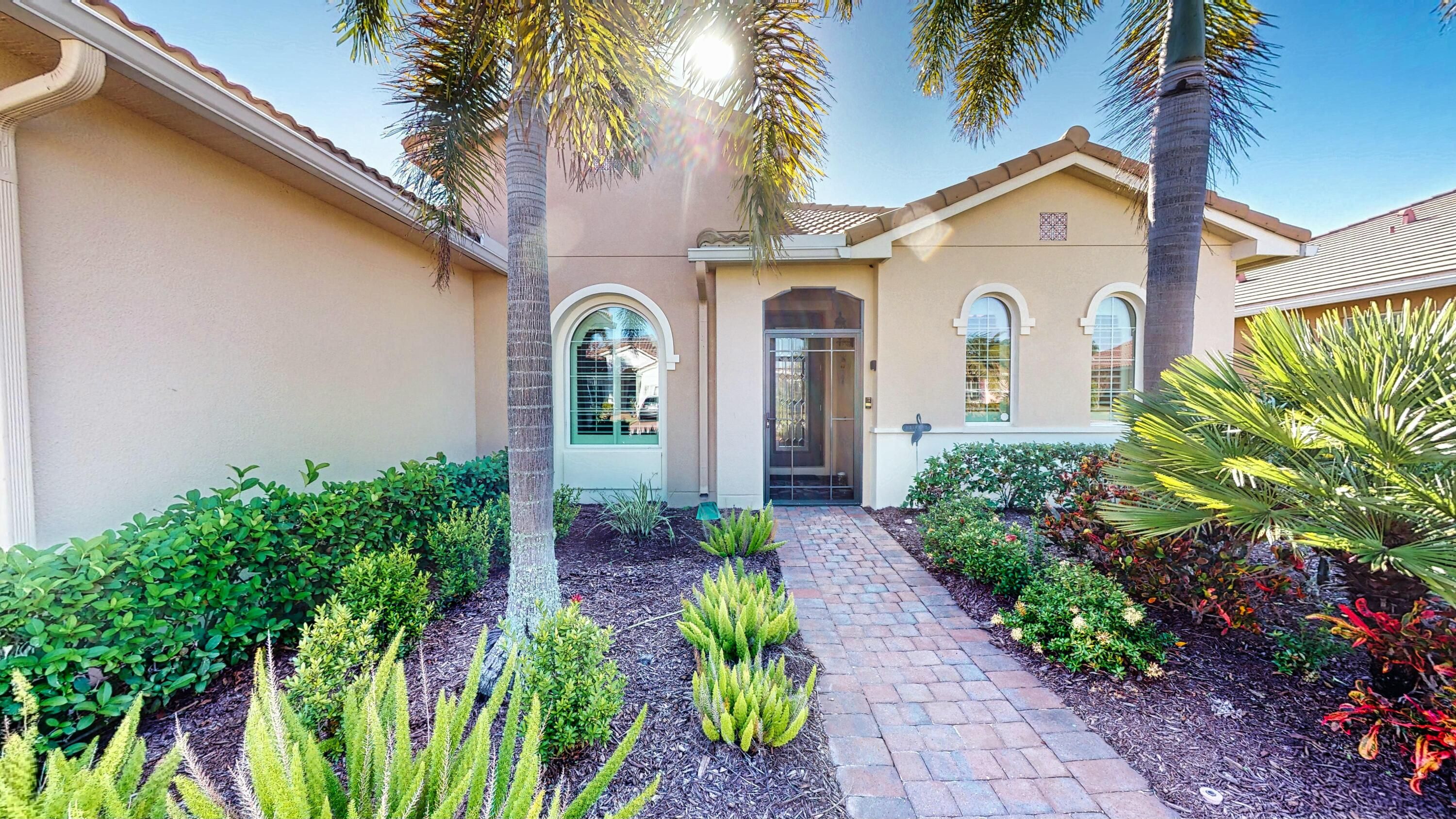 This stunning 3-bedroom, 3-bathroom home with nearly 2,300 square feet of living space offers a thoughtfully designed open floor plan perfect for modern living. The dual master suites each feature spacious walk-in closets, his-and-her sinks, and elegant stand-up showers, providing a luxurious retreat for homeowners or guests. The expansive chef's kitchen, complete with a giant center island, overlooks the dining and living areas, seamlessly connecting to the family room with soaring high ceilings—an entertainer's dream. The 16-foot sliding doors lead to a private, extended, and screened lanai, perfect for relaxing or hosting gatherings year-round. A separate guest room ensures privacy for visitors, while the versatile den adds flexibility for an office, library, or hobby space. Additional highlights include an extended garage, impact windows, and a durable tile roof, combining style and practicality. This home truly has it all!
