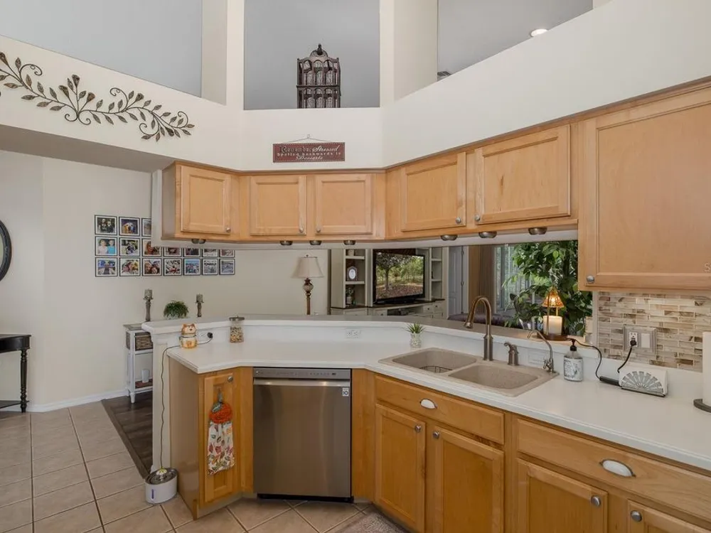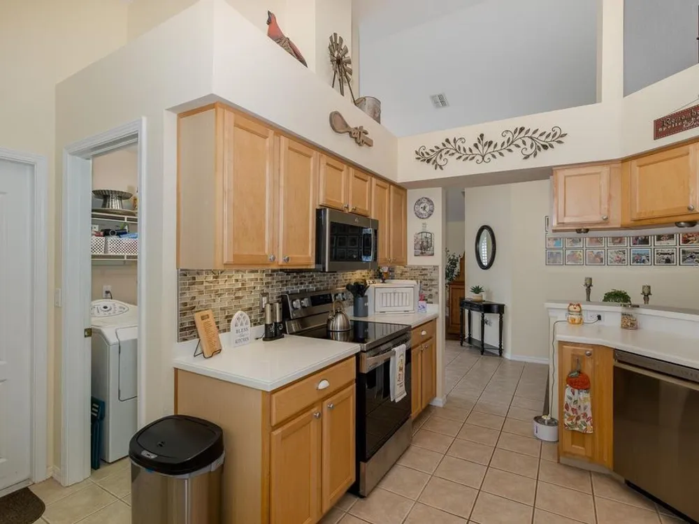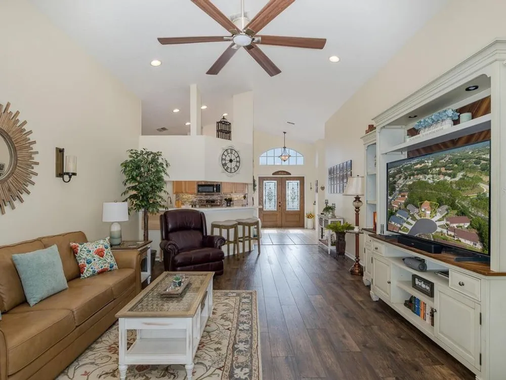 - Built-in Features, Ceiling Fan(s), Eat-in Kitchen, High Ceilings, Kitchen/Family Room Combo, Open Floorplan, Main Level Primary, Solid Surface Counters, Solid-Wood Cabinets, Split Bedrooms, Thermostat, Vaulted Ceiling(s), Walk-In Closet(s)