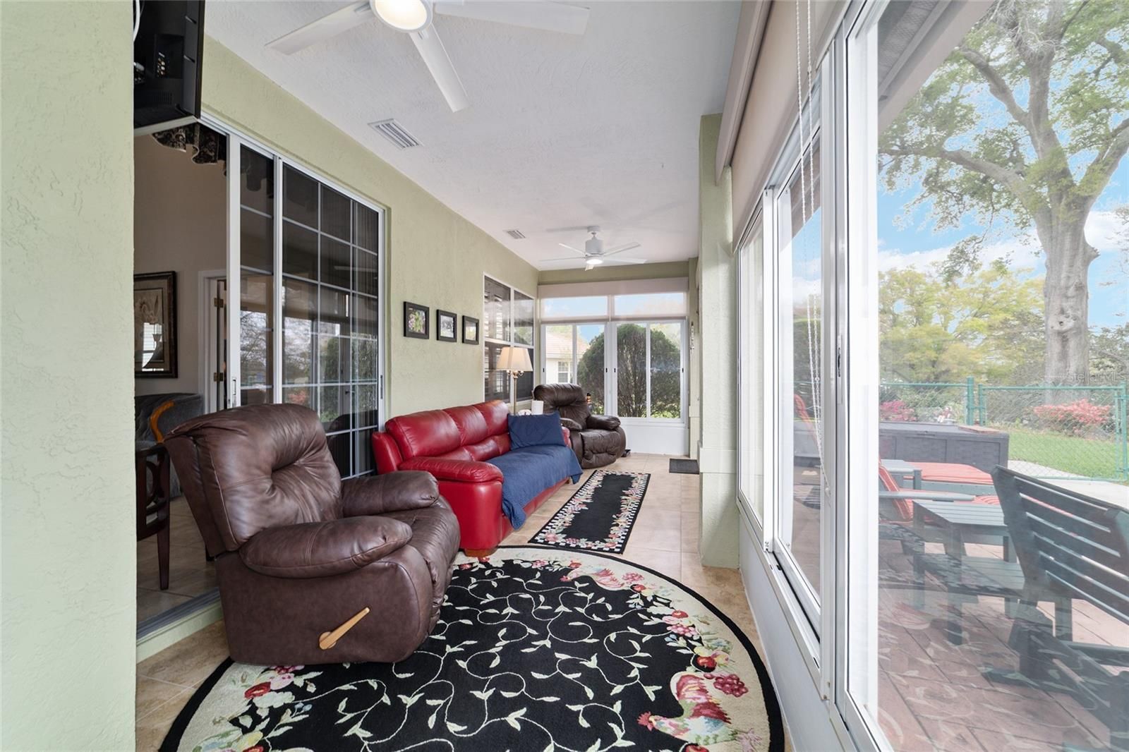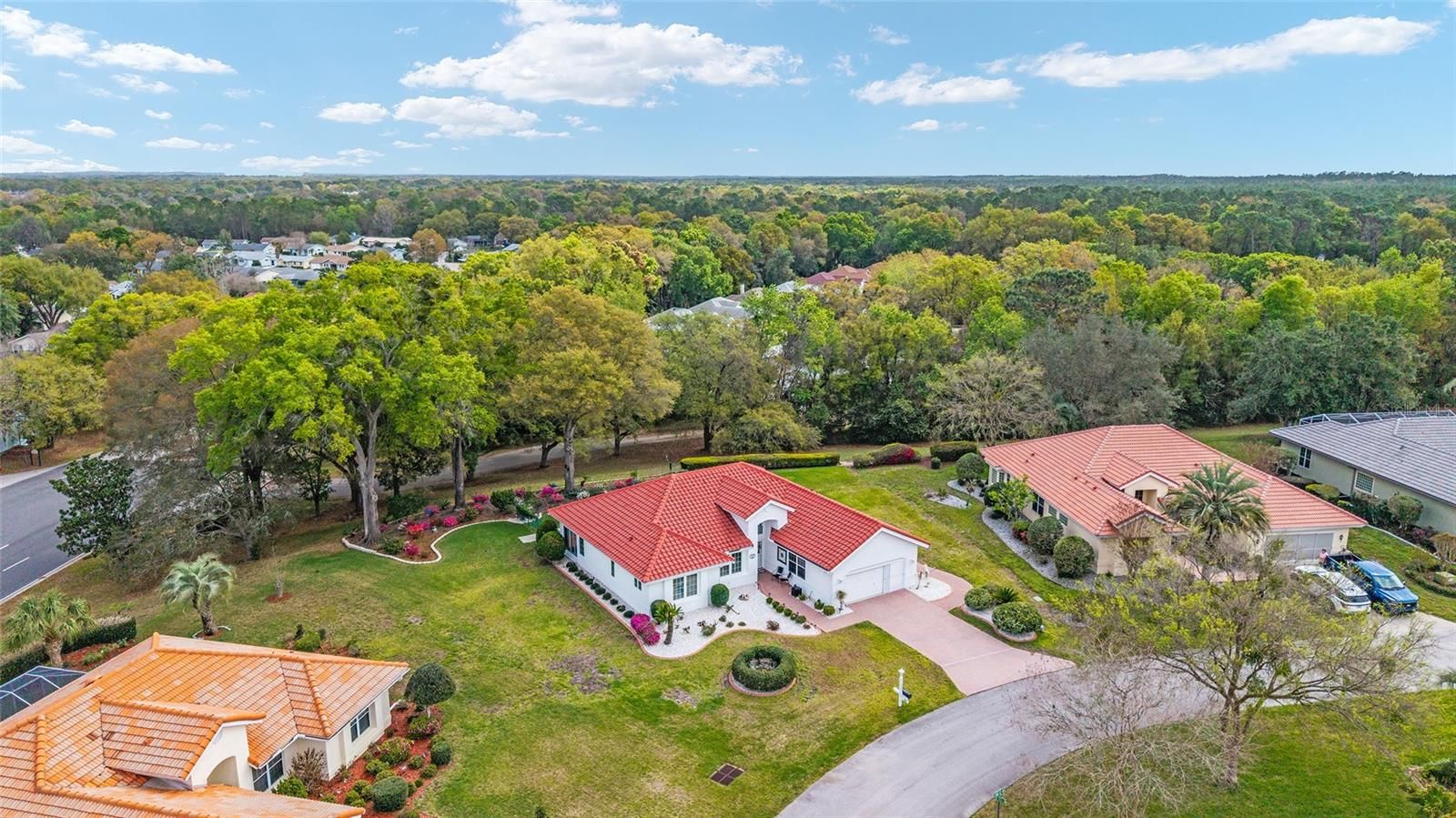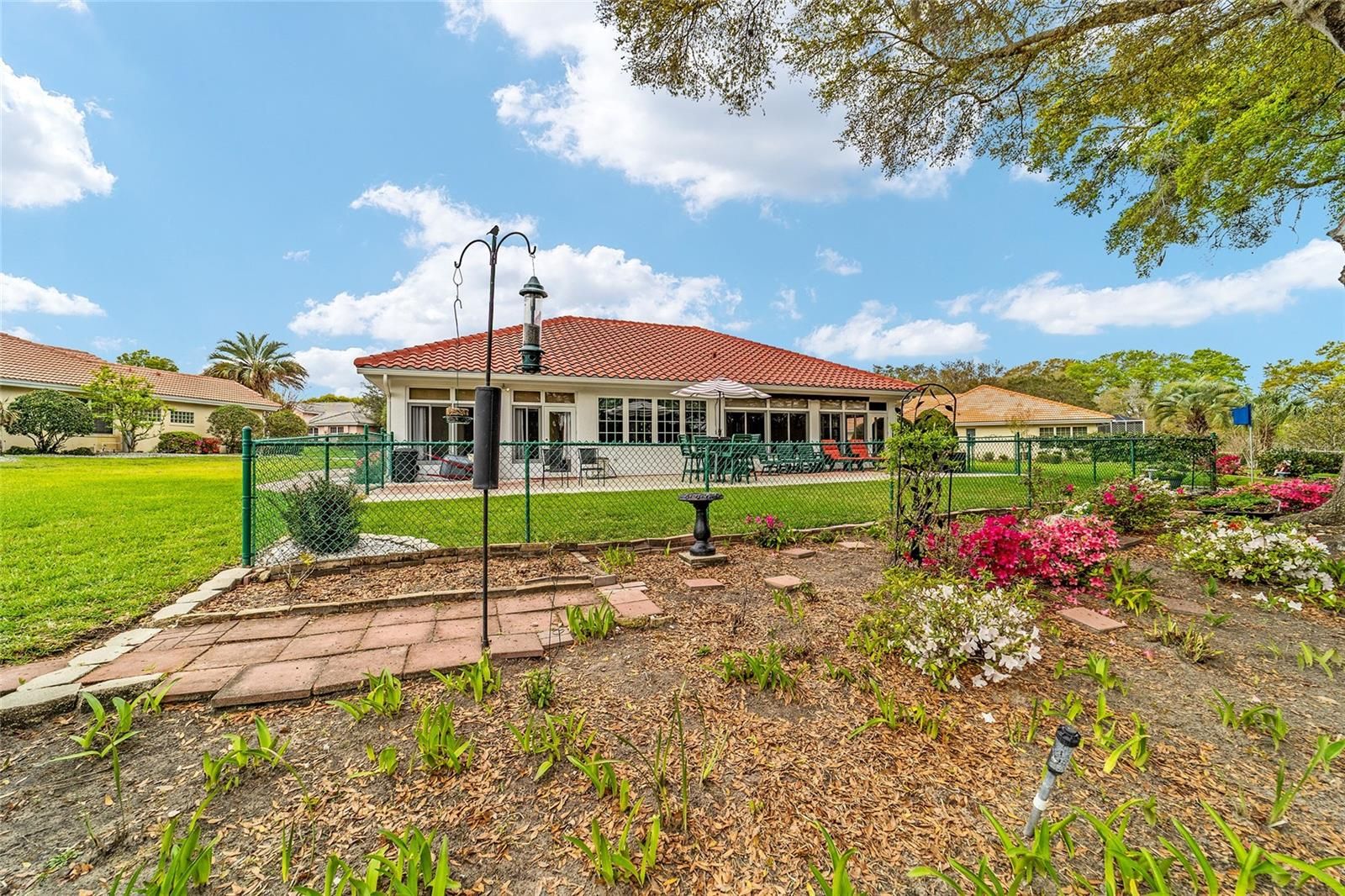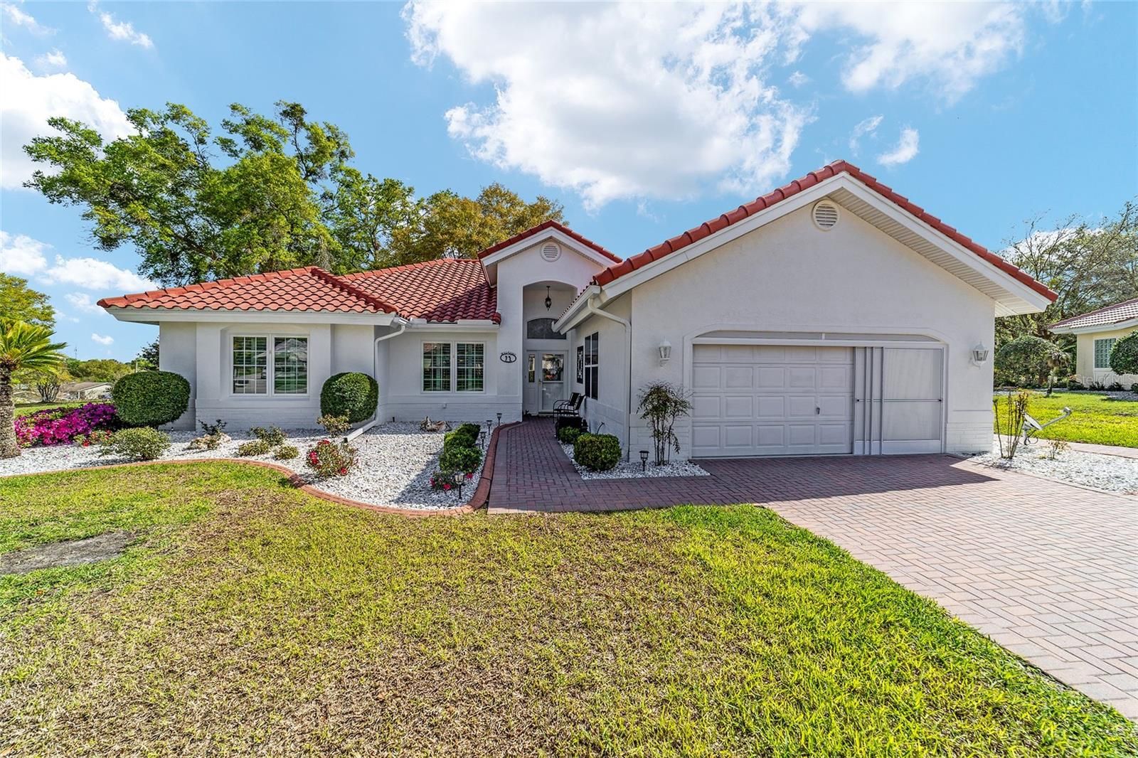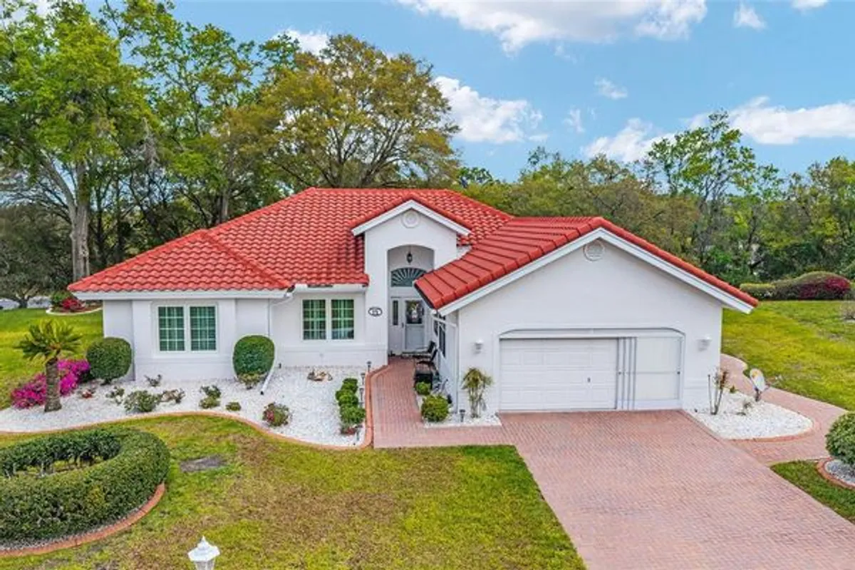 Beautiful and immaculate 2/2/2 plus den on almost half an acre in 55+ Oak Run! Seville model with 1653 sq ft. Both lanais are enclosed with acrylic glass giving you an additional 340 sq ft! NEW TILE ROOF ($32k) with premium tiles that are tinted all the way through. Tile flooring throughout the house and lanais. Granite countertops in kitchen. New electric panel (2022). New refrigerator (2025). New light fixtures and fans within the last 5 years (except guest bedroom and den). Added an extra window in each bedroom for cross ventilation. Added plantation shutters and blinds. Solid surface counters, comfort high toilets and grab bars in bathrooms. Brick pavers on driveway and sidewalk. Private backyard with beautiful landscaping and chain link fence for pets. Patio shaded in the afternoon and there's usually a breeze on the hill! Good spacing between neighbors as well. HVAC 2015. Preventative termite treatment (2021) and is good for 10 years. Reworked sprinkler system (new manifolds, new sprinkler heads, new control unit) for 10 stations (2025). Cement curbing around landscape beds. NEW garage screen door (2026) Furniture included if desired. This home has been lovingly cared for and it shows! Oak Run has 3 clubhouses, 6 pools, 2 fitness centers, golf, tennis, pickleball, bocce ball, sand volleyball, shuffleboard, walking trail, dog park, over 100 clubs and 24 hour gated security. Close to shopping, medical, and restaurants too! Call for a showing today!