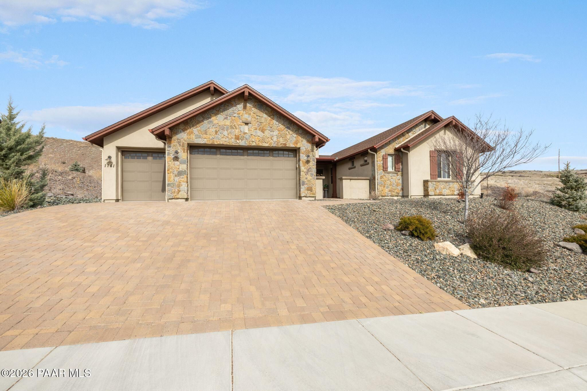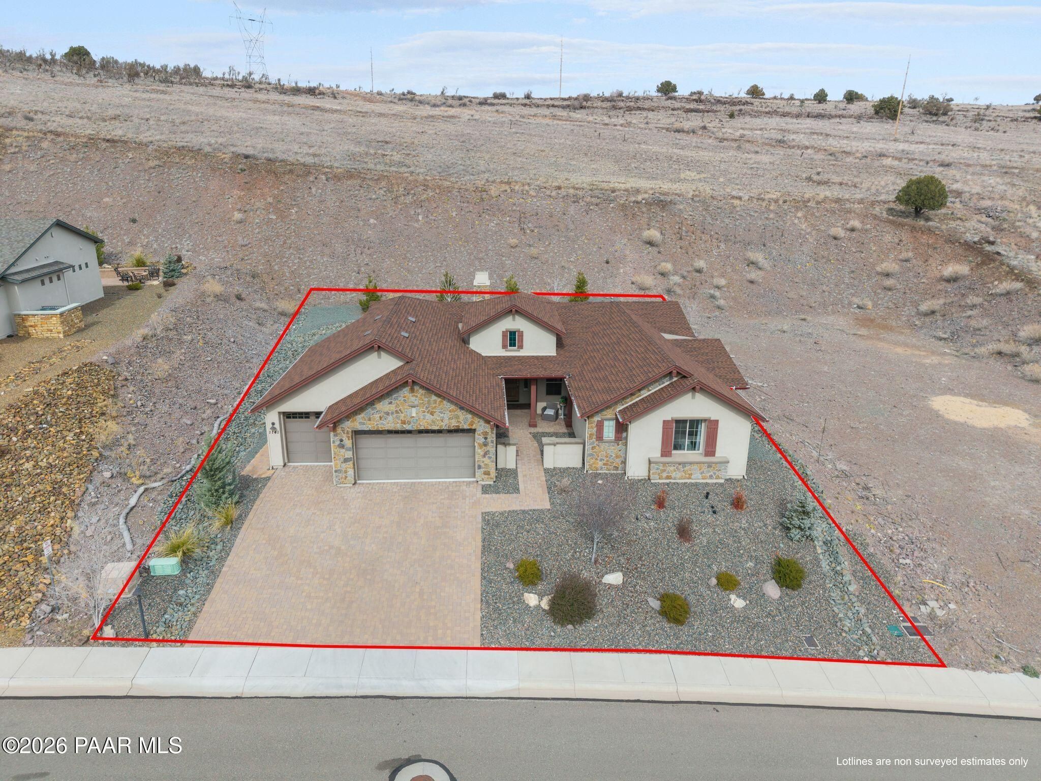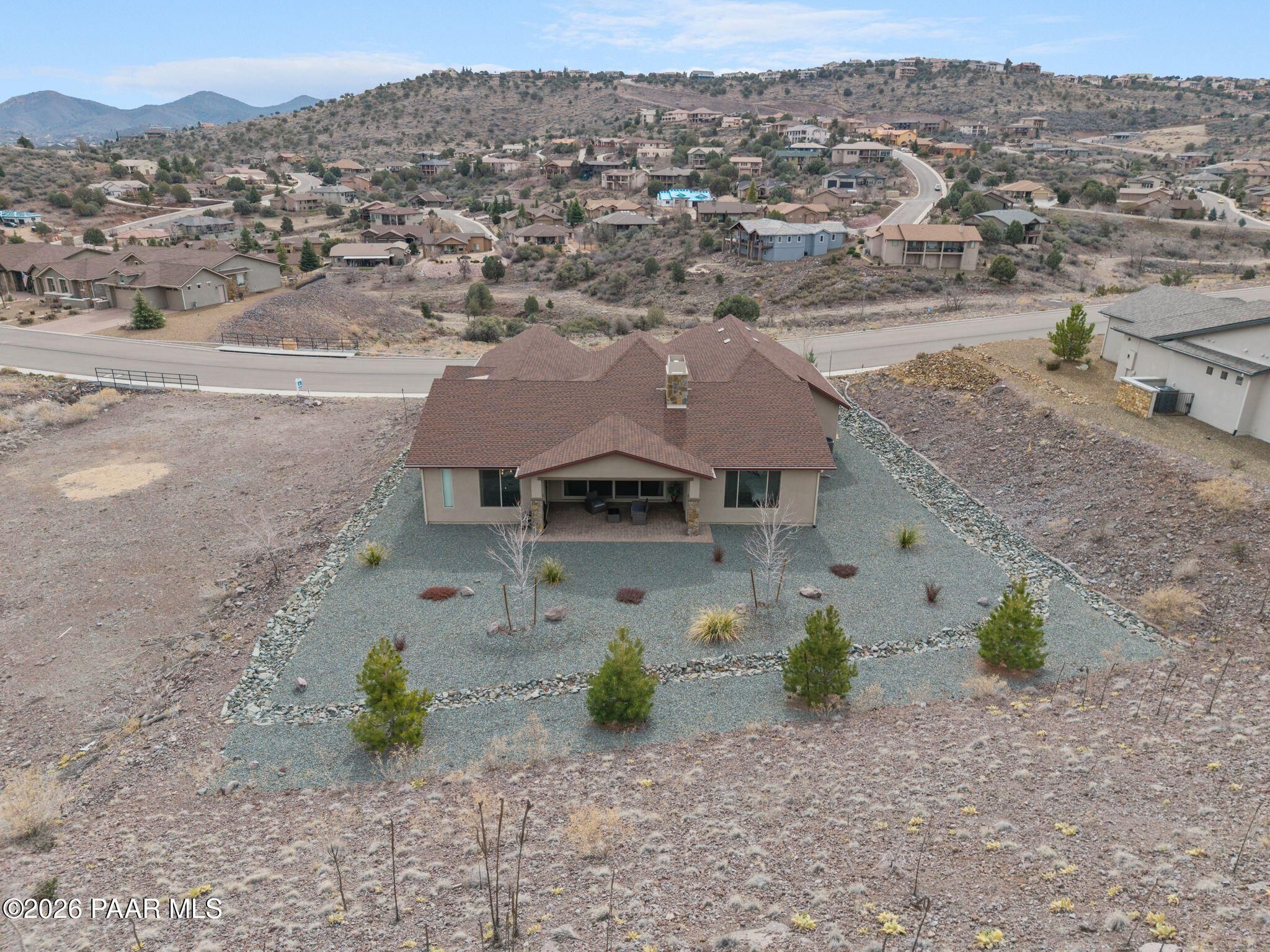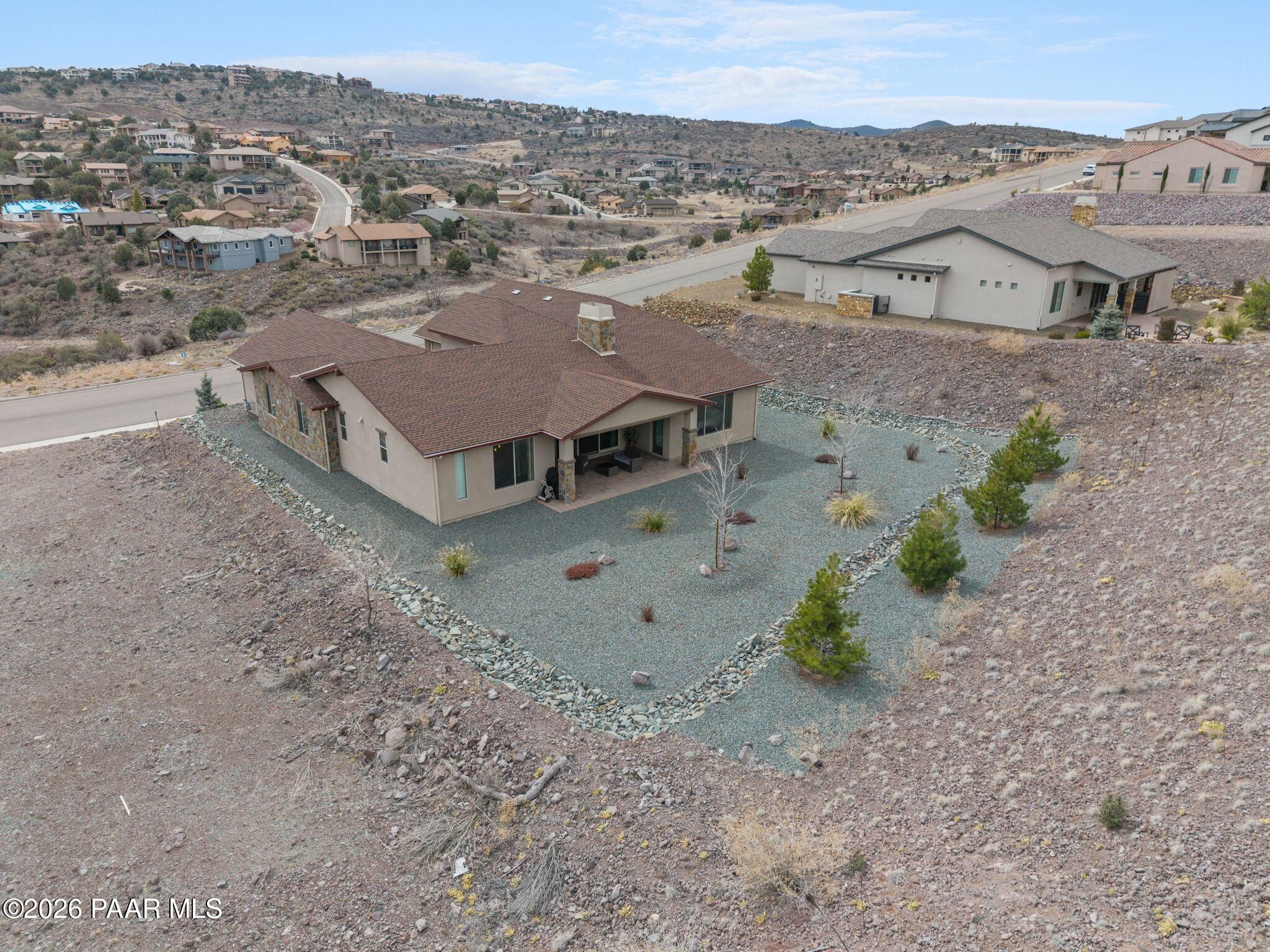 Beautifully maintained home in the newest phase of Yavapai Hills. Built by Manadlay-Pinnacle floor plan with great room design offering 3 bedrooms, 2.5 bathrooms, flex rm, and an oversized 3-car garage with EV car chargers and epoxy floor. Interior features include 10' ceilings, 8' doors, 16' sliding glass door, beamed ceiling, fireplace, spacious bedrooms, mud/laundry room, and excellent storage. Chef's kitchen boasts stainless steel gourmet appliances, a cooktop with a separate wall oven, walk-in pantry with floor-to-ceiling storage, crown-molded cabinetry, breakfast area, and separate dining space. Owner's suite with patio access, large walk-in shower, dual vanity, and oversized walk-in closet. Oversized covered patio overlooks a beautifully landscaped, flat, and private backyard--ideal for entertaining. Extremely energy efficient with spray foam insulation, insulated concrete slab, Hybrid water heater, 95% efficient gas heat, Low-E windows, WaterSense(r) fixtures, whole-house air exchanger, and energy-efficient lighting. Exceeds Energy Star 3 and EPA Indoor airPLUS Certified. Drip system w/ auto timers on all landscaping.