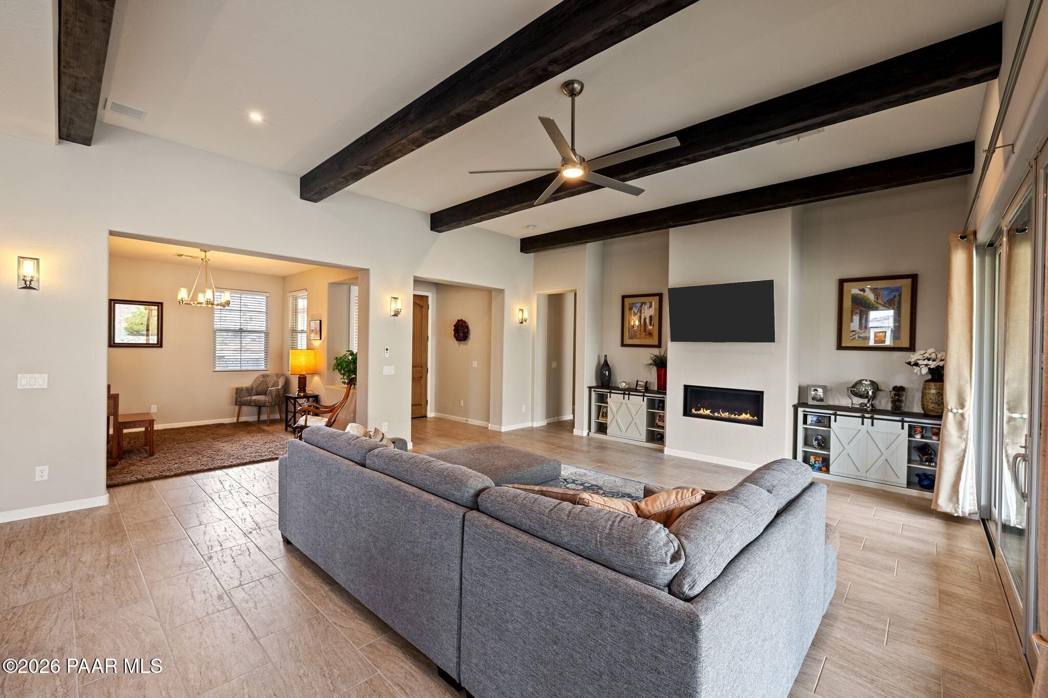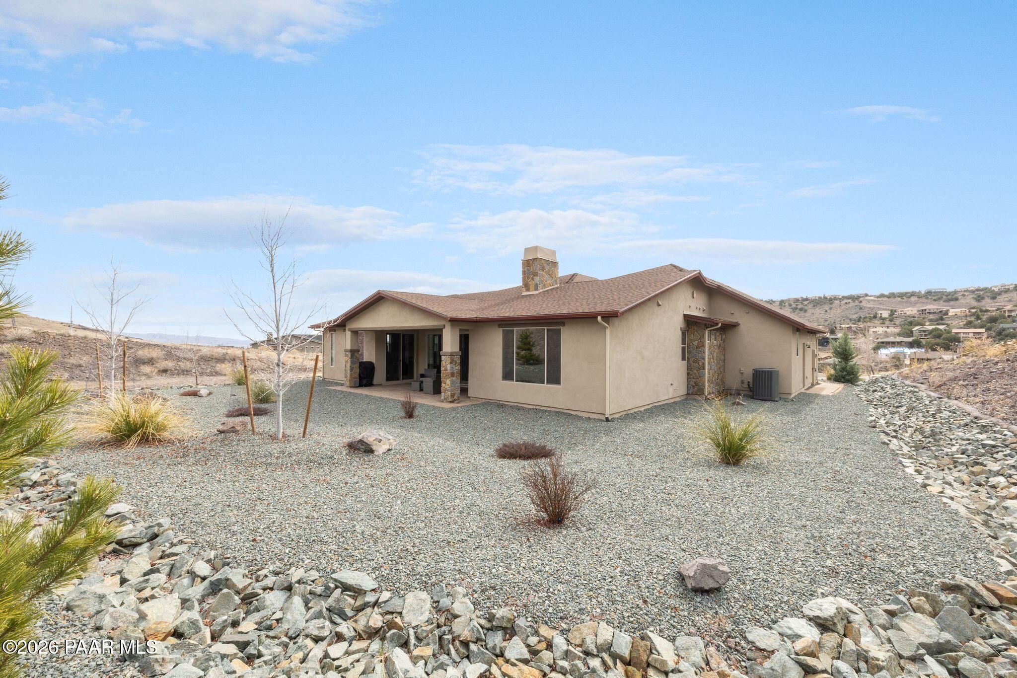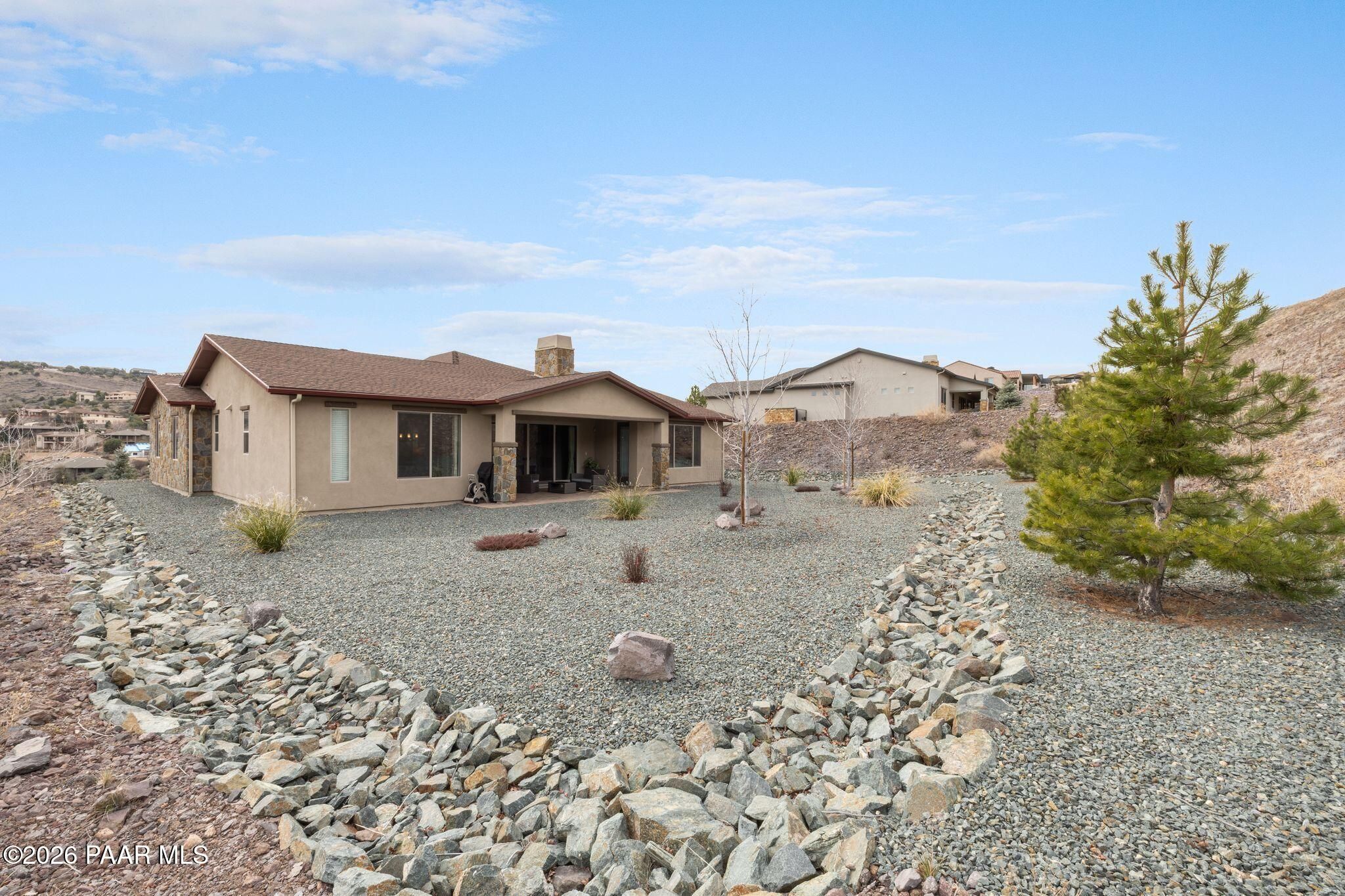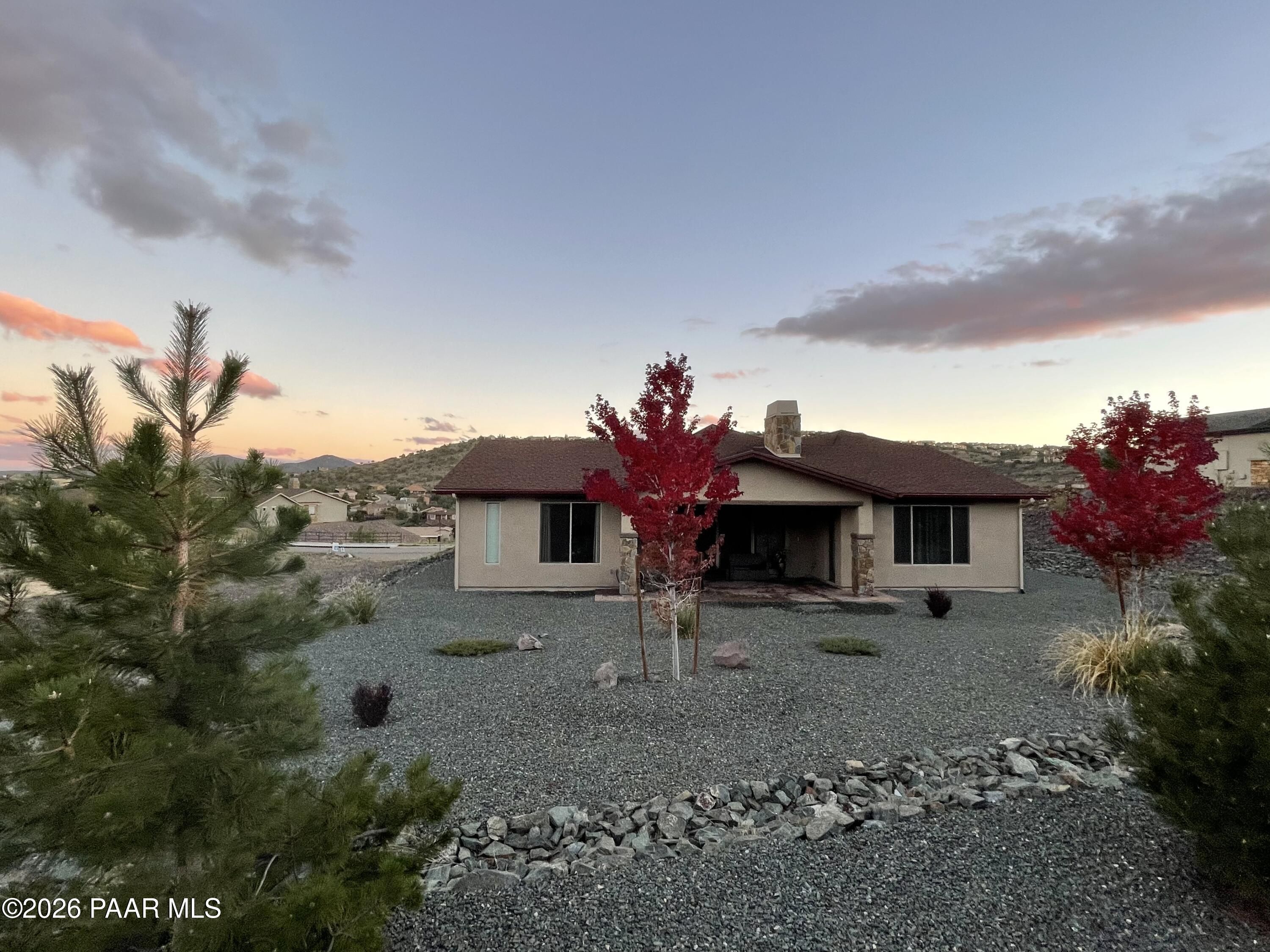 Beautifully maintained home in the newest phase of Yavapai Hills. Built by Manadlay-Pinnacle floor plan with great room design offering 3 bedrooms, 2.5 bathrooms, flex rm, and an oversized 3-car garage with EV car chargers and epoxy floor. Interior features include 10' ceilings, 8' doors, 16' sliding glass door, beamed ceiling, fireplace, spacious bedrooms, mud/laundry room, and excellent storage. Chef's kitchen boasts stainless steel gourmet appliances, a cooktop with a separate wall oven, walk-in pantry with floor-to-ceiling storage, crown-molded cabinetry, breakfast area, and separate dining space. Owner's suite with patio access, large walk-in shower, dual vanity, and oversized walk-in closet. Oversized covered patio overlooks a beautifully landscaped, flat, and private backyard--ideal for entertaining. Extremely energy efficient with spray foam insulation, insulated concrete slab, Hybrid water heater, 95% efficient gas heat, Low-E windows, WaterSense(r) fixtures, whole-house air exchanger, and energy-efficient lighting. Exceeds Energy Star 3 and EPA Indoor airPLUS Certified. Drip system w/ auto timers on all landscaping.
