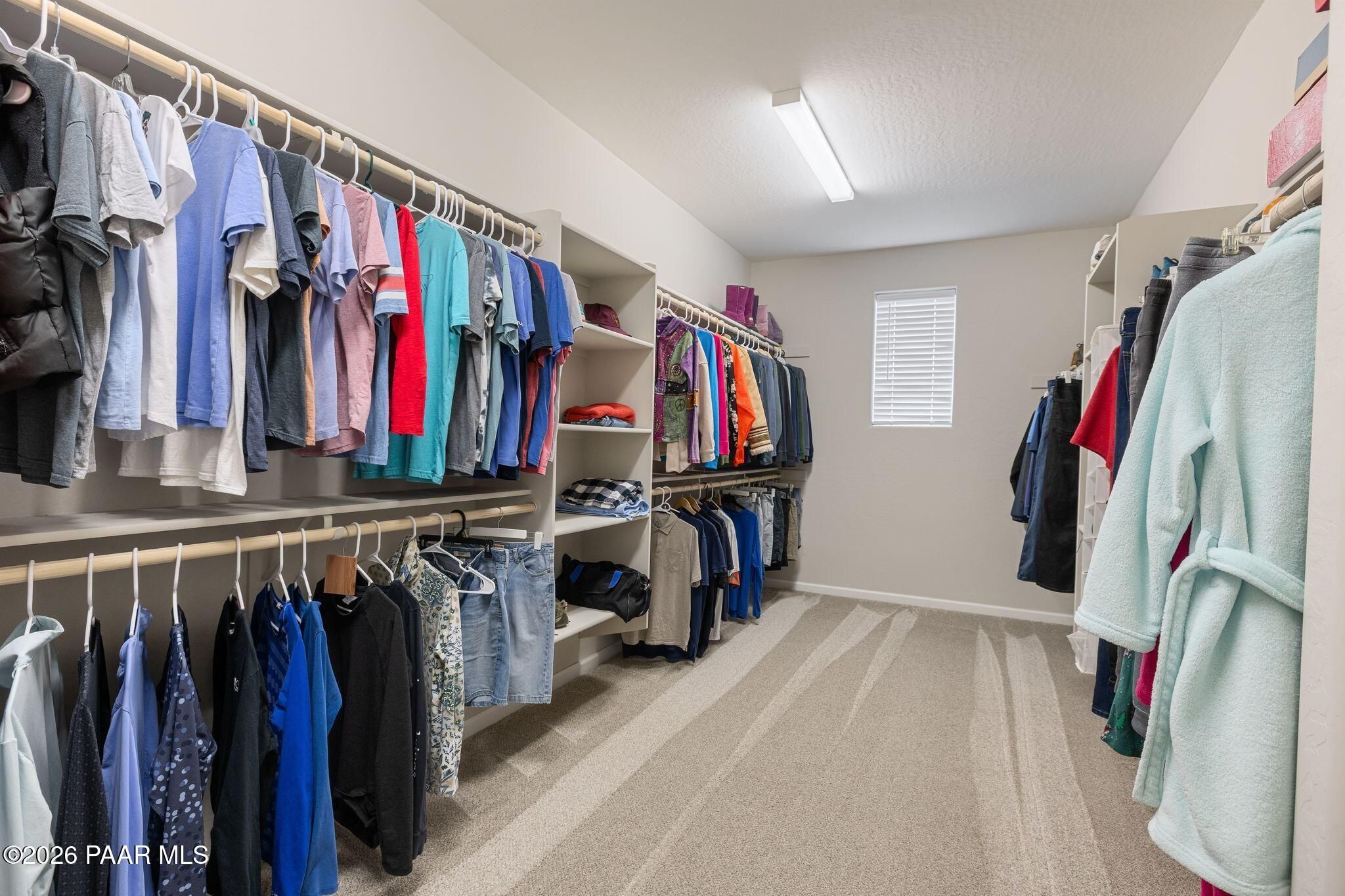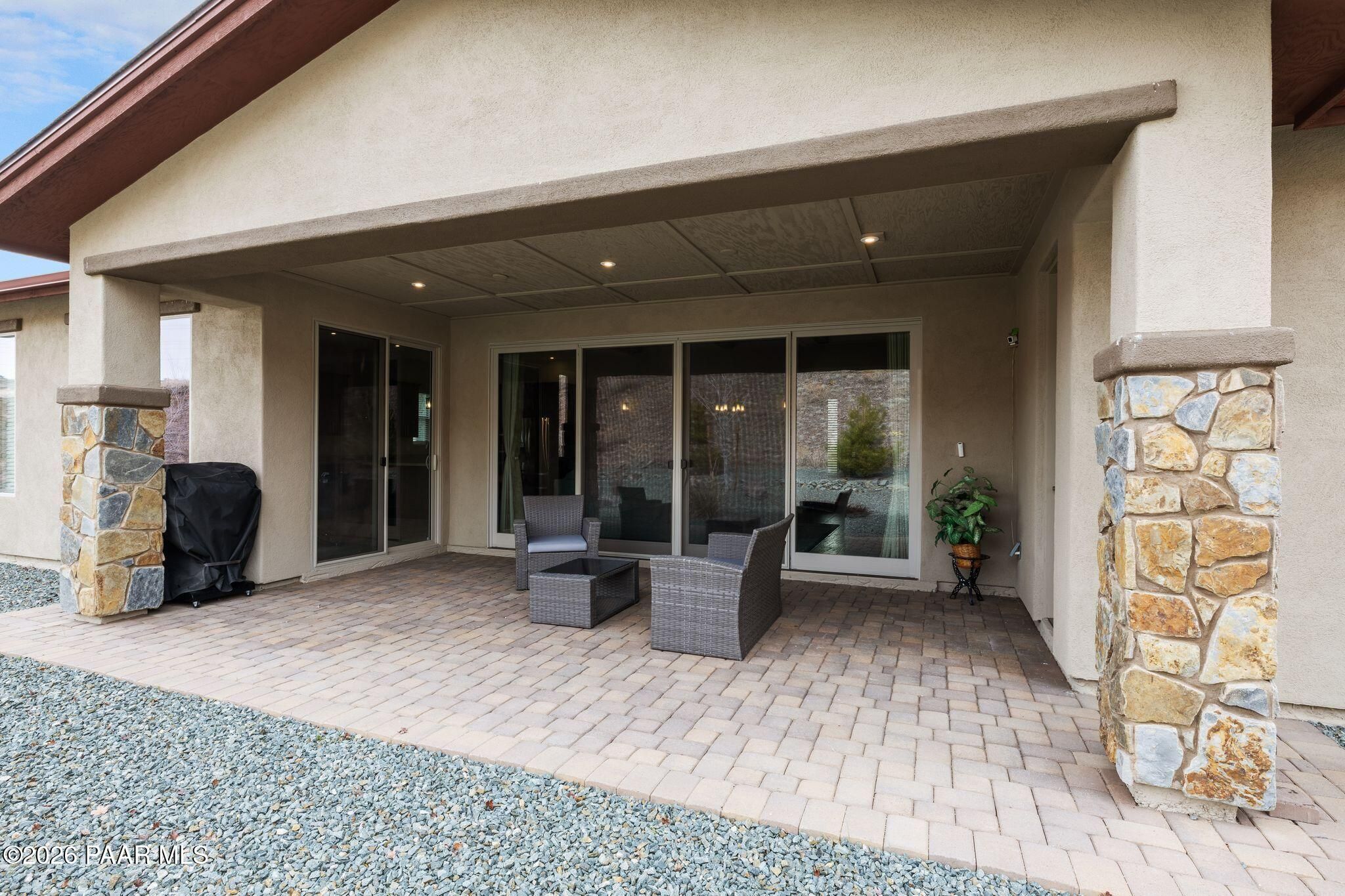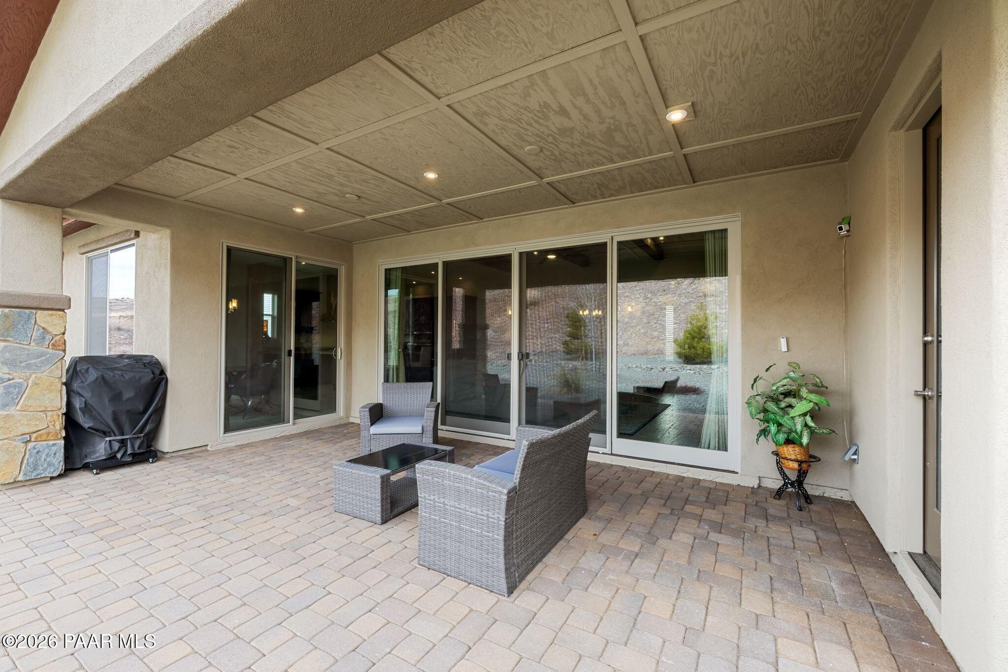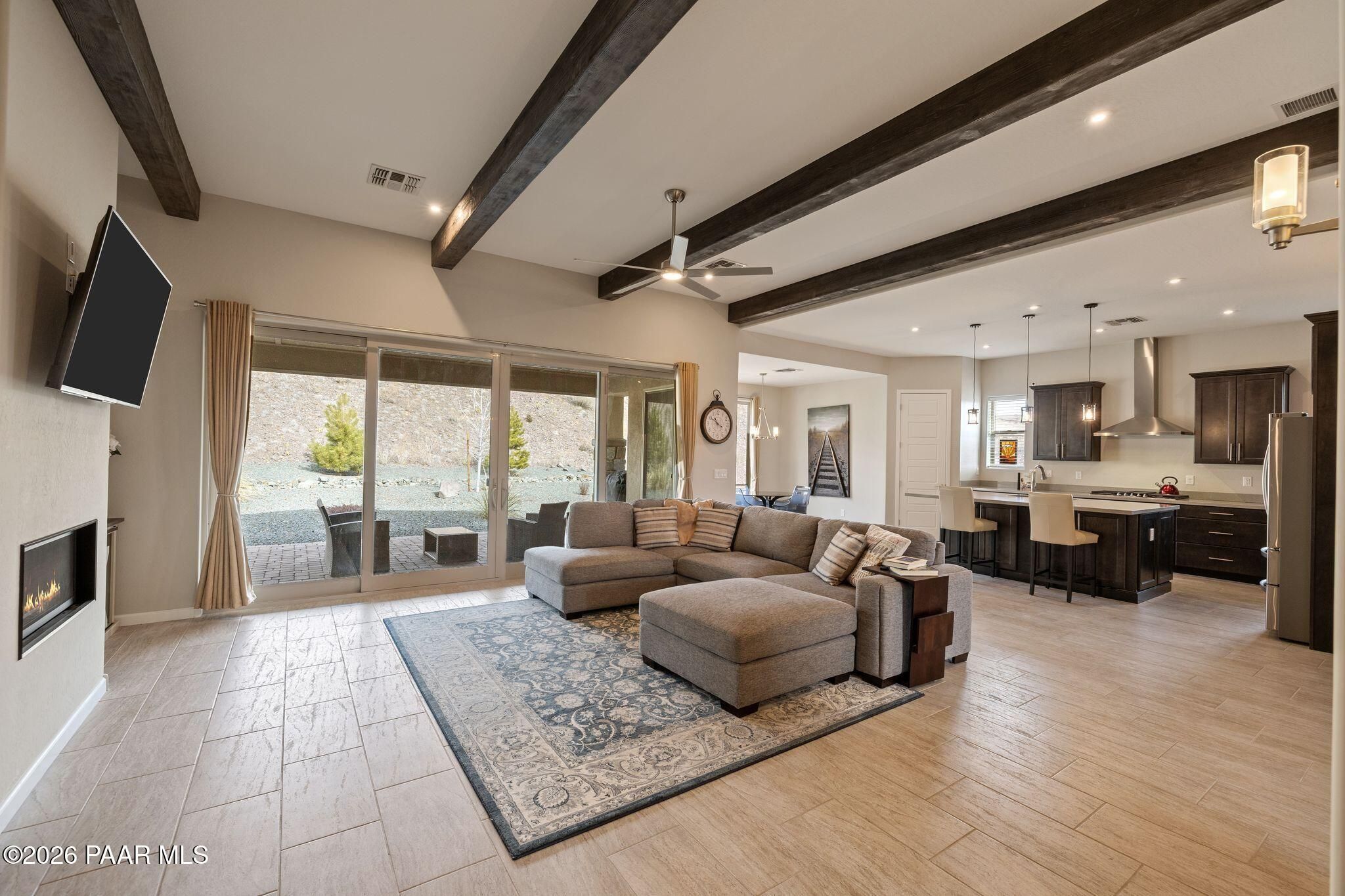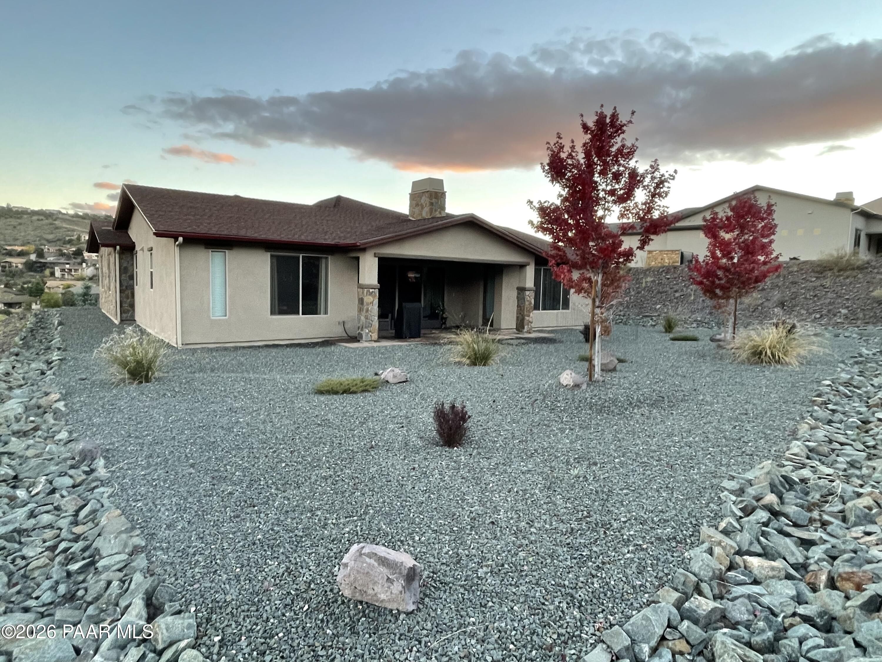 Beautifully maintained home in the newest phase of Yavapai Hills. Built by Manadlay-Pinnacle floor plan with great room design offering 3 bedrooms, 2.5 bathrooms, flex rm, and an oversized 3-car garage with EV car chargers and epoxy floor. Interior features include 10' ceilings, 8' doors, 16' sliding glass door, beamed ceiling, fireplace, spacious bedrooms, mud/laundry room, and excellent storage. Chef's kitchen boasts stainless steel gourmet appliances, a cooktop with a separate wall oven, walk-in pantry with floor-to-ceiling storage, crown-molded cabinetry, breakfast area, and separate dining space. Owner's suite with patio access, large walk-in shower, dual vanity, and oversized walk-in closet. Oversized covered patio overlooks a beautifully landscaped, flat, and private backyard--ideal for entertaining. Extremely energy efficient with spray foam insulation, insulated concrete slab, Hybrid water heater, 95% efficient gas heat, Low-E windows, WaterSense(r) fixtures, whole-house air exchanger, and energy-efficient lighting. Exceeds Energy Star 3 and EPA Indoor airPLUS Certified. Drip system w/ auto timers on all landscaping.