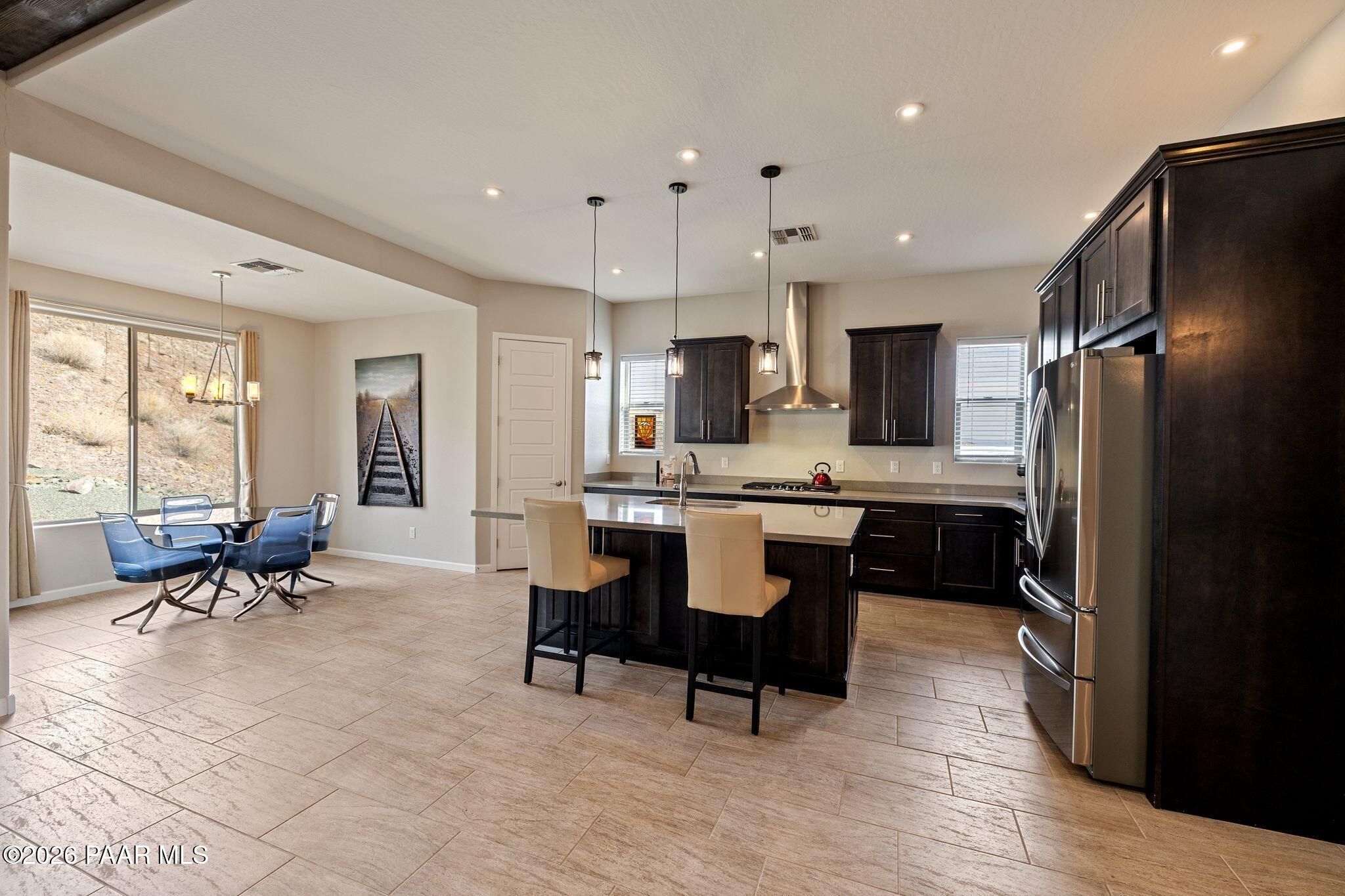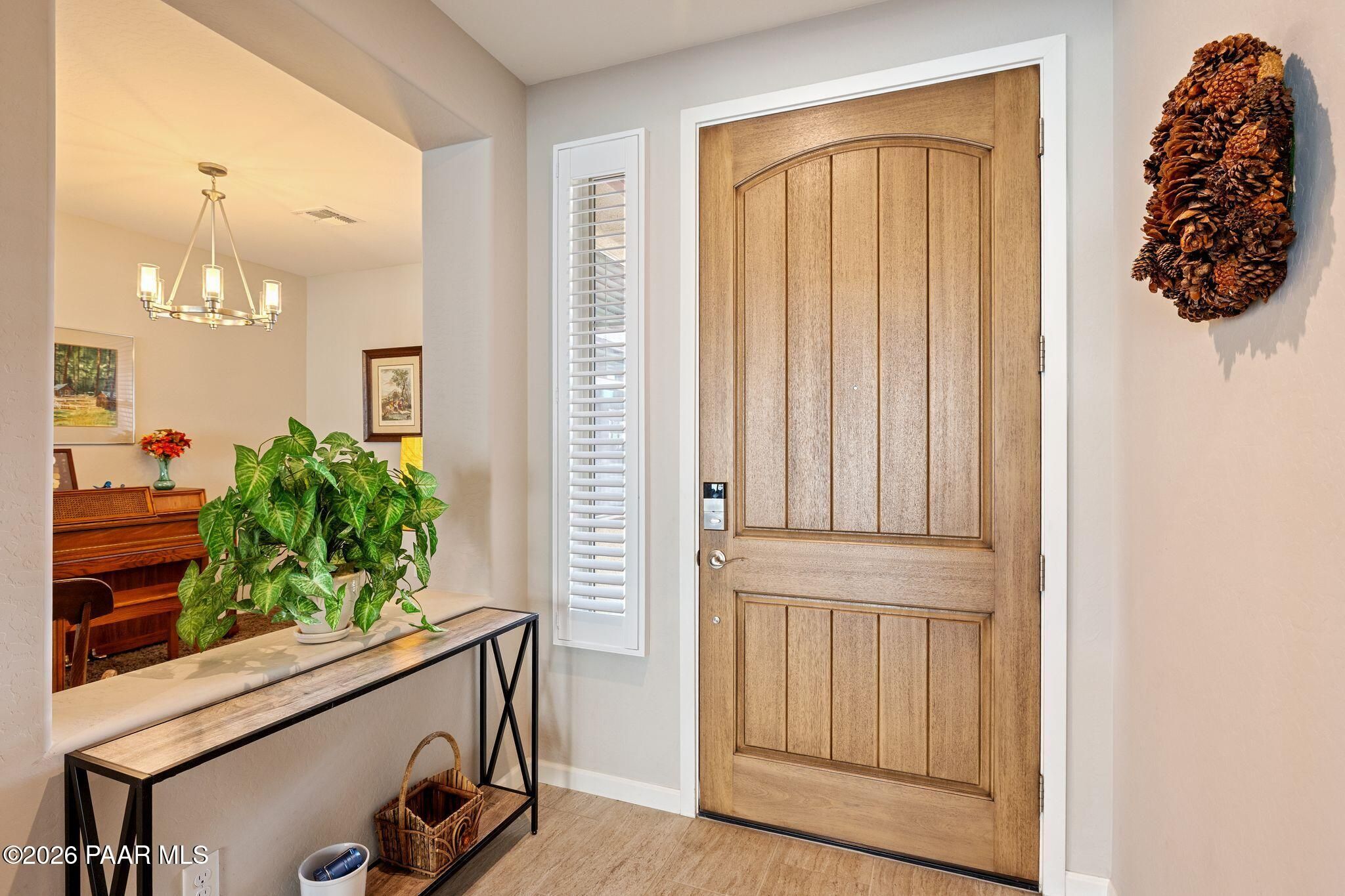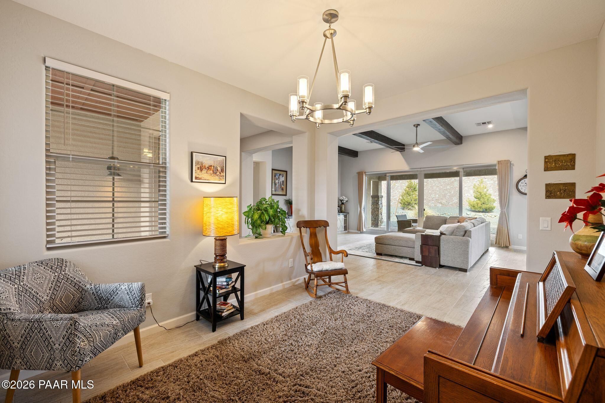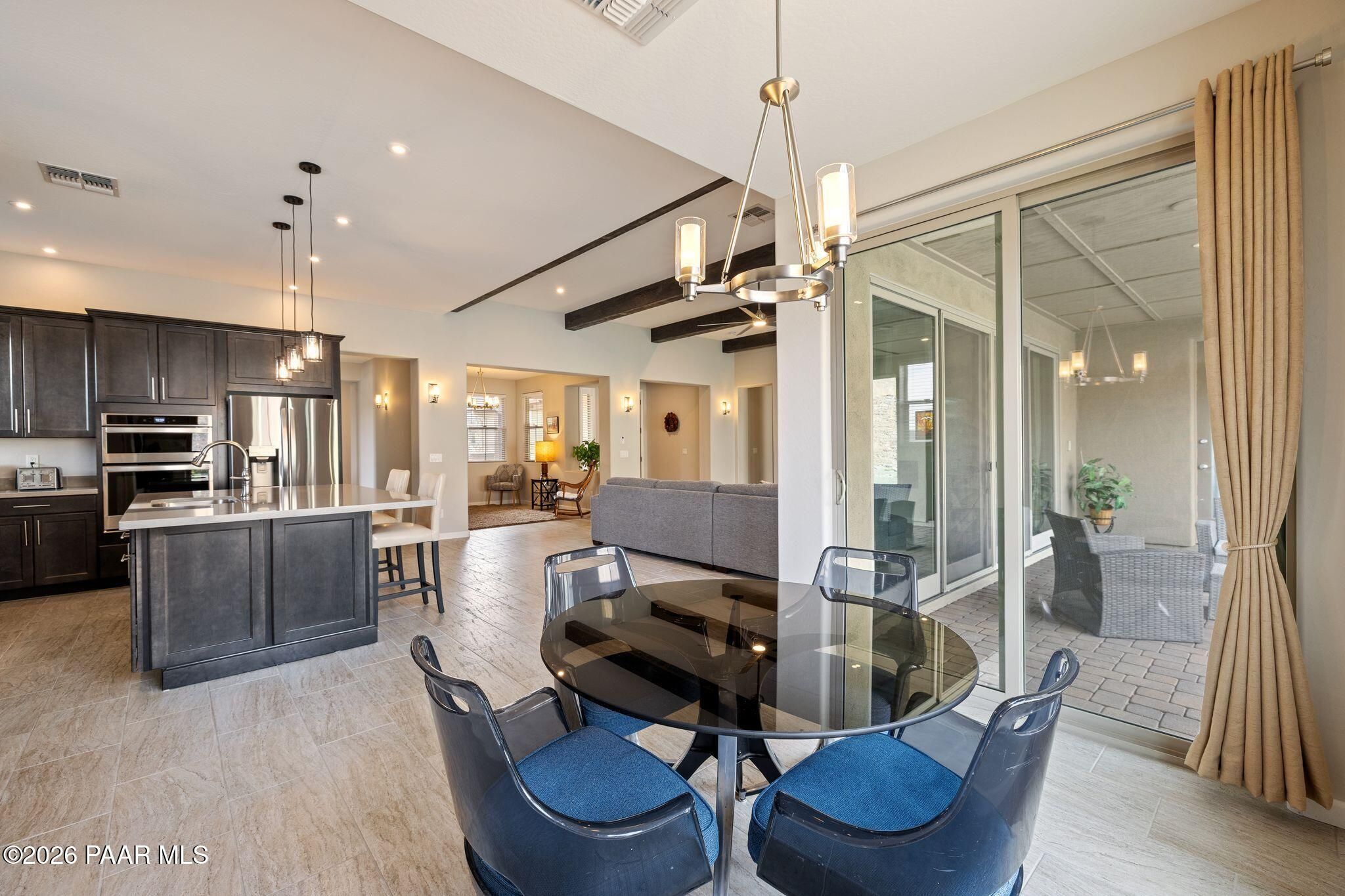 Beautifully maintained home in the newest phase of Yavapai Hills. Built by Manadlay-Pinnacle floor plan with great room design offering 3 bedrooms, 2.5 bathrooms, flex rm, and an oversized 3-car garage with EV car chargers and epoxy floor. Interior features include 10' ceilings, 8' doors, 16' sliding glass door, beamed ceiling, fireplace, spacious bedrooms, mud/laundry room, and excellent storage. Chef's kitchen boasts stainless steel gourmet appliances, a cooktop with a separate wall oven, walk-in pantry with floor-to-ceiling storage, crown-molded cabinetry, breakfast area, and separate dining space. Owner's suite with patio access, large walk-in shower, dual vanity, and oversized walk-in closet. Oversized covered patio overlooks a beautifully landscaped, flat, and private backyard--ideal for entertaining. Extremely energy efficient with spray foam insulation, insulated concrete slab, Hybrid water heater, 95% efficient gas heat, Low-E windows, WaterSense(r) fixtures, whole-house air exchanger, and energy-efficient lighting. Exceeds Energy Star 3 and EPA Indoor airPLUS Certified. Drip system w/ auto timers on all landscaping.