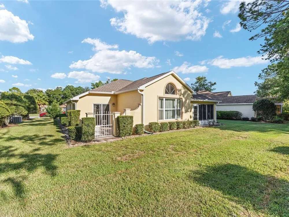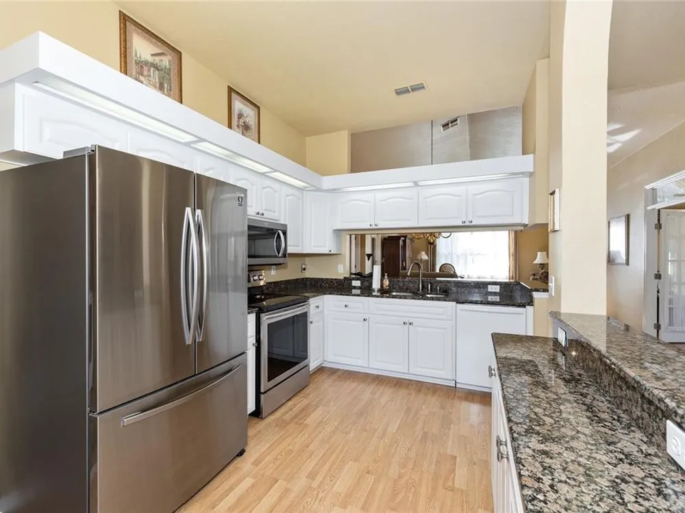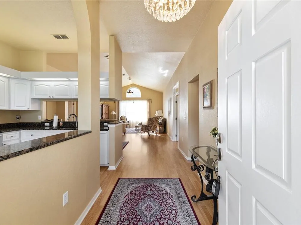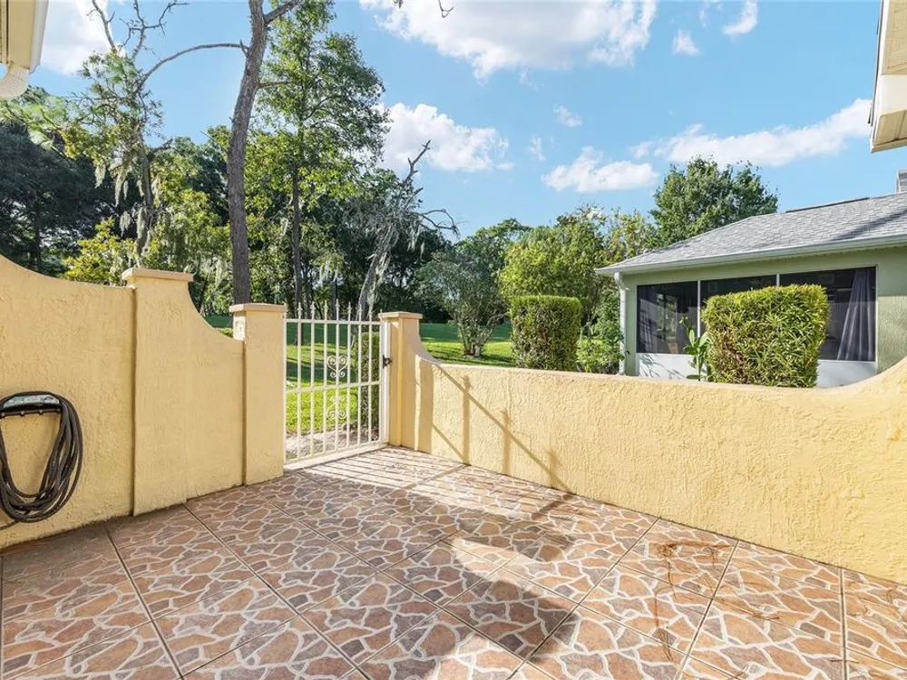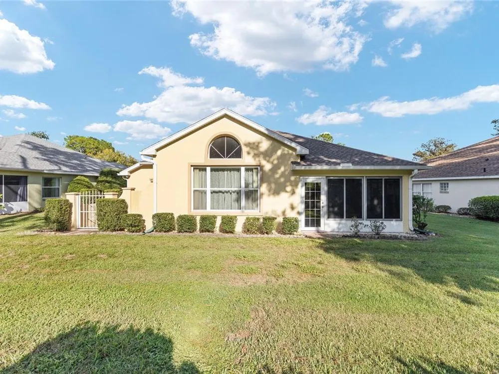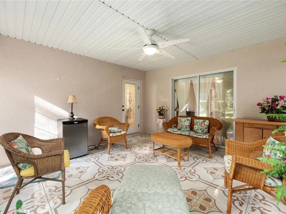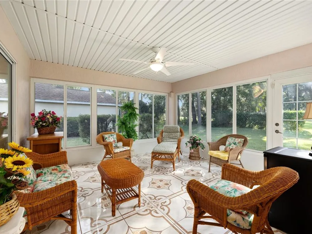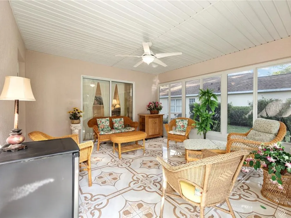 One or more photo(s) has been virtually staged. Where to start? This beautifully updated 2-bedroom, 2-bath home with a den (easily converted to a third bedroom) offers nearly 1,600 sq. ft. of living space and sits right on the 1st hole of the golf course. Featuring a 2-car garage, screened entry with paver driveway and walkway, and a 2021 roof with a brand-new 2023 AC, this home is truly turn-key. Step inside to soaring vaulted ceilings in the living room, wood laminate flooring throughout, and tile in both bathrooms. The master suite boasts a large walk-in closet, updated vanity with granite countertops, and direct access to the enclosed sunroom through sliding glass doors. The sunroom shines with elegant porcelain tile, while the French doors leading to the den add charm and flexibility. The eat-in kitchen is a chef’s delight with granite countertops, new appliances, and plenty of space to gather. A full-sized washer and dryer are conveniently located in the laundry room. This home blends comfort, style, and functionality—all with stunning golf course views. Service fees includes trash pickup, basic cable, 24-hour security, access to all community amenities, and maintenance of common areas and facilities, Lawn mowing, watering and fertilization. Residents of this community enjoy access to numerous amenities with six pools ( 1 indoor ), 5 Hot tubs - spanning across three different club houses! But it doesn't stop there.. Over a 150 clubs to join, two recently updated workout centers, Enjoy meals at the on-site restaurant or hit the greens at the community golf course. Plus, there's a dedicated dog park for your furry friends. This community ensures an active and fulfilling lifestyle. Don’t miss out on this opportunity to make this home yours!