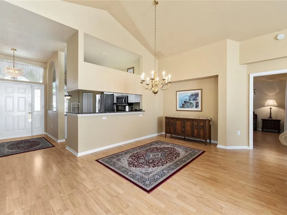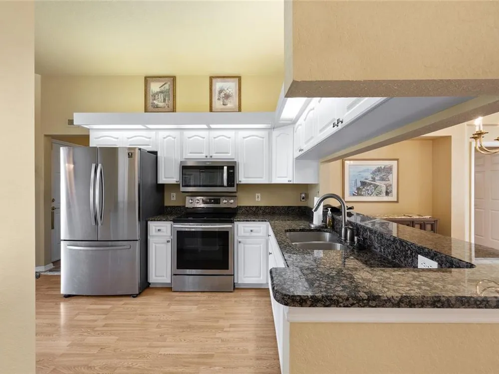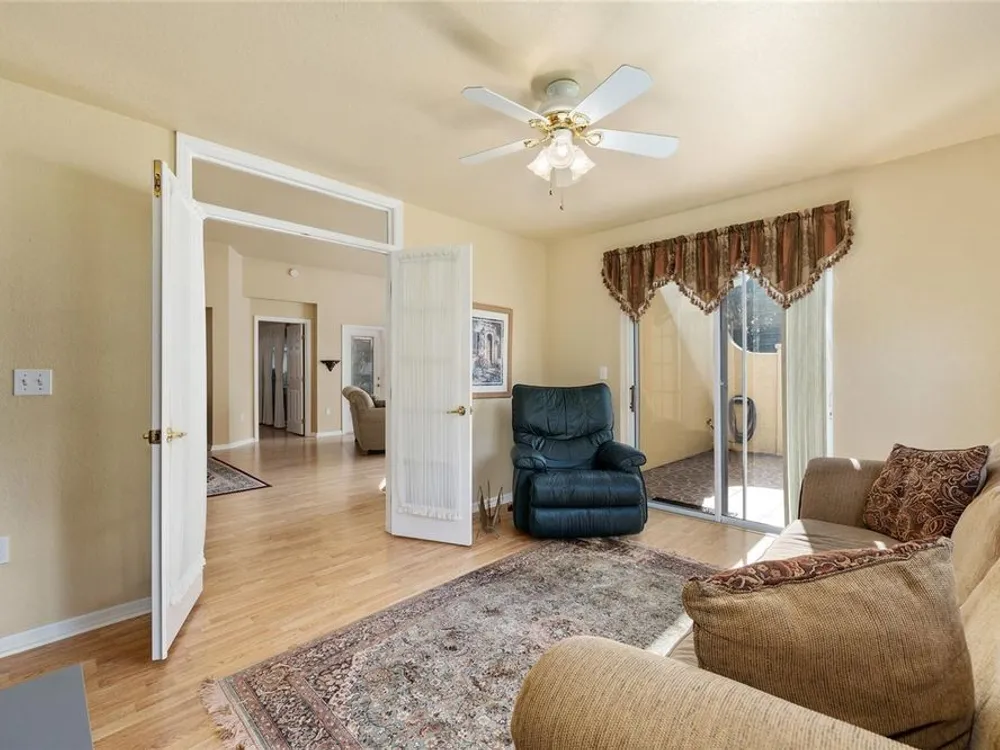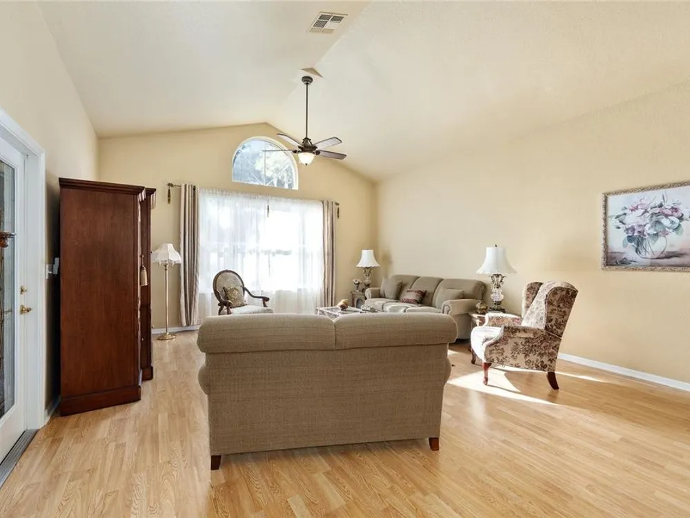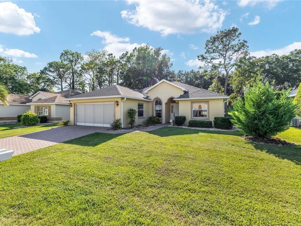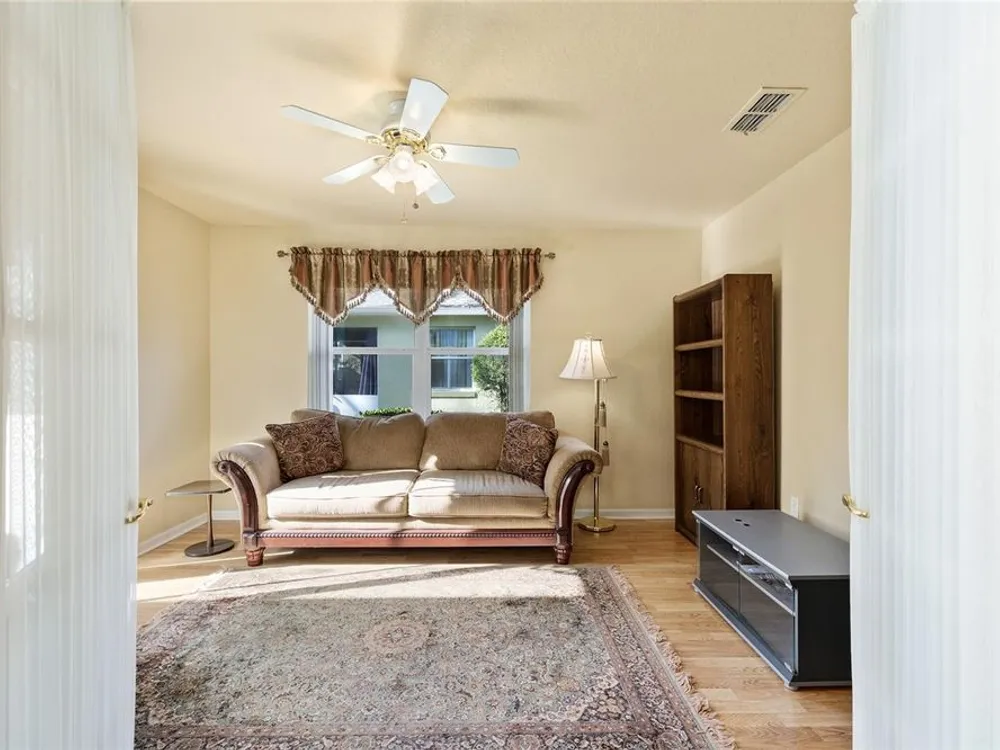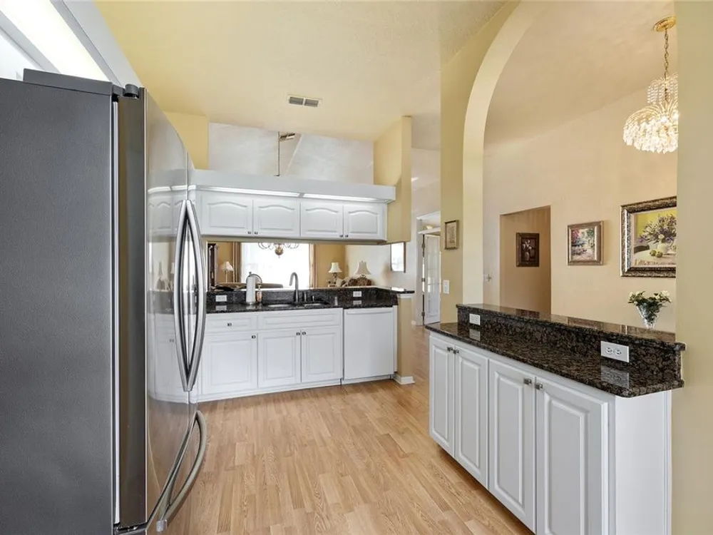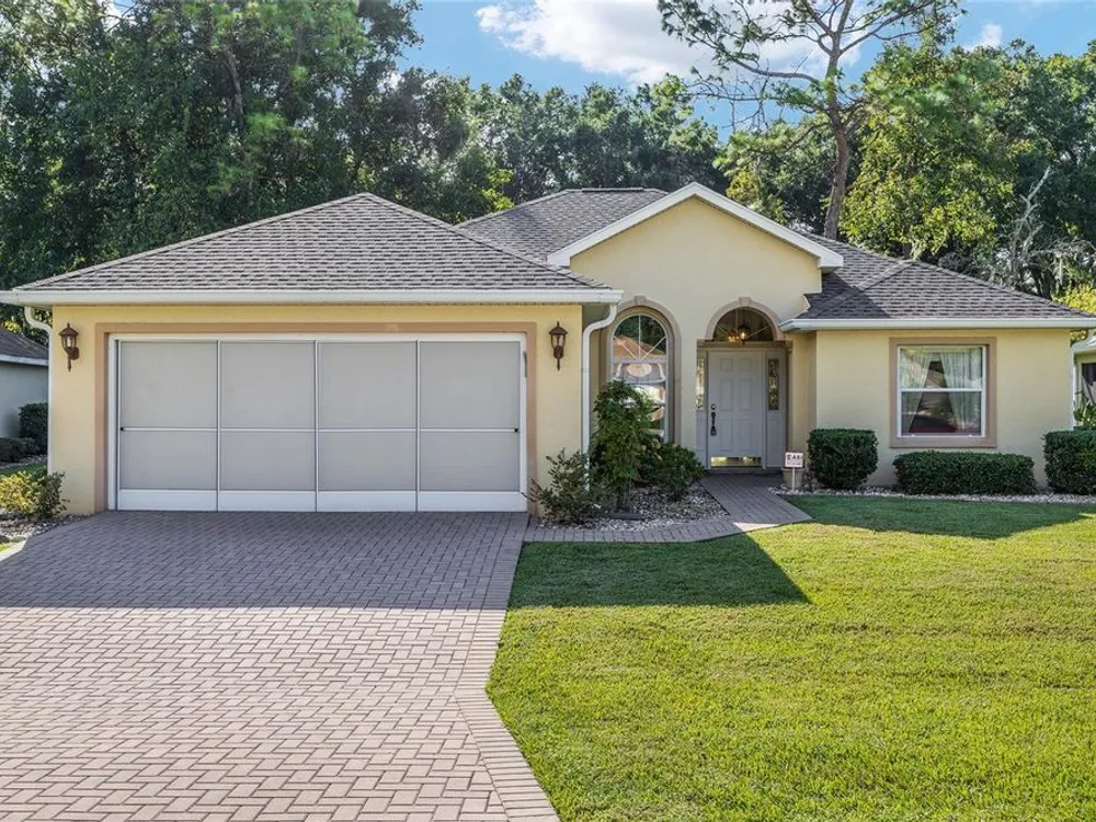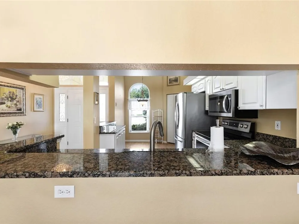 One or more photo(s) has been virtually staged. Where to start? This beautifully updated 2-bedroom, 2-bath home with a den (easily converted to a third bedroom) offers nearly 1,600 sq. ft. of living space and sits right on the 1st hole of the golf course. Featuring a 2-car garage, screened entry with paver driveway and walkway, and a 2021 roof with a brand-new 2023 AC, this home is truly turn-key. Step inside to soaring vaulted ceilings in the living room, wood laminate flooring throughout, and tile in both bathrooms. The master suite boasts a large walk-in closet, updated vanity with granite countertops, and direct access to the enclosed sunroom through sliding glass doors. The sunroom shines with elegant porcelain tile, while the French doors leading to the den add charm and flexibility. The eat-in kitchen is a chef’s delight with granite countertops, new appliances, and plenty of space to gather. A full-sized washer and dryer are conveniently located in the laundry room. This home blends comfort, style, and functionality—all with stunning golf course views. Service fees includes trash pickup, basic cable, 24-hour security, access to all community amenities, and maintenance of common areas and facilities, Lawn mowing, watering and fertilization. Residents of this community enjoy access to numerous amenities with six pools ( 1 indoor ), 5 Hot tubs - spanning across three different club houses! But it doesn't stop there.. Over a 150 clubs to join, two recently updated workout centers, Enjoy meals at the on-site restaurant or hit the greens at the community golf course. Plus, there's a dedicated dog park for your furry friends. This community ensures an active and fulfilling lifestyle. Don’t miss out on this opportunity to make this home yours!