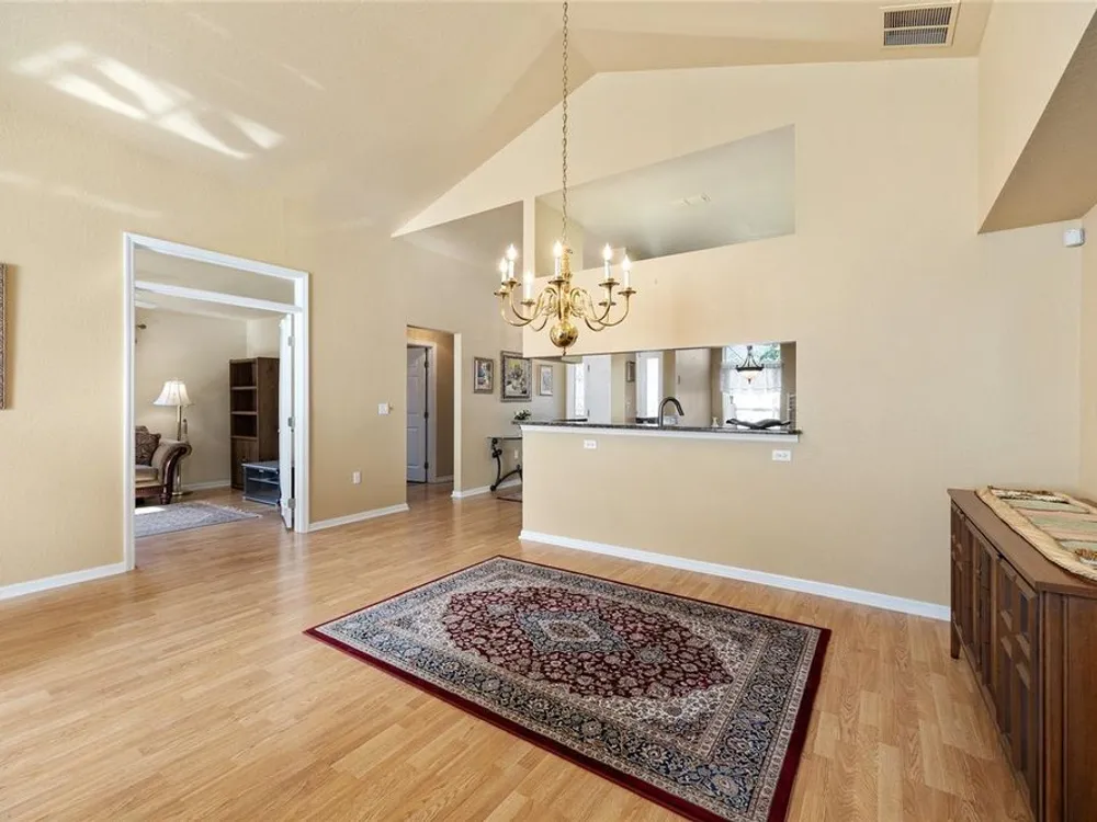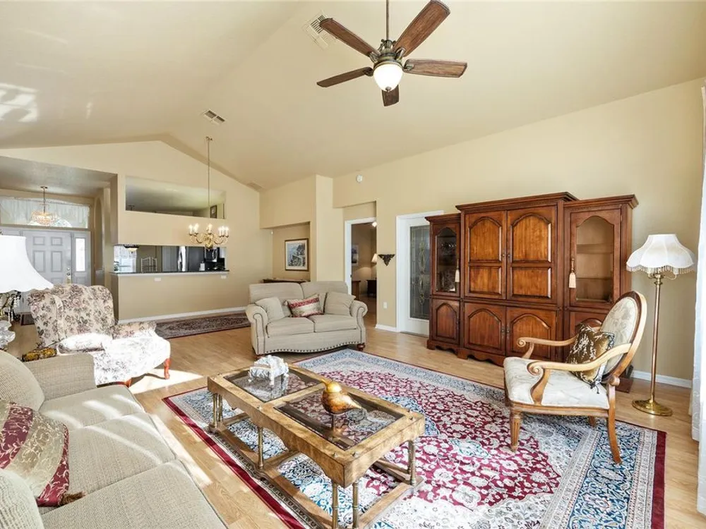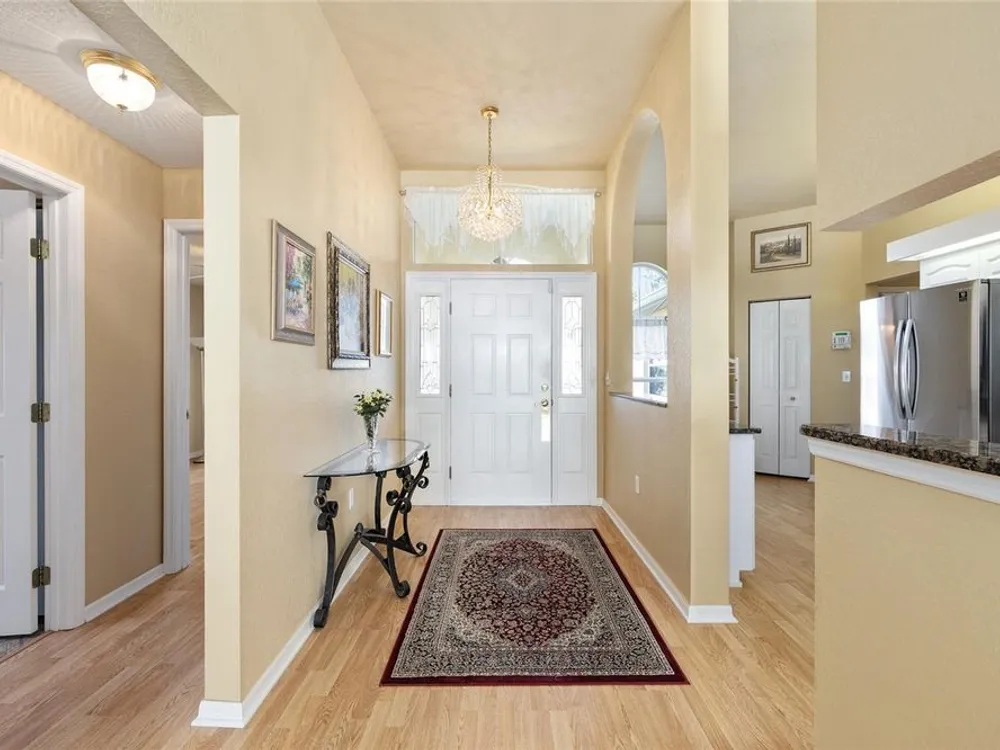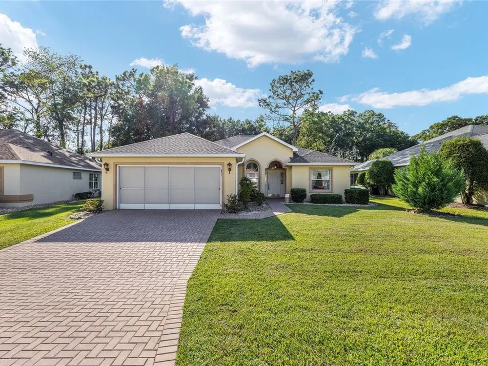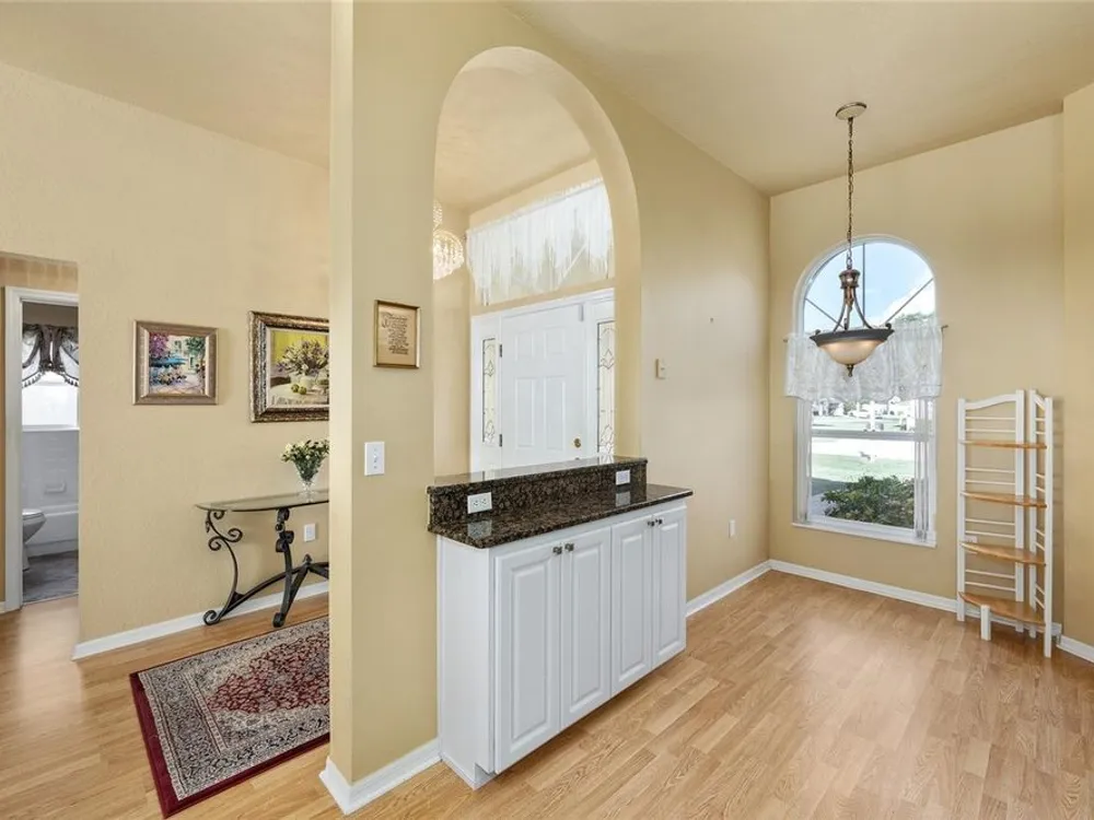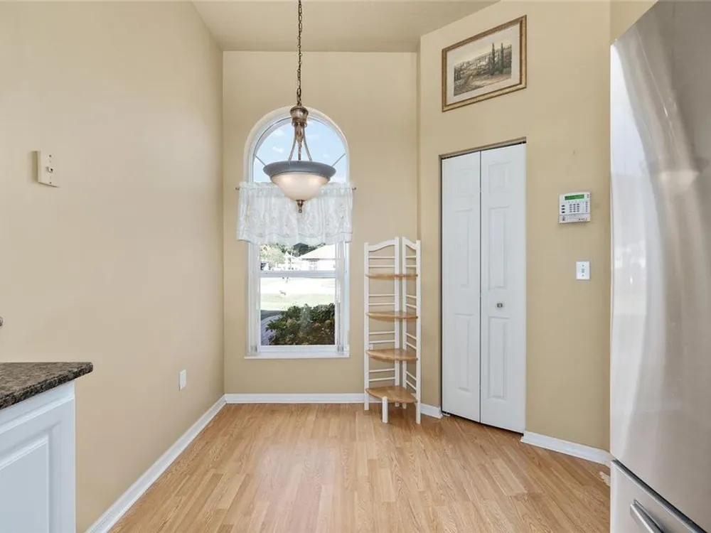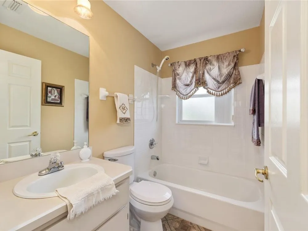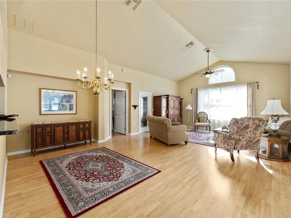 One or more photo(s) has been virtually staged. Where to start? This beautifully updated 2-bedroom, 2-bath home with a den (easily converted to a third bedroom) offers nearly 1,600 sq. ft. of living space and sits right on the 1st hole of the golf course. Featuring a 2-car garage, screened entry with paver driveway and walkway, and a 2021 roof with a brand-new 2023 AC, this home is truly turn-key. Step inside to soaring vaulted ceilings in the living room, wood laminate flooring throughout, and tile in both bathrooms. The master suite boasts a large walk-in closet, updated vanity with granite countertops, and direct access to the enclosed sunroom through sliding glass doors. The sunroom shines with elegant porcelain tile, while the French doors leading to the den add charm and flexibility. The eat-in kitchen is a chef’s delight with granite countertops, new appliances, and plenty of space to gather. A full-sized washer and dryer are conveniently located in the laundry room. This home blends comfort, style, and functionality—all with stunning golf course views. Service fees includes trash pickup, basic cable, 24-hour security, access to all community amenities, and maintenance of common areas and facilities, Lawn mowing, watering and fertilization. Residents of this community enjoy access to numerous amenities with six pools ( 1 indoor ), 5 Hot tubs - spanning across three different club houses! But it doesn't stop there.. Over a 150 clubs to join, two recently updated workout centers, Enjoy meals at the on-site restaurant or hit the greens at the community golf course. Plus, there's a dedicated dog park for your furry friends. This community ensures an active and fulfilling lifestyle. Don’t miss out on this opportunity to make this home yours!