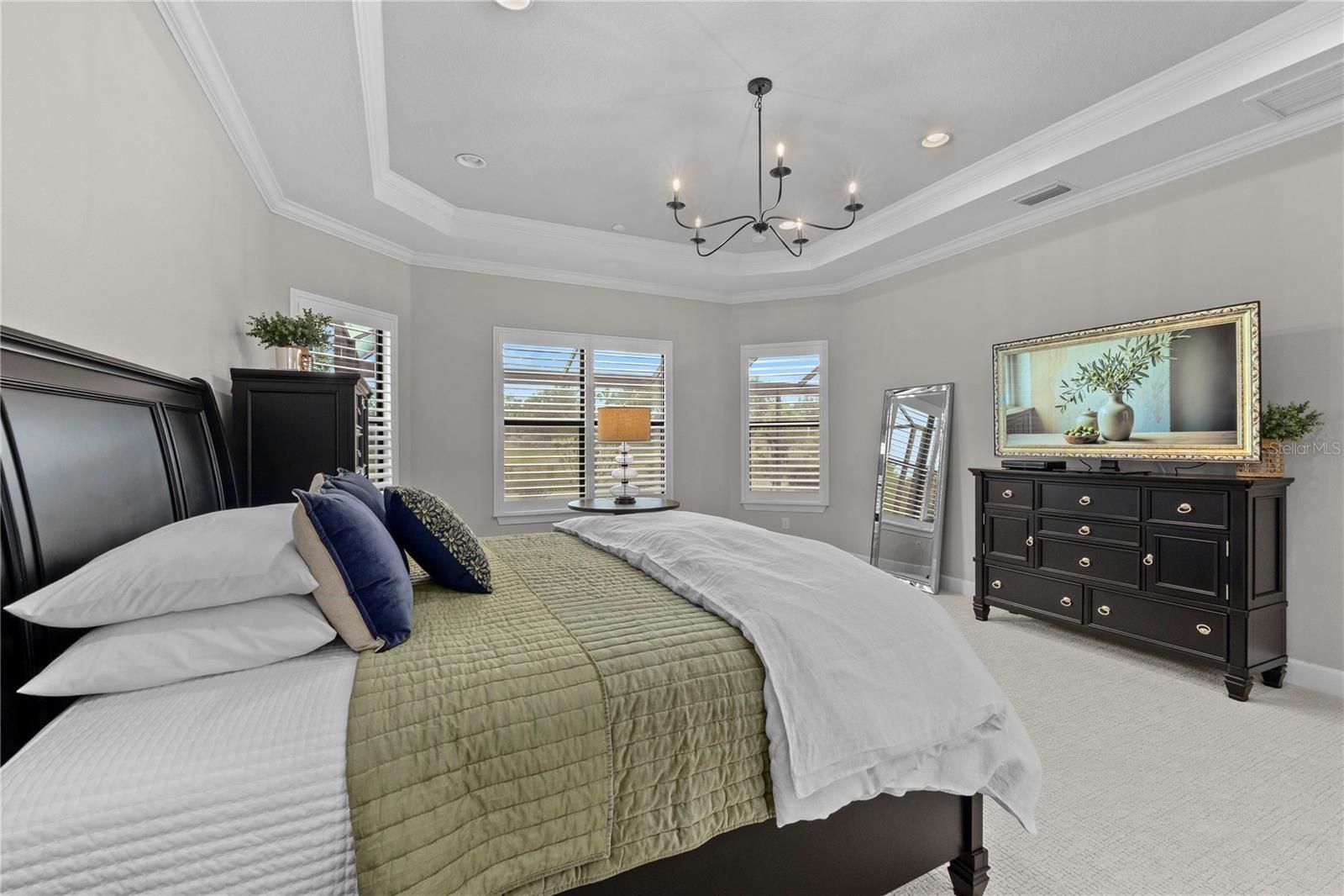 - Ceiling Fan(s), Crown Molding, Eat-in Kitchen, High Ceilings, Open Floorplan, Stone Counters, Thermostat, Tray Ceiling(s), Walk-In Closet(s), Window Treatments