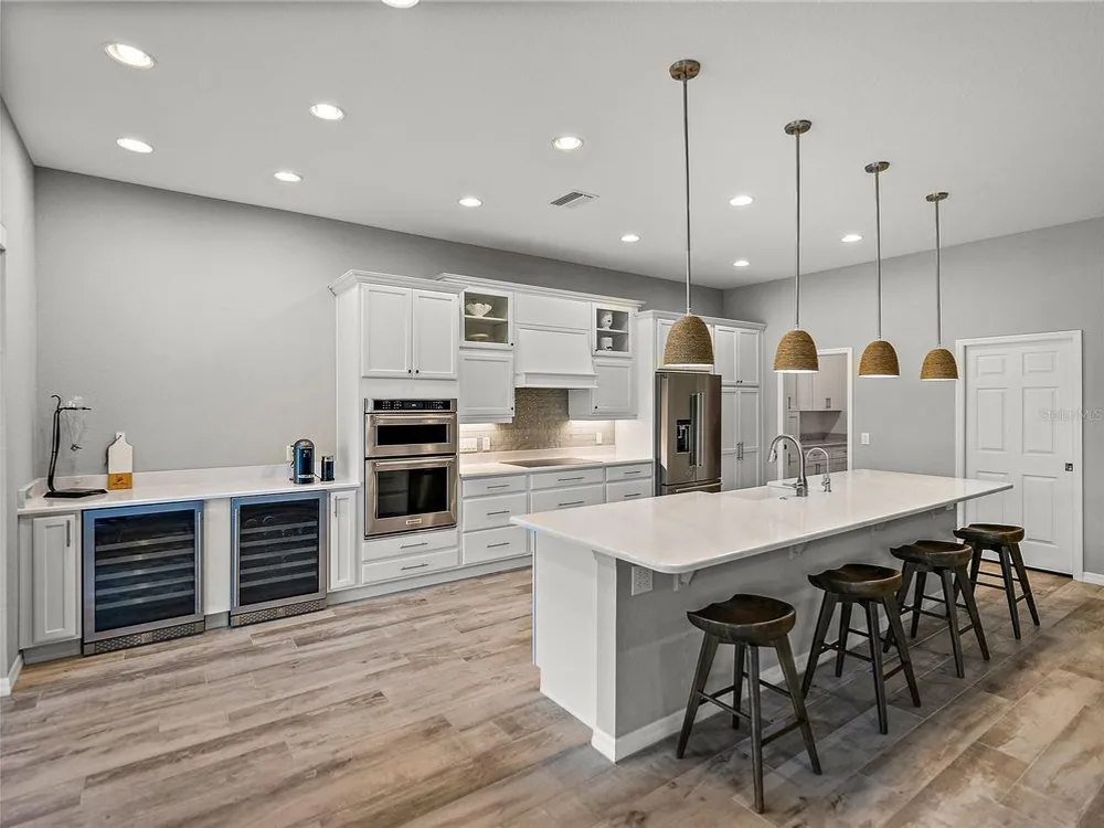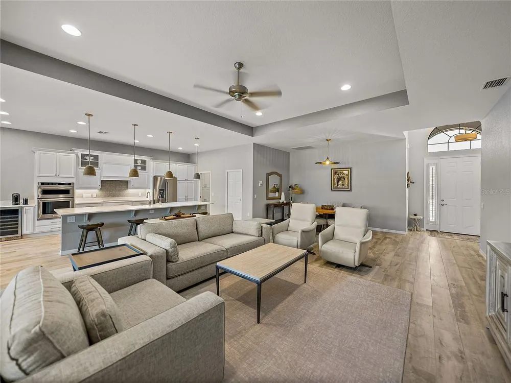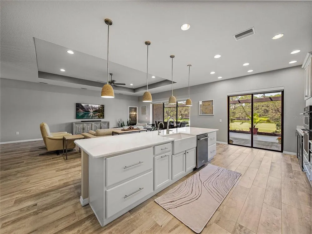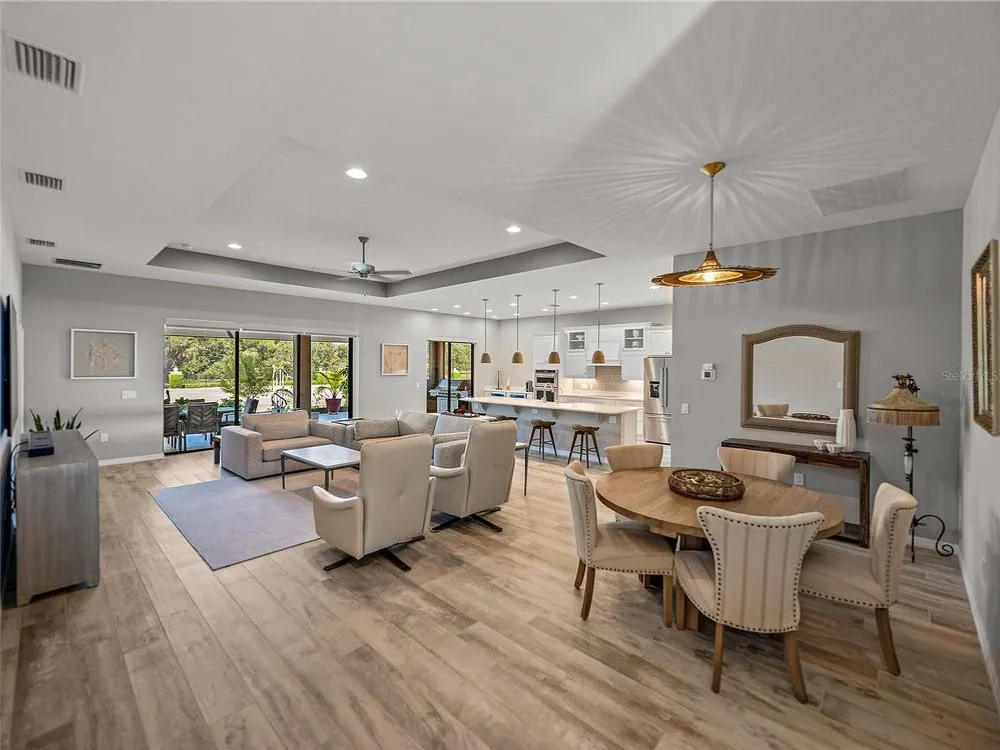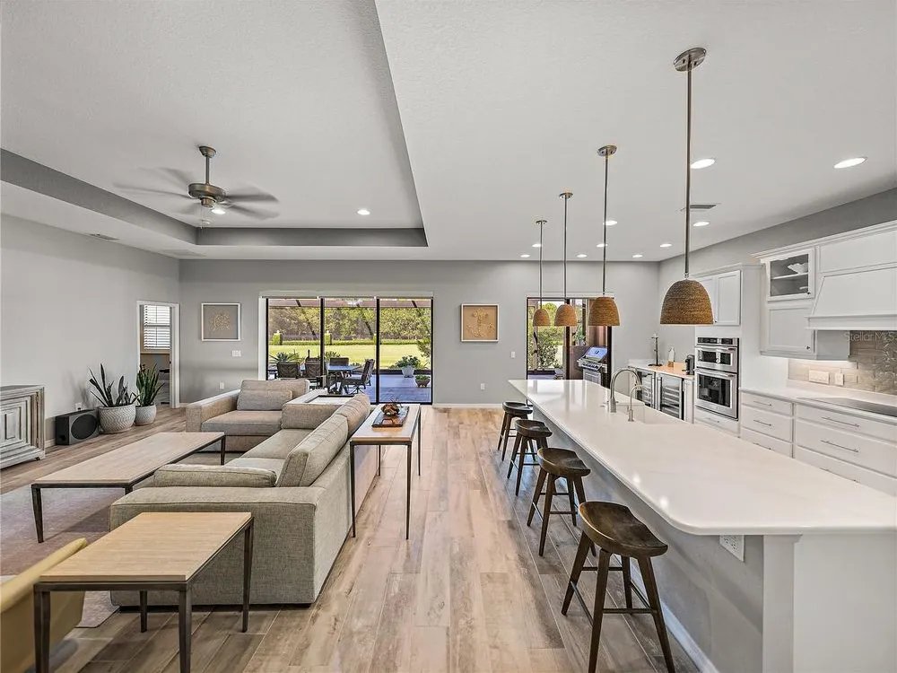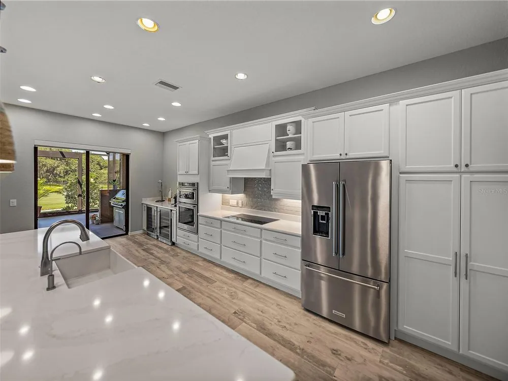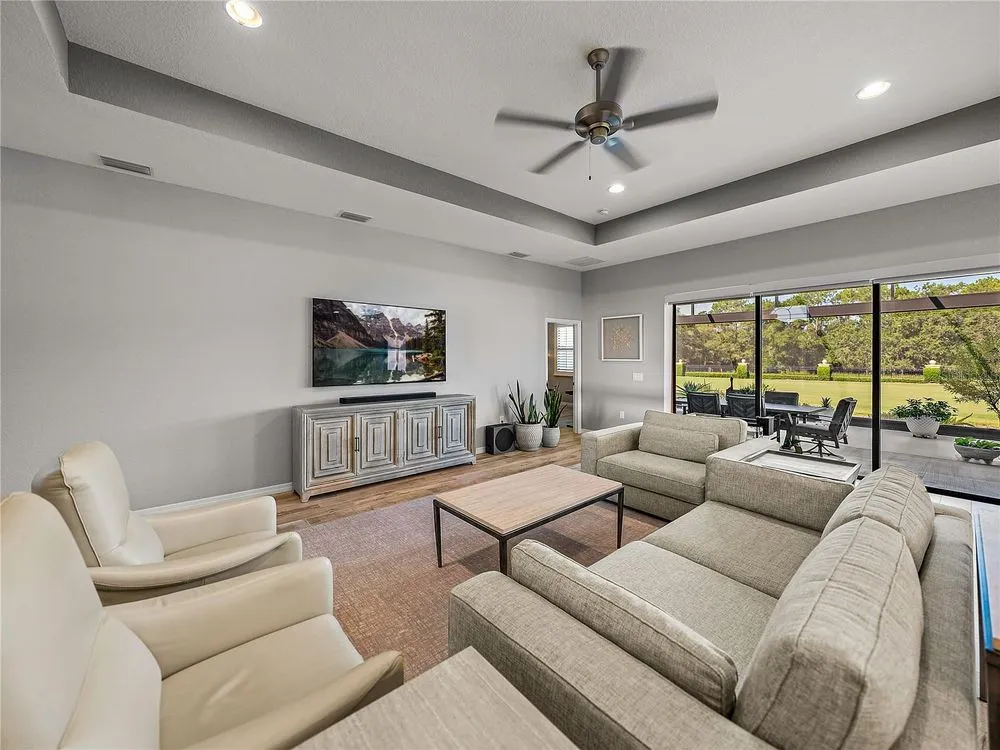 Welcome to your next chapter in beautiful Lake Ashton—Central Florida’s premier 55+ active-adult community. This immaculate, nearly new home (just 3 years young) offers a perfect blend of tasteful style, elegance, and Florida charm. With 3 spacious bedrooms and 2 full baths, this open-concept floor plan, with 10’ ceilings and 8’ doors, feels spacious, yet warm and comfortable. It is ideal for both relaxed living and gracious entertaining. Upon approaching the home, you will immediately be impressed by the exterior stone facing, beautiful landscaping with concrete curbing and small river rock, the full-width paver driveway, bronze trim and gutters, and front screened entry. The spacious living area is highlighted by an amazing chef’s kitchen with stunning white cabinets, and a one-level island providing additional kitchen workspace. The kitchen alone features over $30,000 in upgrades, including the outstanding chef’s KitchenAid stainless steel appliance package with PrintShield Finish, a 36” induction cooktop and separate, built-in oven and microwave. The base kitchen cabinets were extended to the west exterior wall. The kitchen and flex room feature abundant cabinets, shelving, and storage areas. The living room and primary bedroom have elegant coffered ceilings, and the primary bedroom has a spacious, custom walk-in closet. The home is accented by custom tile flooring throughout. The sliding glass doors are pocketed to allow fully opening to the expanded, screened veranda. With its panoramic view overlooking the golf course, the veranda is splendid for both entertaining and relaxing in your delightful residence. The home features custom fans, hardware, and lighting throughout, as well as five pocket doors. In total, the home has over $198,000 of custom upgrades, making it truly a signature residence! More than a neighborhood, Lake Ashton is a lifestyle. Residents enjoy two 18-hole championship golf courses, a 26,000 sq ft clubhouse, a state-of-the-art Health & Fitness Center, both indoor and outdoor swimming pools, pickleball courts, bowling alley, theater, on-site restaurant, and a vibrant calendar of social events and clubs. Don’t miss this exceptional opportunity to own a home that truly has it all. Call today to schedule your private showing—your Florida dream awaits!