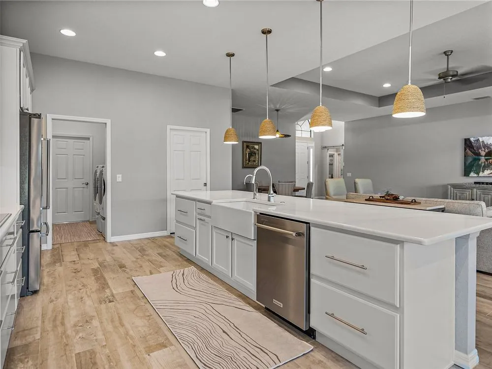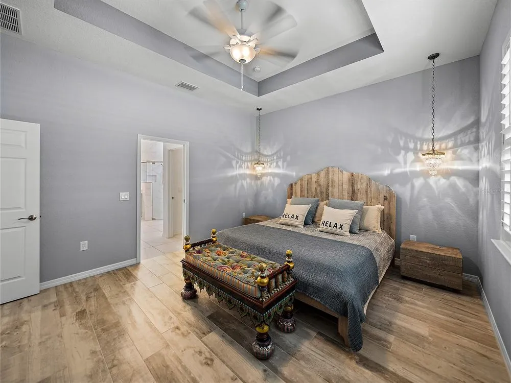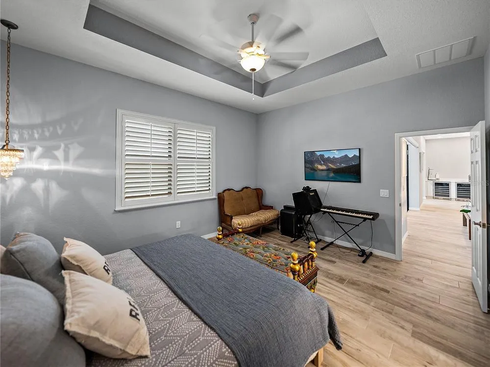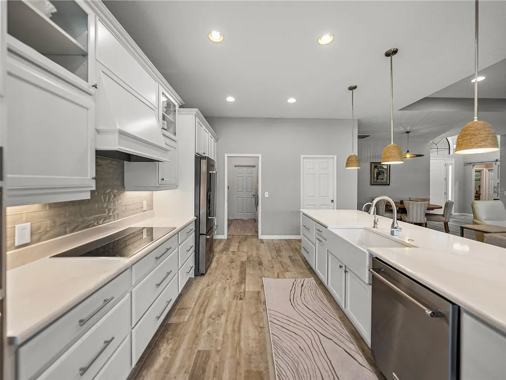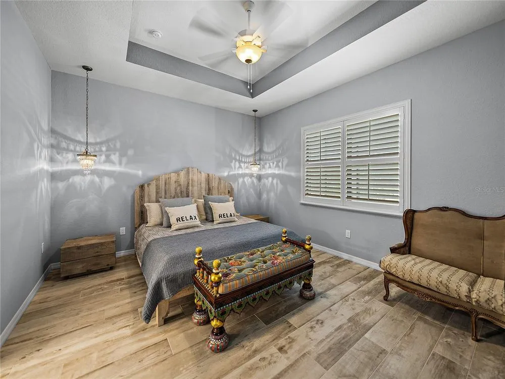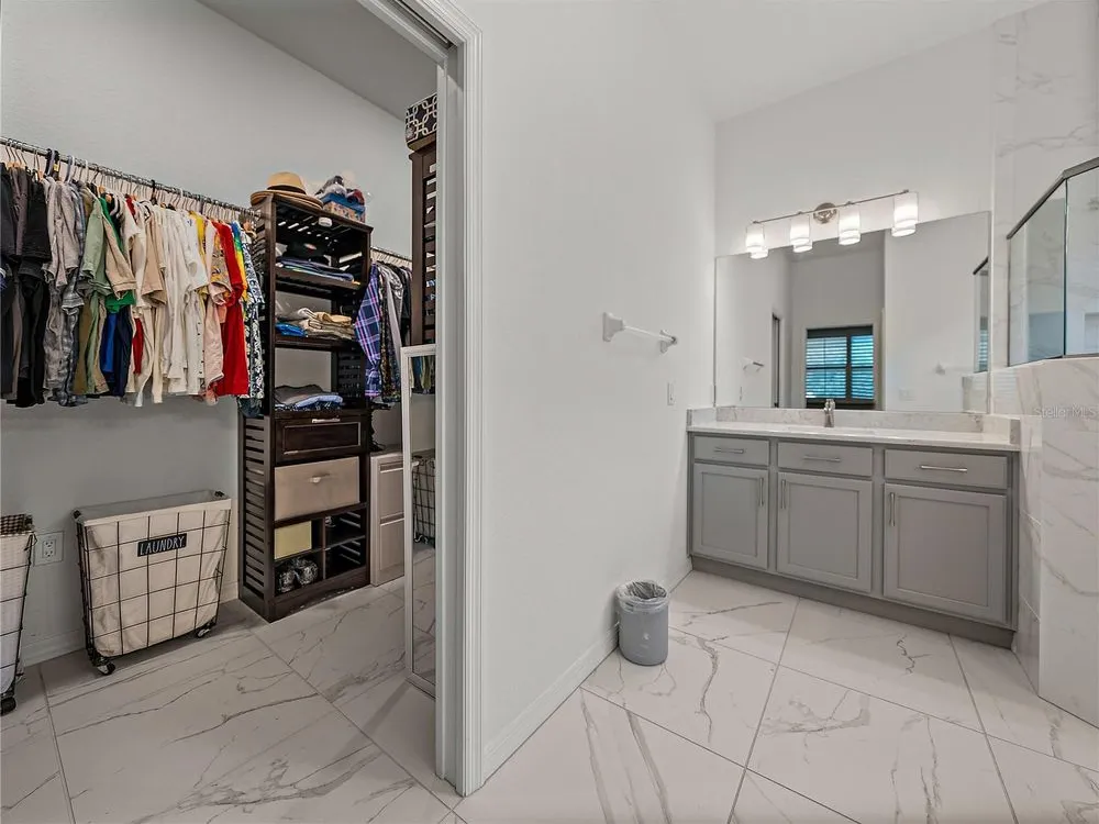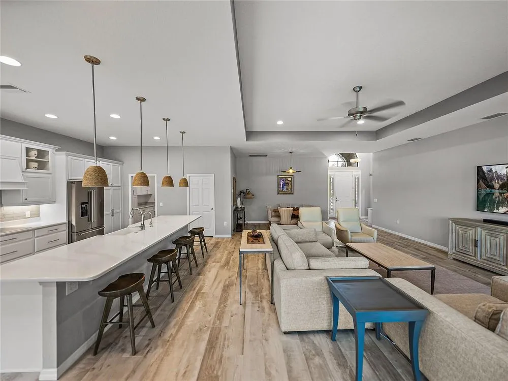 Welcome to your next chapter in beautiful Lake Ashton—Central Florida’s premier 55+ active-adult community. This immaculate, nearly new home (just 3 years young) offers a perfect blend of tasteful style, elegance, and Florida charm. With 3 spacious bedrooms and 2 full baths, this open-concept floor plan, with 10’ ceilings and 8’ doors, feels spacious, yet warm and comfortable. It is ideal for both relaxed living and gracious entertaining. Upon approaching the home, you will immediately be impressed by the exterior stone facing, beautiful landscaping with concrete curbing and small river rock, the full-width paver driveway, bronze trim and gutters, and front screened entry. The spacious living area is highlighted by an amazing chef’s kitchen with stunning white cabinets, and a one-level island providing additional kitchen workspace. The kitchen alone features over $30,000 in upgrades, including the outstanding chef’s KitchenAid stainless steel appliance package with PrintShield Finish, a 36” induction cooktop and separate, built-in oven and microwave. The base kitchen cabinets were extended to the west exterior wall. The kitchen and flex room feature abundant cabinets, shelving, and storage areas. The living room and primary bedroom have elegant coffered ceilings, and the primary bedroom has a spacious, custom walk-in closet. The home is accented by custom tile flooring throughout. The sliding glass doors are pocketed to allow fully opening to the expanded, screened veranda. With its panoramic view overlooking the golf course, the veranda is splendid for both entertaining and relaxing in your delightful residence. The home features custom fans, hardware, and lighting throughout, as well as five pocket doors. In total, the home has over $198,000 of custom upgrades, making it truly a signature residence! More than a neighborhood, Lake Ashton is a lifestyle. Residents enjoy two 18-hole championship golf courses, a 26,000 sq ft clubhouse, a state-of-the-art Health & Fitness Center, both indoor and outdoor swimming pools, pickleball courts, bowling alley, theater, on-site restaurant, and a vibrant calendar of social events and clubs. Don’t miss this exceptional opportunity to own a home that truly has it all. Call today to schedule your private showing—your Florida dream awaits!