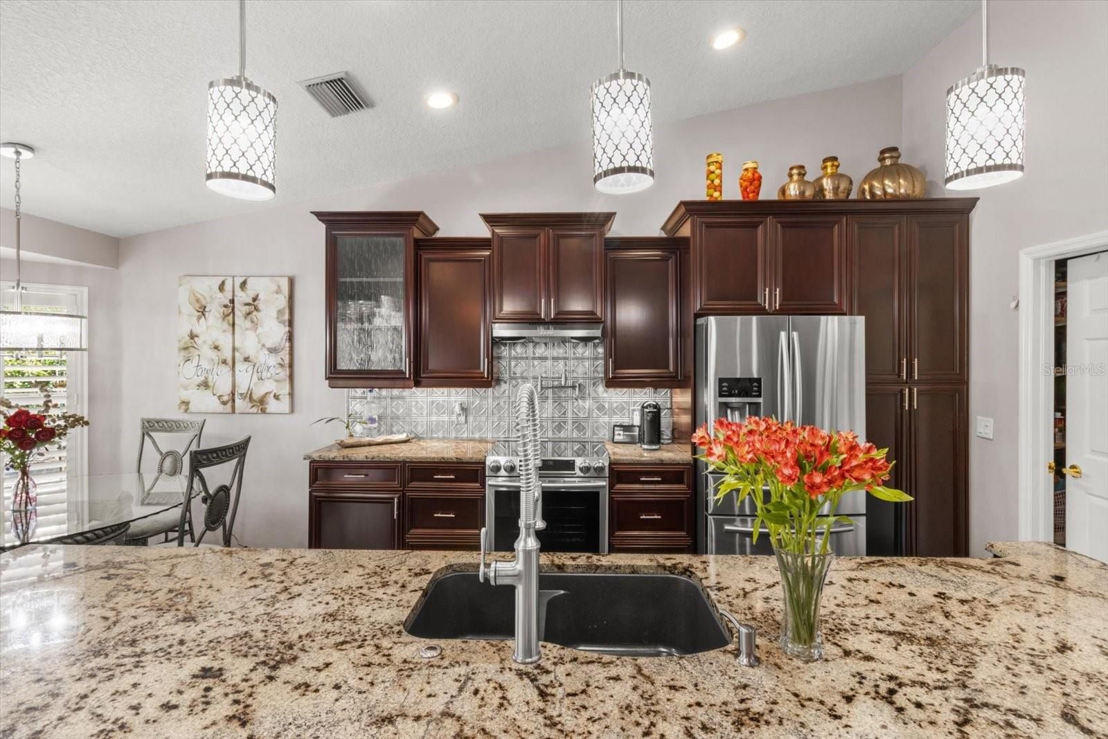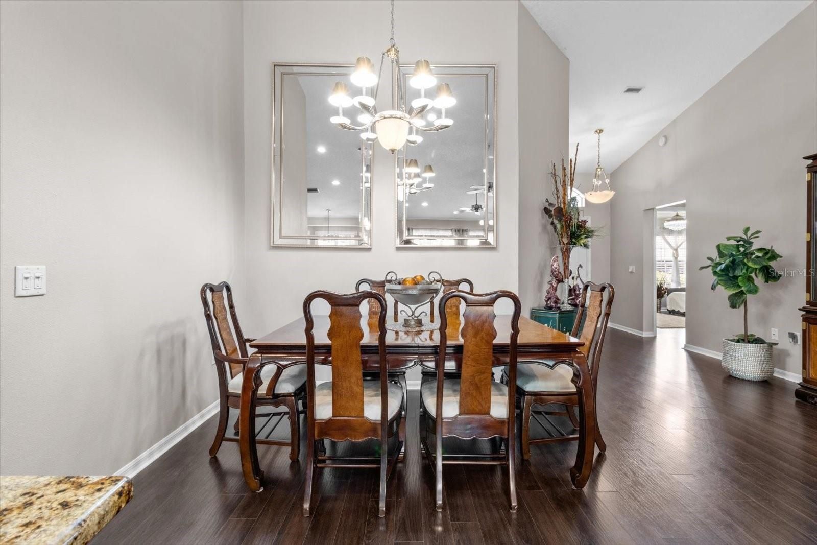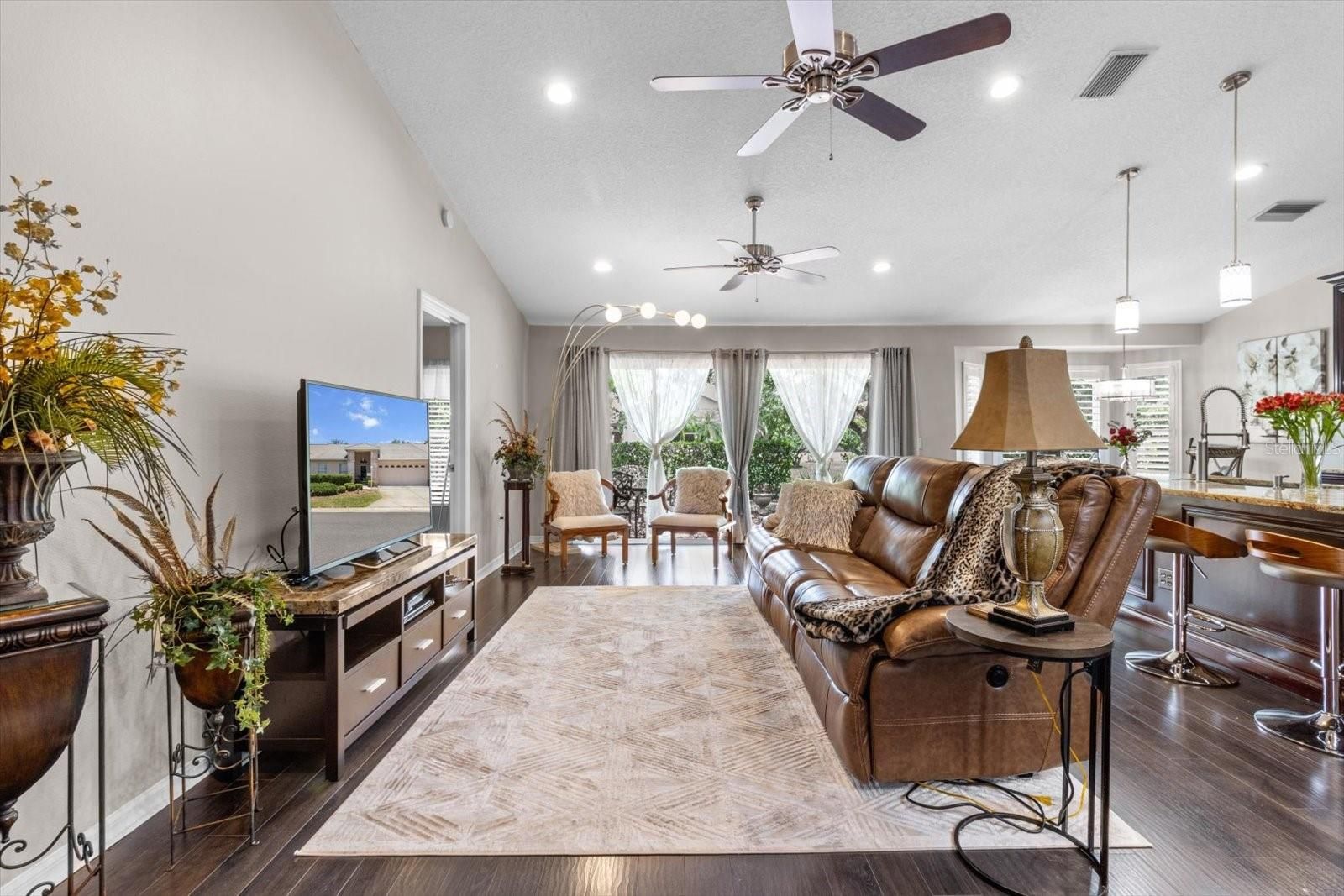 - Cathedral Ceiling(s), Ceiling Fan(s), Eat-in Kitchen, High Ceilings, Living/Dining Room, Solid Surface Counters, Solid-Wood Cabinets