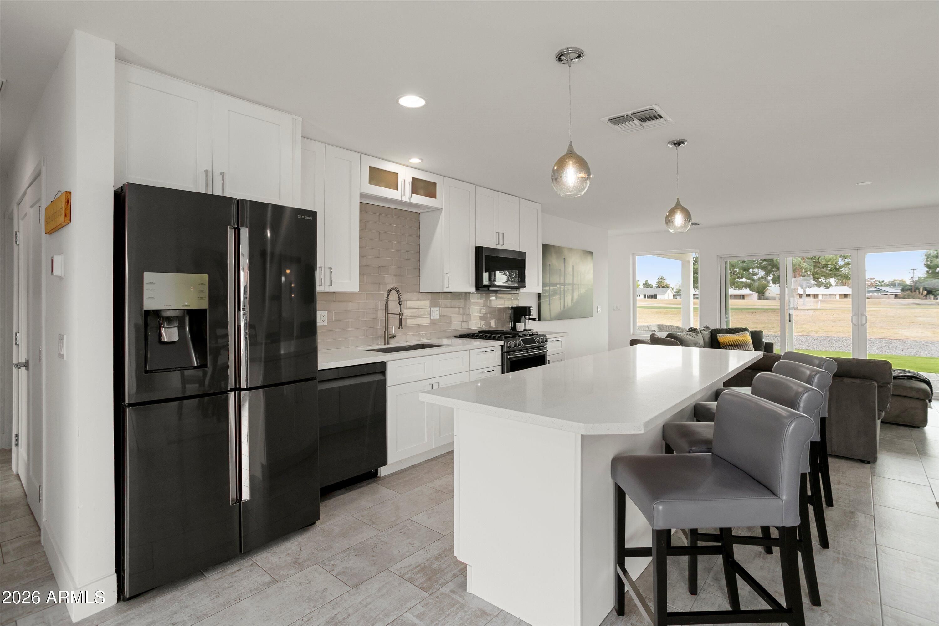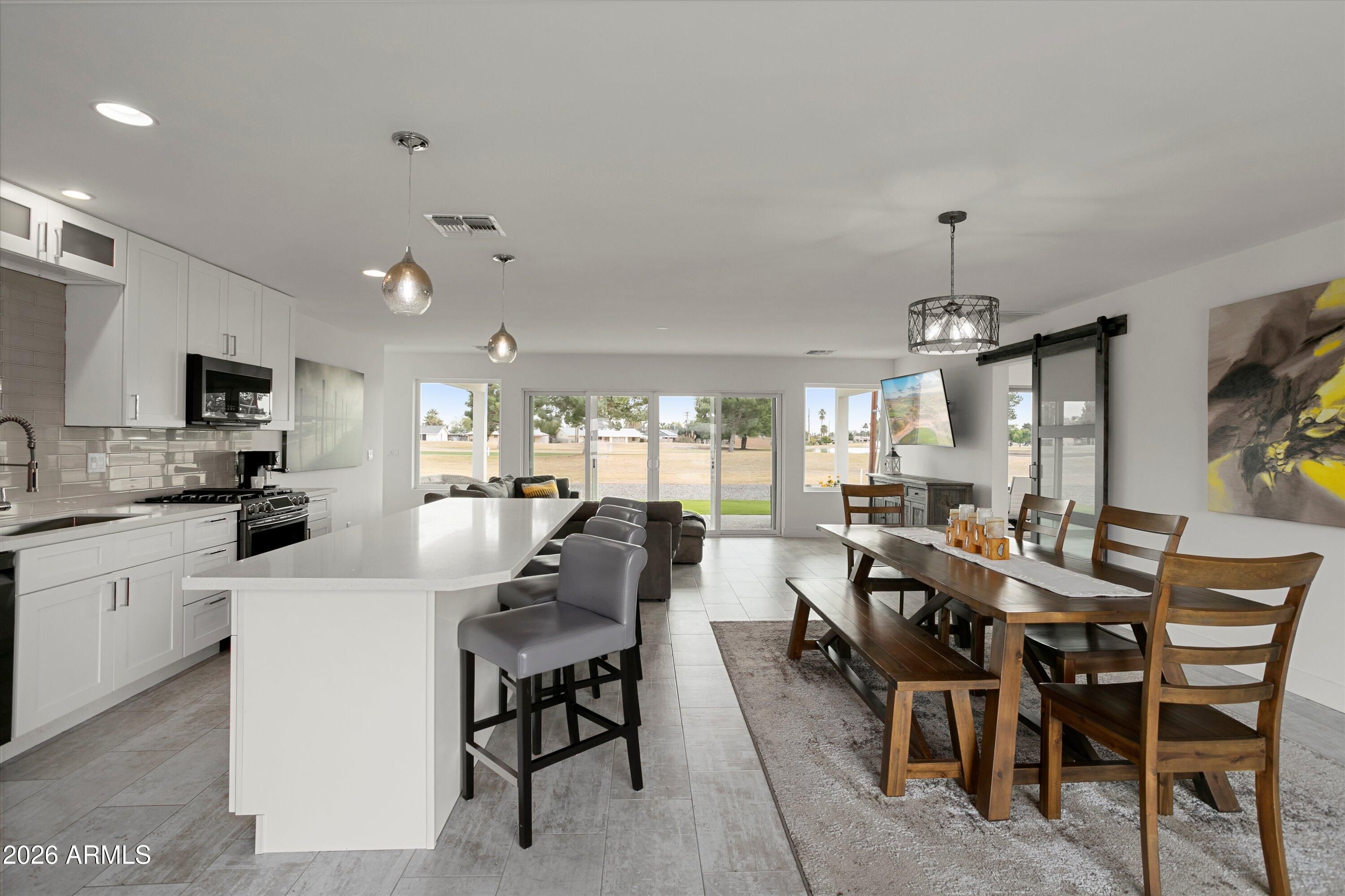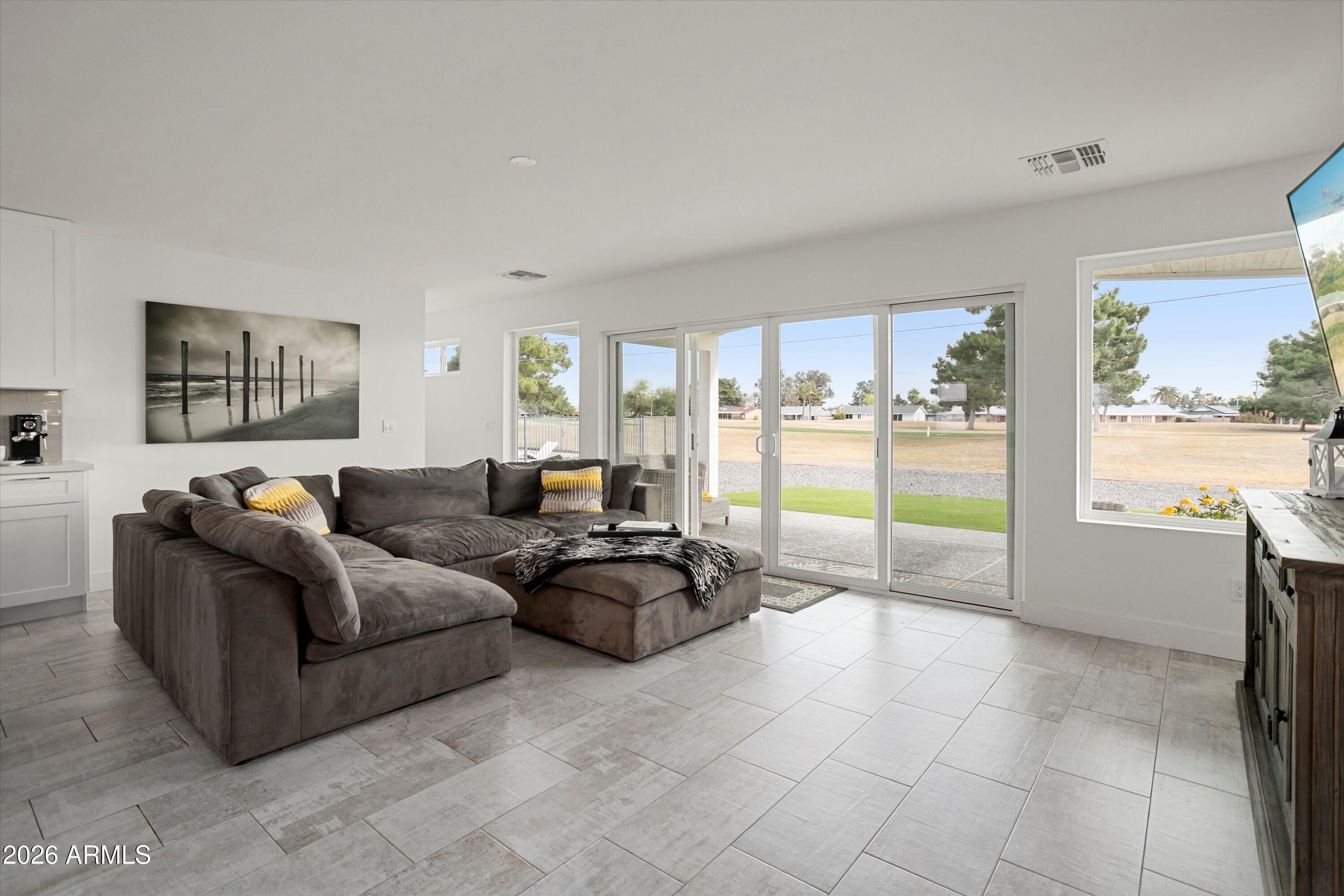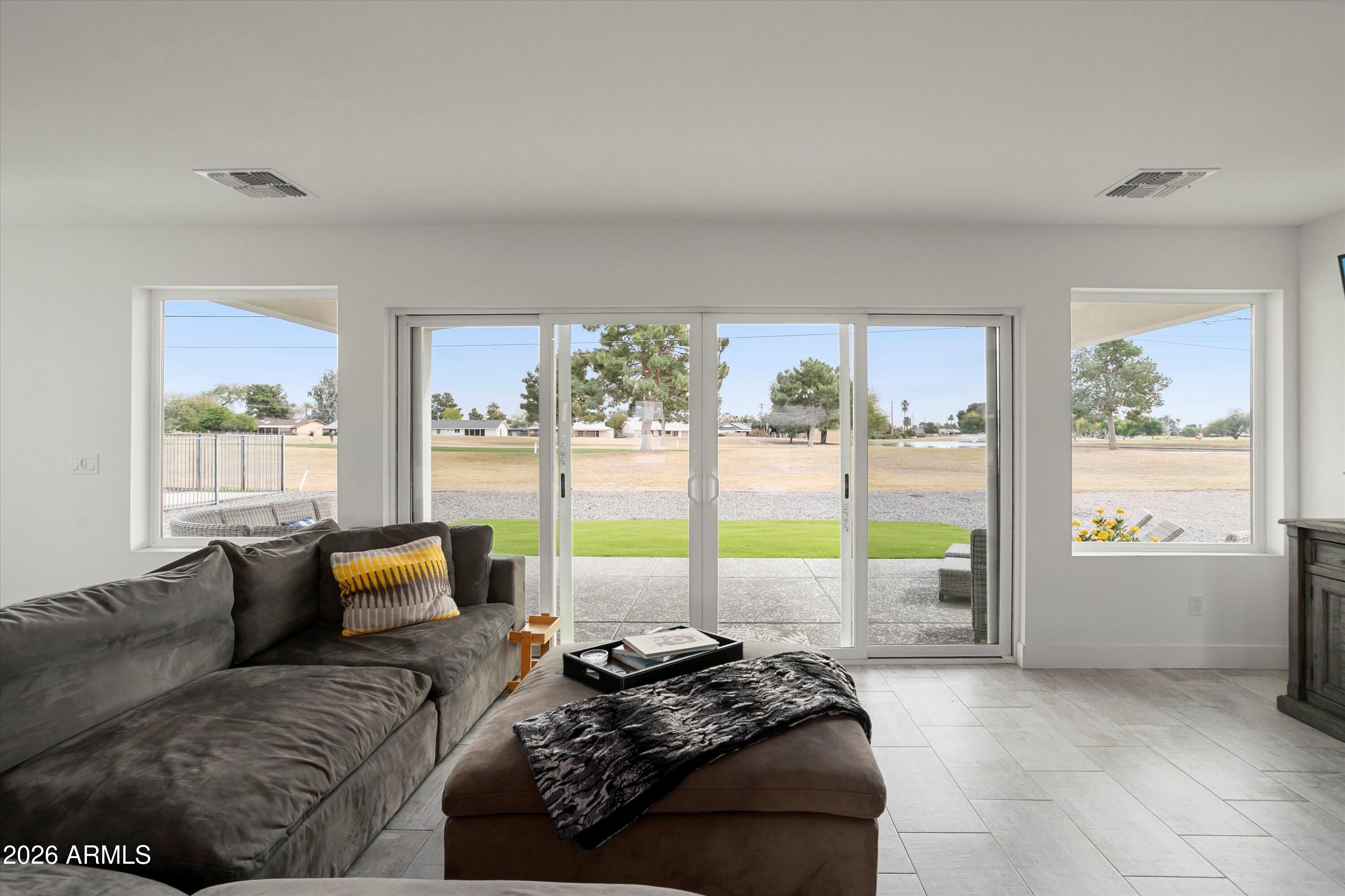 Welcome to your fully remodeled, move-in ready Sun City golf course retreat, perfectly positioned on Hole #6 of the South Course with stunning fairway and lake views. Step inside to an open, light-filled floorplan featuring modern finishes, a show-stopping kitchen with oversized island, and seamless indoor-outdoor living. Enjoy the spacious primary suite and relax on the covered patio overlooking the water feature and fairway. Highlights include owned solar that contributes to electricity costs, a tankless water heater, 220V hot tub-ready outlet, and split bedroom layout. Close to shopping, dining, healthcare, and Sun City amenities.