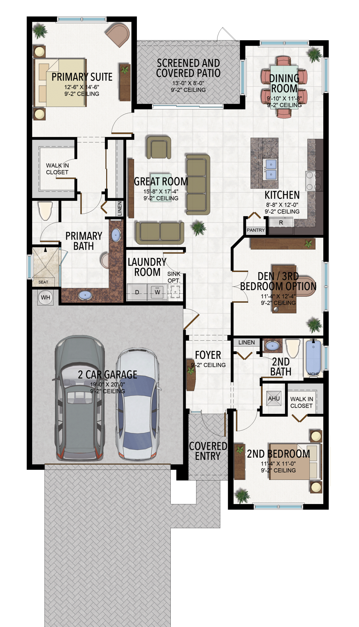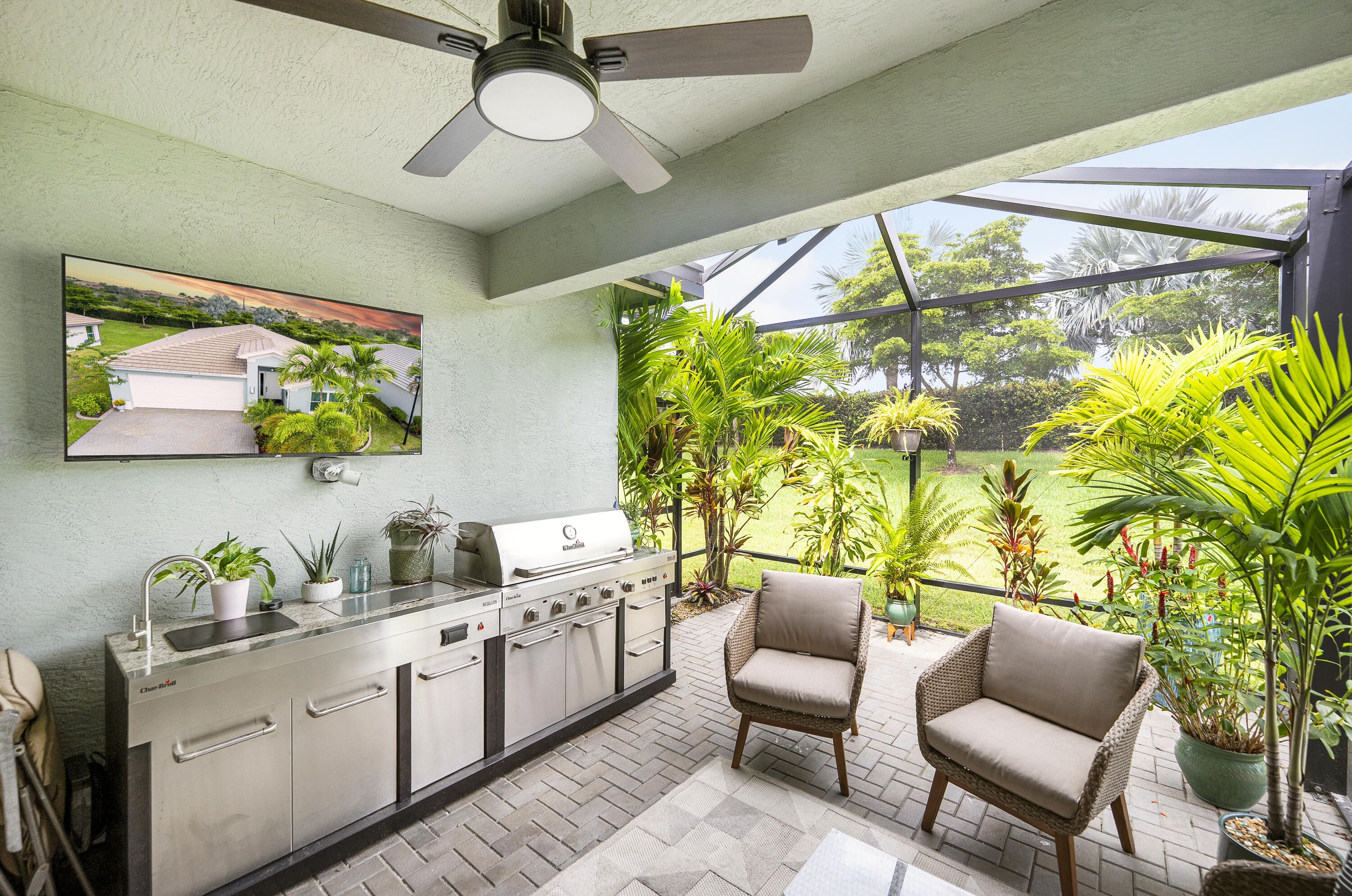 MOST POPULAR IBIS-SHOWS LIKE A MODEL HOME! Impeccably maintained and situated on a larger lot, this 2-bedroom + den, 2-bath, 2-car garage home offers luxury living inside and out. The extended screened lanai features a full outdoor kitchen with sink, natural gas grill and infrared grill--perfect for entertaining.Step inside to a light and bright open layout with tile flooring throughout the main living areas, fresh interior paint, elegant foyer entry, crown molding, and custom touches at every turn. The stunning great room showcases a ''fandalier'' (a crystal chandelier with a built-in modern fan) and floor outlets for flexible furniture placement. The gourmet kitchen boasts granite countertops and backsplash, gas stove, upgraded soft-close cabinets and drawers, accent cabinet lighting