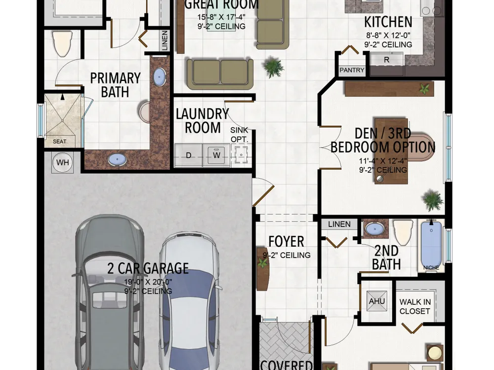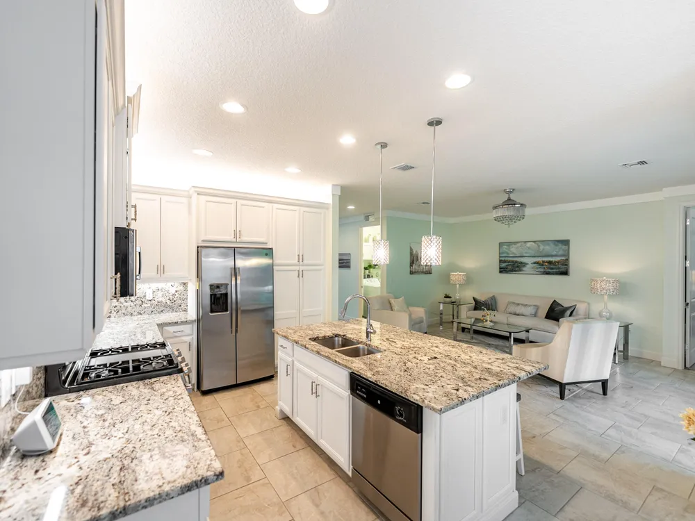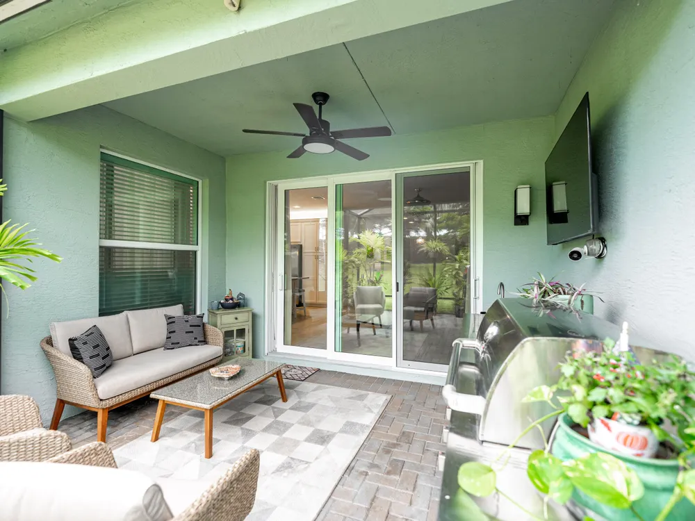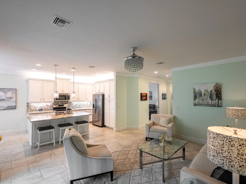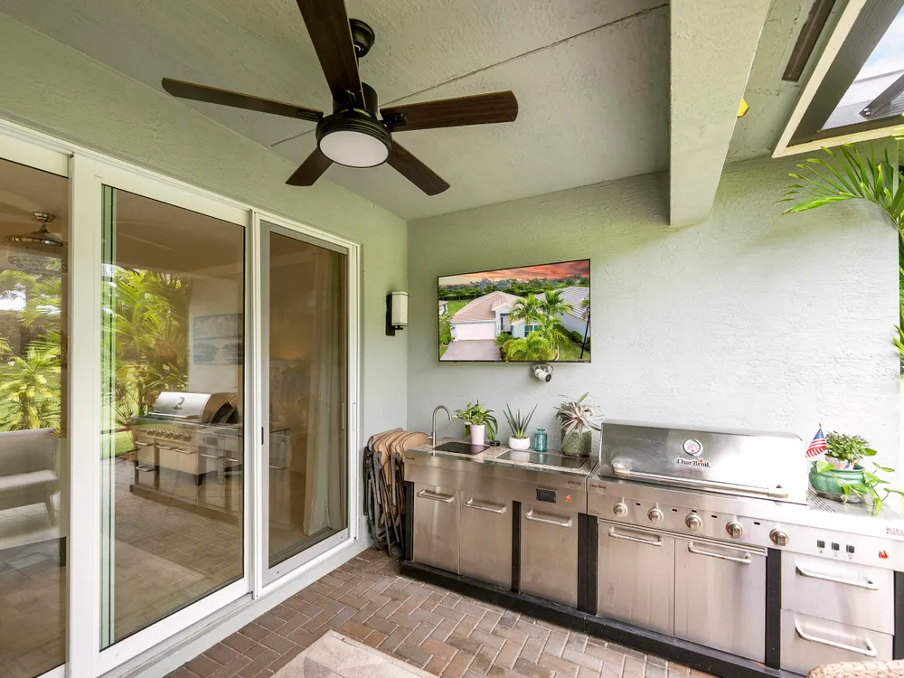 MOST POPULAR IBIS MODEL - $60K+ IN UPGRADES & SHOWS LIKE A MODEL HOME!Impeccably maintained and situated on a larger lot, this 2-bedroom + den, 2-bath, 2-car garage home offers luxury living inside and out. The extended screened lanai features a full outdoor kitchen with sink, natural gas grill and infrared grill--perfect for entertaining.Step inside to a light and bright open layout with tile flooring throughout the main living areas, fresh interior paint, elegant foyer entry, crown molding, and custom touches at every turn. The stunning great room showcases a ''fandalier'' (a crystal chandelier with a built-in modern fan) and floor outlets for flexible furniture placement.The gourmet kitchen boasts granite countertops and backsplash,