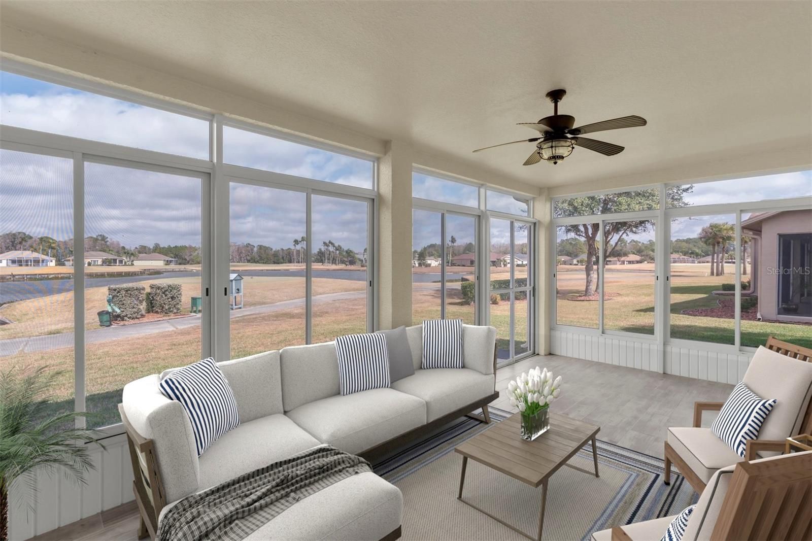 One or more photo(s) has been virtually staged. Relax and enjoy the view from this beautifully updated Heritage Springs home, perfectly positioned on a quiet cul-de-sac. This 3-bedroom, 2-bath residence is set in one of the most desirable locations in the sought-after, gated 55+ community, offering breathtaking views of both the championship golf course and the main pond with its iconic fountain, all within a short and easy walk to the clubhouse and amenities. Updated in 2021, the heart of the home is the stunning kitchen featuring LG stainless steel appliances, quartz countertops, soft-close doors and drawers, a large sink, and a pot-filler above the stove. The kitchen opens seamlessly to the great room and dinette, where bay windows frame postcard-worthy pond and golf course views — making it easy to cook, dine, and entertain with a view. The enclosed Florida room is fully tiled and surrounded by windows, creating the perfect space to relax, unwind, and watch golfers stroll by while enjoying serene water and fairway scenery. The primary suite offers sliding glass doors to the Florida room and an updated en suite bath with dual sinks, two walk-in closets, and a spacious walk-in shower. A desirable split-bedroom floor plan provides two additional bedrooms and an updated second bath, ideal for guests or a home office. Additional living and dining space adds flexibility for entertaining or quiet evenings at home. Throughout the home, there are no carpets here—just beautiful wide-plank luxury vinyl flooring, complemented by modern updated lighting and ceiling fans. Additional upgrades include a brand-new roof (2021) and a whole-home water filtration system, offering both peace of mind and everyday comfort. The Heritage Springs clubhouse is just a short walk away and features a heated pool with spa, full restaurant with bar, game room, fitness center, craft room, tennis courts, and an active calendar of social activities, making it easy to enjoy a true resort-style lifestyle .This is Florida living at its best — peaceful, scenic, and conveniently close to everything that makes Heritage Springs such a special place to call home.
