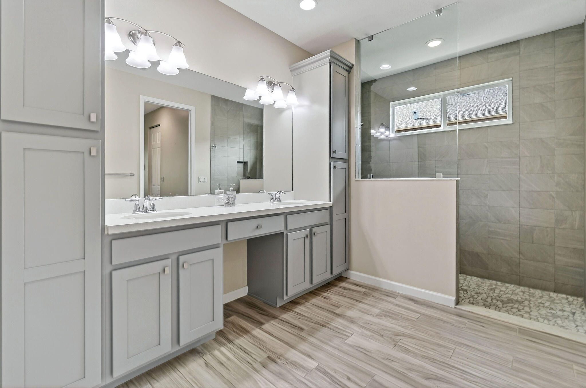 - Built-in Shelving, Closet Cabinetry, Cathedral Ceiling(s), Entry Level Living Area, Kitchen Island, Pantry, Split Bedrooms, Walk-In Closet(s), Home Office, Dual Sinks, Primary Downstairs, Sitting Area In Primary Bedroom, Separate Shower