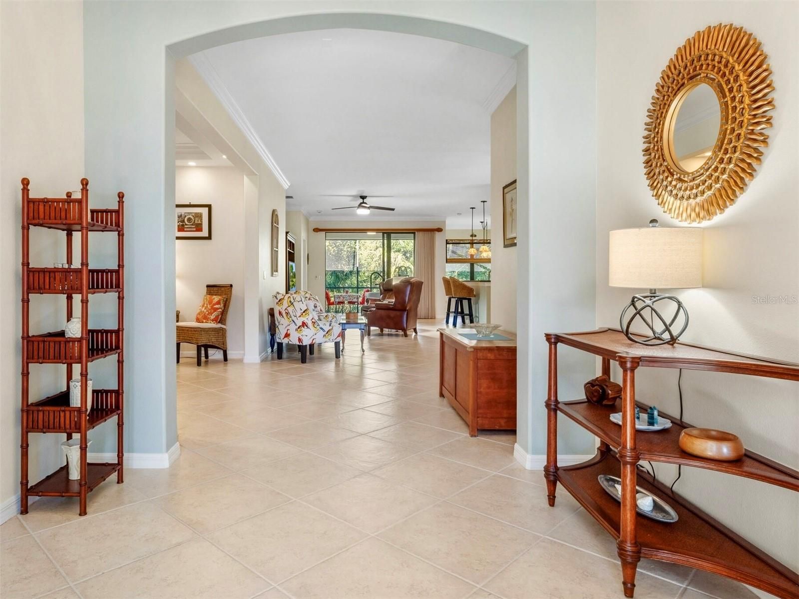 Experience maintenance-free, resort-style living in this beautiful 3 bedroom plus den, 2,102 sqft home in the premier 55+ community of Venetian Falls! Conveniently located just minutes from the sunny beaches, shopping, dining, and Venice's historic district, this Giovanni paired villa offers spacious rooms with crown molding, plantation shutters, central vacuum, and easy-to-use whole house storm protection. Step through the screened front entry into a wide foyer illuminated by a beveled glass door with sidelights and an overhead transom window. The kitchen features updated stainless-steel appliances, solid-wood cabinets with decorative trim, dining bar, and is open to the leisure area as well as a dining area surrounded by windows. The walk-in pantry provides ample storage space for staples, appliances, and platters. The primary suite, located at the rear of the home for added privacy, includes two closets (one a large walk-in) and a spacious bathroom with corner vanity with dual sinks, private water closet, linen closet, and a walk-in shower. At the front of the home, the guest bedroom and bathroom create a private retreat for visitors, and the den is a versatile space for a quiet sitting area or office. Enjoy the outdoors on the lanai, complete with hot tub! Soak in the ambiance of the serene preserve as a backdrop. This screened area is wonderful for grilling, dining, and lounging in the sun or shade. Buttoning up the property is easy convenient accordion storm shutters for the windows, plus remote-controlled shutter for the lanai, and roll-down for the front door. A welcoming pavered patio as you arrive at the front entryway adds to the lovely curb appeal of this property. Venetian Falls offers exceptional community amenities, including a resort-style clubhouse with a heated lap pool and spa, resistance-walking pool, state-of-the-art fitness center, billiards room, bocce courts, full-time activity director, and on-site management. The reasonable HOA fee includes lawn maintenance, irrigation, roof pressure washing, exterior paint, basic cable, and internet, with no CDD fee. Don’t miss the chance to make this remarkable home your own!