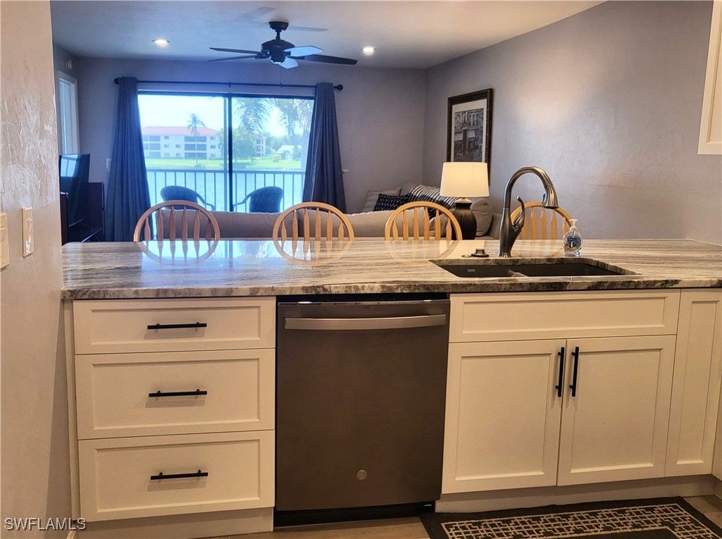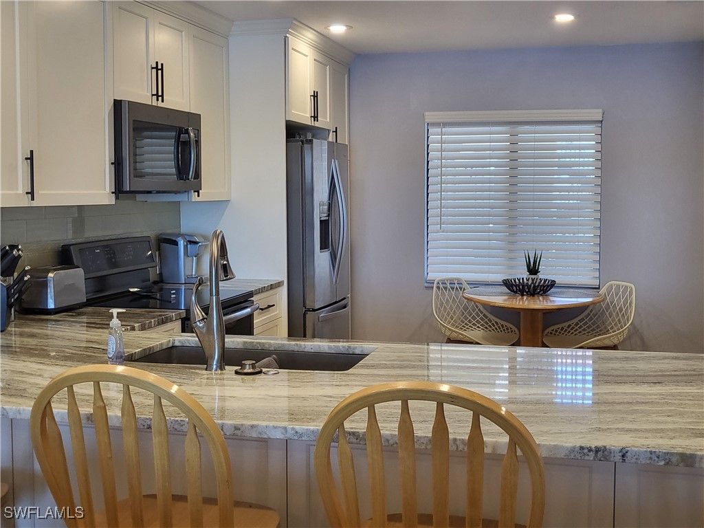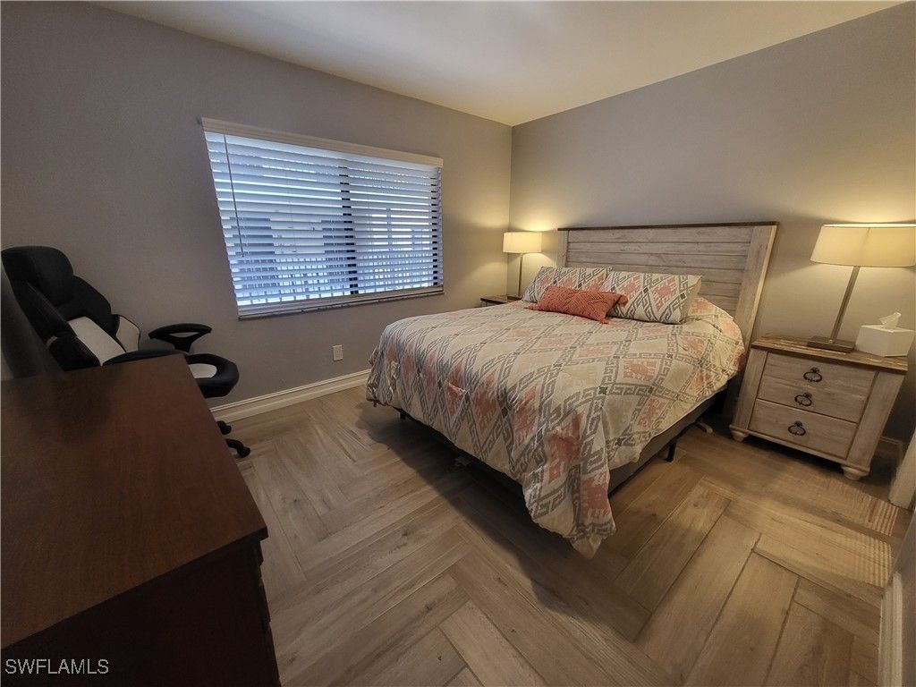 Ask about SELLER FINANCING! This is a beautiful completely UPDATED 2 bedroom 2 bathroom condo only minutes from the beaches! It's on the 2nd floor but there is an elevator! Open the sliders and enjoy the breeze and view of the lake. One pet up to 30 lbs is permitted. The kitchen is light and bright, fully open to the living room with breakfast bar large enough for 4 people! There are white cabinets and gorgeous granite countertops. There is plenty of storage and it is fully equipped with everything you could need. The main bedroom is large, and has an ensuite bathroom with large walk-in shower and walk-in closet. There is also a fully stocked linen closet. The roomy guest bedroom also has a walk-in closet. The guest bath has a tub/shower combo. This unit has a stunning lakeview from the screened balcony. Cinnamon Cove is a well-maintained gated community just a 5-minute drive to the beautiful beaches of Ft. Myers and Sanibel. There are so many amenities including community pool and spa, clubhouse, tennis, pickleball, shuffleboard, bocce and more. There is a covered carport and ample guest parking. This home is ready for you now, completely furnished and turnkey! Just bring your suitcase and enjoy Florida living!