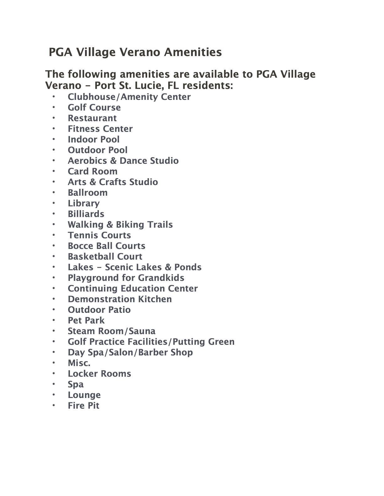 The following amenities are available to PGA Village Verano - Port St. Lucie, FL residents: