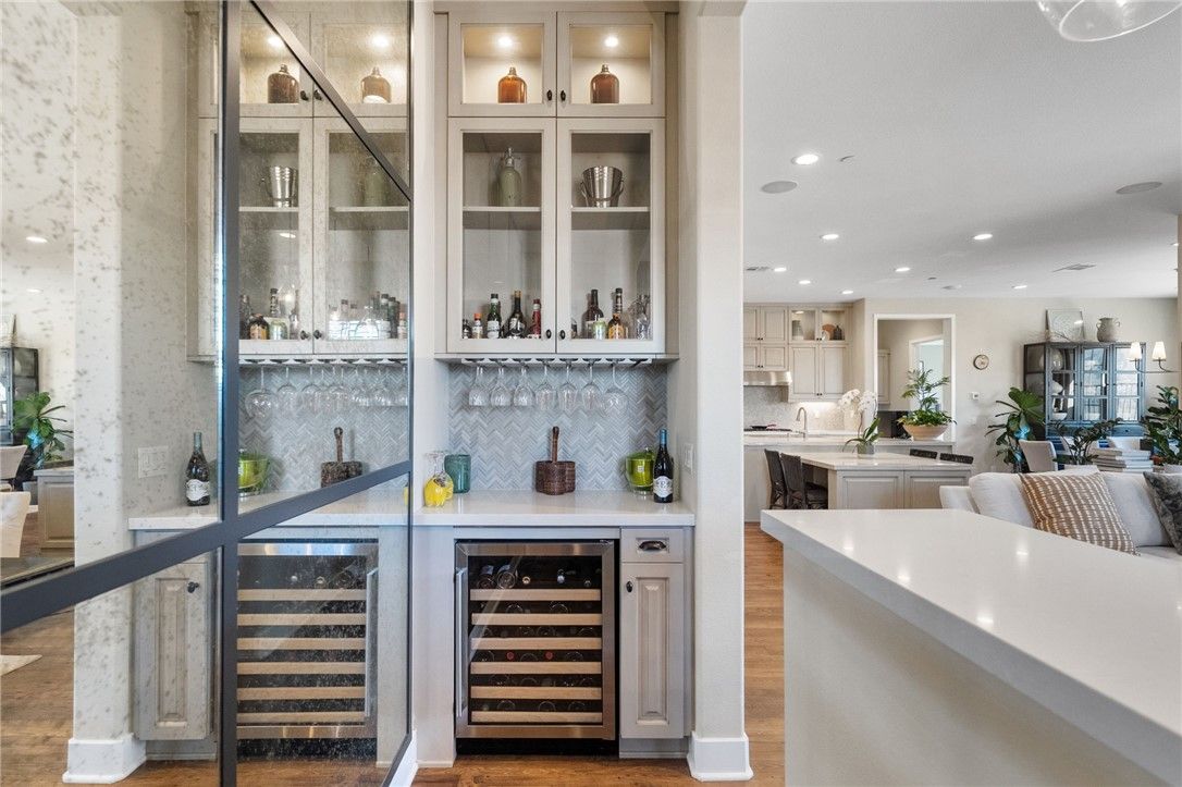 - Bar, Built-in Features, Ceiling Fan(s), Crown Molding, High Ceilings, Pantry, Quartz Countertops, Paneling/Wainscoting, Wet Bar, Wired for Data, Wired for Sound, All Bedrooms on Lower Level, Formal Entry, Kitchen, Laundry Facility, Living Room, Bedroom on Main Level, Main Level Primary, Primary Suite, Home Office, Walk-In Closet(s), Butler Pantry