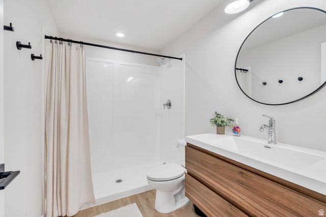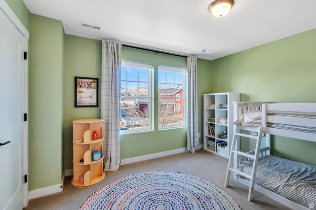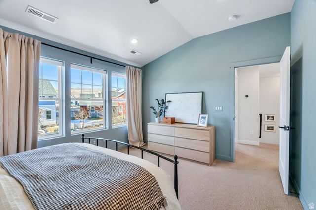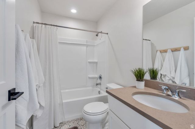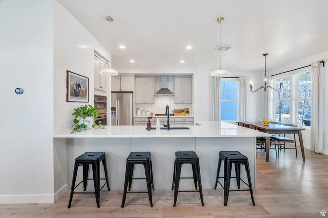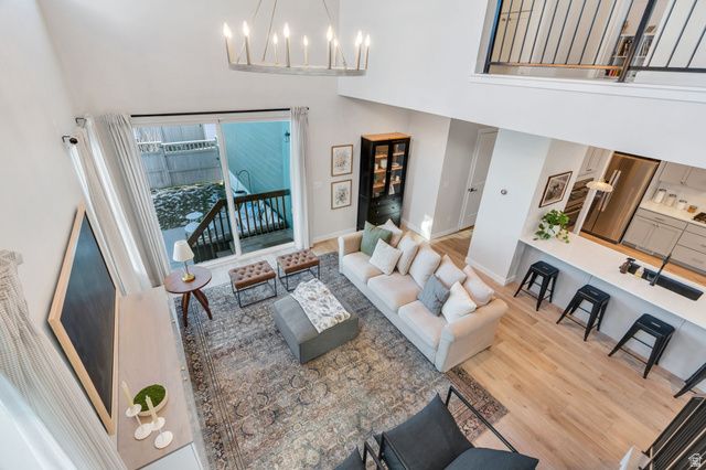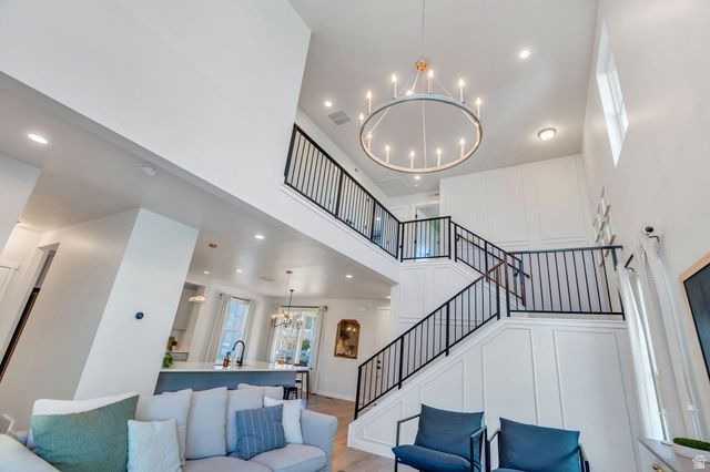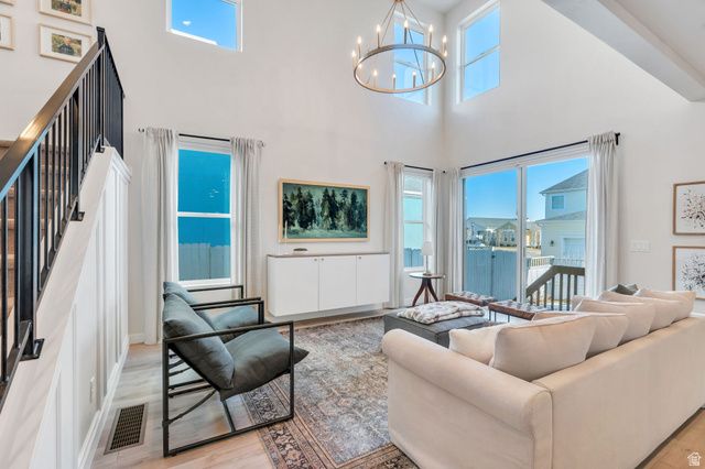 This beautiful Daybreak home is filled with abundant natural light via 2-story windows! The living room features soaring vaulted ceilings and excellent entertainment space while the kitchen includes a wraparound island, stainless steel appliances, a gas wall oven, chic lighting, and crisp white quartz countertops! Additionally, the great room accesses an inviting porch, ideal for hosting guests, BBQs and enjoying the large fully fenced yard. The primary suite is a true retreat, highlighted by a custom architectural feature wall and a spacious walk-in closet. The spa-inspired primary bath features a walk-in Euro shower, dual vanity with modern cabinetry and hardware, and quartz countertops. There are two additional spacious bedrooms upstairs and the basement includes a large family room and two additional bedrooms! Enjoy the unmatched Daybreak lifestyle with over 30 miles of walking and biking trails, and the convenience of being within walking distance to two neighborhood parks, offering soccer fields, pickleball courts, tennis courts, playgrounds and more! Schedule a showing and tour this exceptional home while it's available!