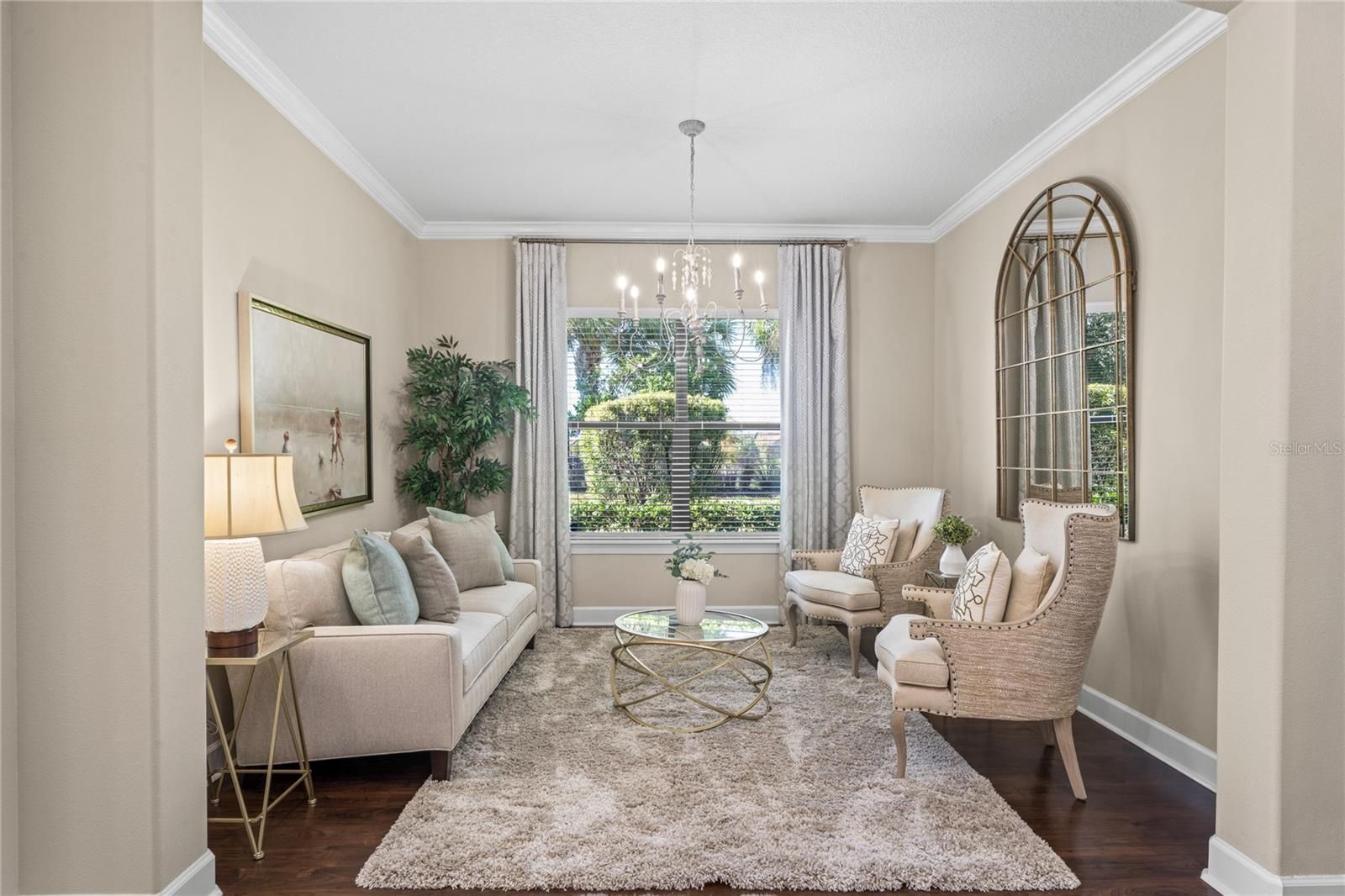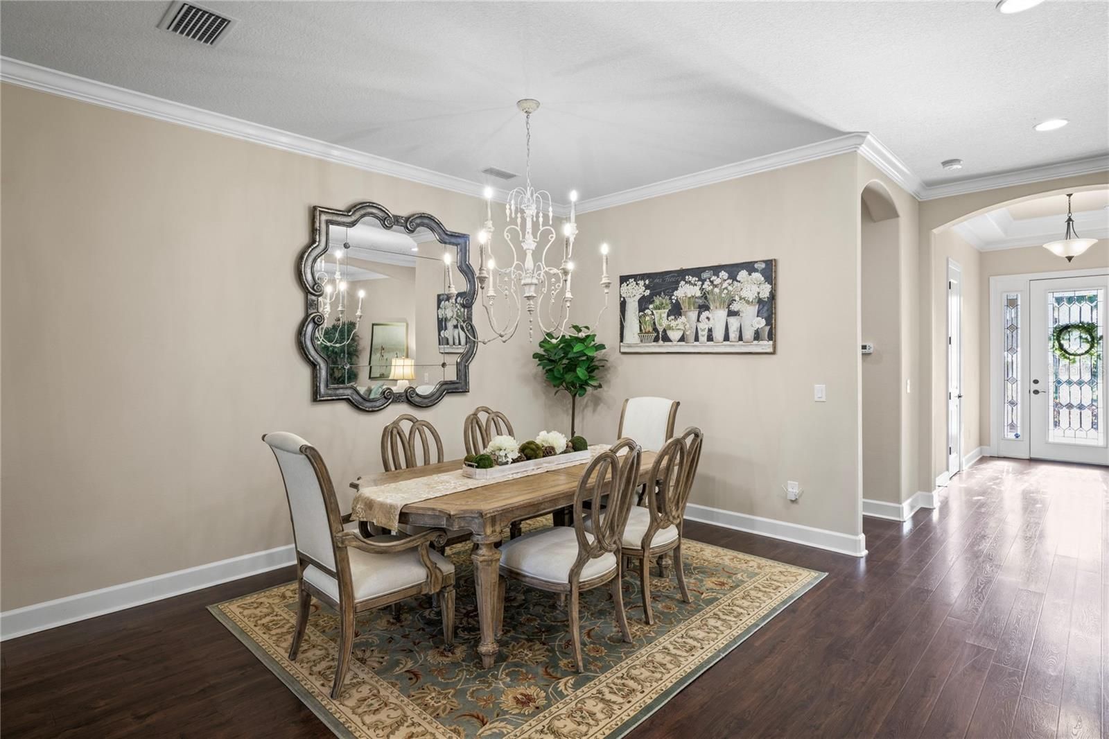 This beautiful house is worthy of being featured in a Southern Living magazine and ready to become your home. This pristine kept, lovingly maintained, and beautifully designed Taylor Morrison LAZIO on a corner lot, provides the perfect blend of comfort, elegance, and Southern Charm. With 3 BEDROOMS, 3 BATHROOMS, a versatile DEN/OFFICE SPACE, and spacious 2-car garage, this home is a standout in both design and livability. The open-concept layout is accentuated by ENGINEERED WOOD FLOORING and NEUTRAL TONES THROUGHOUT. The GOURMET KITCHEN has GRANITE COUNTER-TOPS, VEGGIE SINK, CAFE HIGH-END GAS APPLIANCES (with the OPTION for ELECTRIC), AMPLE CABINET SPACE, and a spacious 10 ft. KITCHEN ISLAND with KNEE WALL CABINETS for additional kitchen storage. Adjacently, the living room and dining space along with the COVERED, SCREEN-ENCLOSED LANAI, make for an ideal spacious and seamless entertaining when hosting your guests. The Lanai is decorated with STUNNING HURRICANE IMPACT FRENCH DOORS in both Living room and Kitchen entry from the outdoors. The OWNER'S PRIMARY SUITE is LUXURIOUS with BAY WINDOW, TRAY CEILING, EN-SUITE BATH with 10 ft. WIDE WALK-IN SHOWER, and an EXPANSIVE WALK-IN CLOSET with CUSTOM BUILT-INS. A PRIVATE JUNIOR SUITE provides comfort for guests or multi-generational living. The additional bedroom and full bath are ideally situated for maximum privacy and convenience. A beautifully FINISHED LAUNDRY ROOM adds both function and style which include your durable CABINETRY FOR STORAGE, WASHER, DRYER, a DROP ZONE COUNTER SPACE, and UTILITY SINK. Enjoy the Florida lifestyle year-round from your COVERED LANAI, with a PRIVATE VIEW of your backyard surrounded by LUSH, TROPICAL Florida native LANDSCAPE. Entertain with ease using your NATURAL GAS OUTDOOR KITCHEN, complete with sink—perfect for weekend gatherings and sunset dinners. The home is equipped with 8 FT DOORS, 10 FT CEILINGS, CROWN MOLDING, TRAY CEILINGS, PLANTATION SHUTTERS in FRONT BAY WINDOW, HURRICANE SHUTTERS, TANKLESS WATER HEATER, STORAGE SHELVING IN GARAGE, SECURITY SYSTEM, and a WHOLE-HOME WATER SOFTENER. The TILE ROOF and PAVER DRIVEWAY not only adds to the home’s curb appeal, but also long-term durability. This home also comes with a REDUCED CDD FEE as the current owner PAID OFF THE SERVICE FEE giving a $1,300 reduction making it $2,200 a year. As an Esplanade resident, your HOA dues COVER ALL COMMUNITY AMENITIES, including clubhouse access, FITNESS/GYM CENTER, walking trails, HEATED POOLS AND SPA, FIREPIT, PICKLEBALL, TENNIS, and SHUFFLEBOARD COURTS, on-site manager, planned year-round community events, and so much more—along with COMPREHENSIVE LAWN MAINTENANCE, ensuring low-maintenance living. Plus, enjoy full access to all Starkey Ranch amenities including parks, pools, community garden, and recreational facilities. This home combines refined design with everyday practicality—ideal for those who appreciate thoughtful upgrades, modern convenience, and a vibrant, amenity-rich neighborhood. The community is strategically located near major highways for swift commutes, shops, hospitals, local favorites, Famous Beaches, and much more. Whether you're looking to relax in style or entertain in elegance, this charmer delivers on every level. Don’t miss the opportunity to own one of Taylor Morrison’s most beloved floor plans in one of the most desirable communities in the area. Schedule your private showing today and experience firsthand the exceptional lifestyle that awaits!